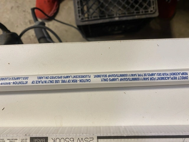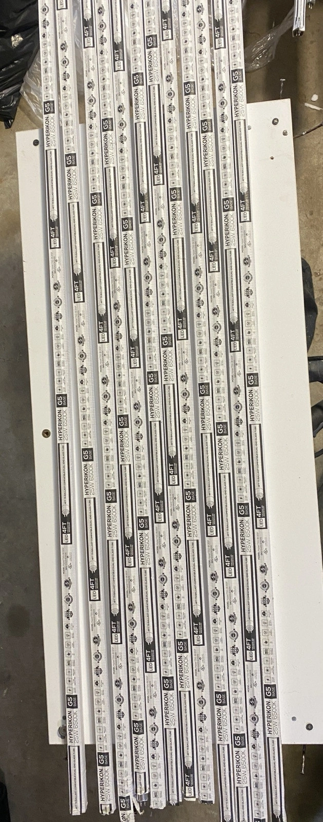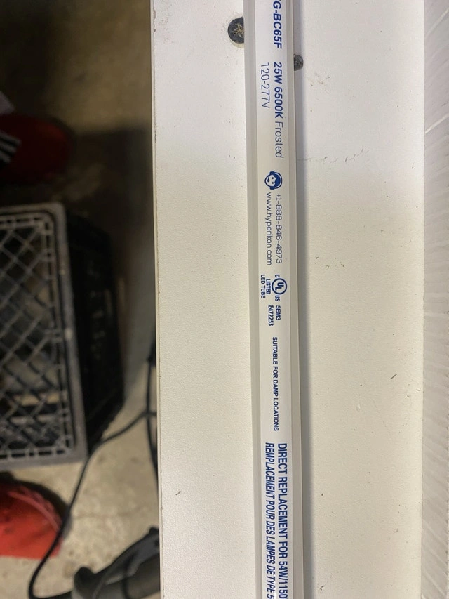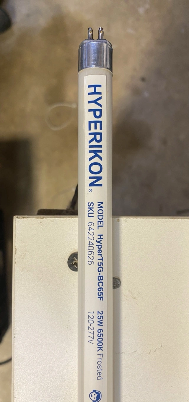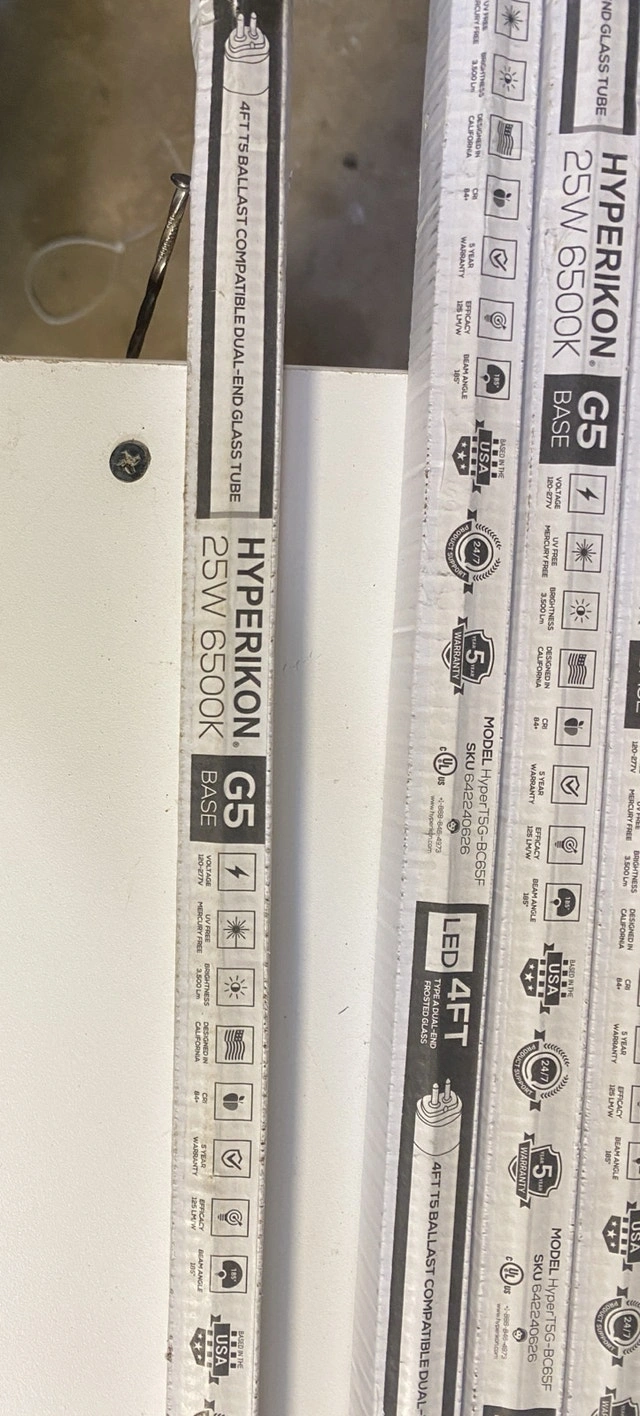 Selling 12 packs HYPERIKON HyperT5G-BC65F LED tube. 25W, 6500K frosted tube, suitable for damp locations. Direct replacement for 54W/1150mm/T5/G5/HF lamps specified on the label.