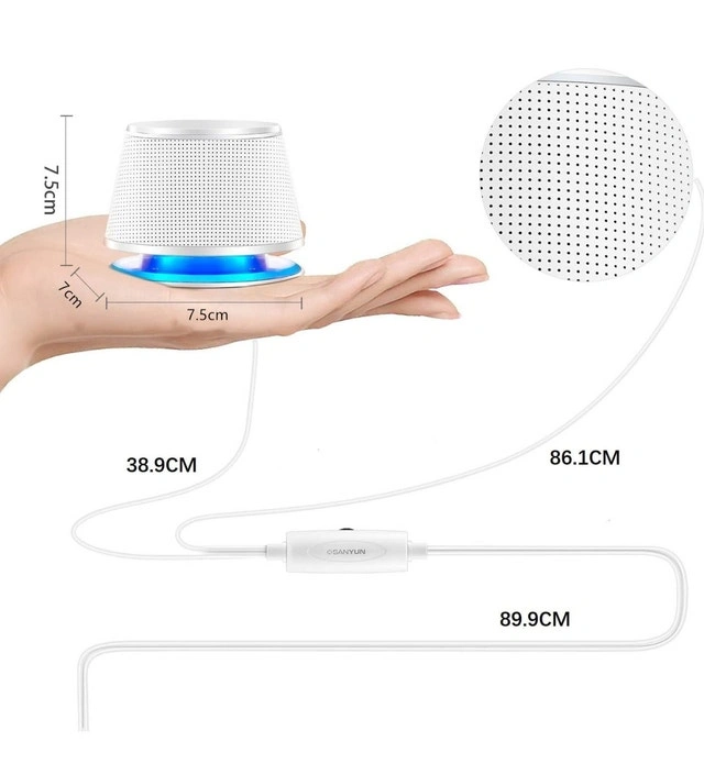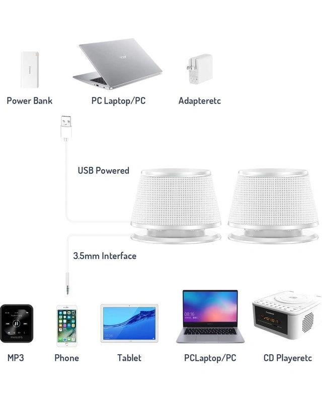 Simple elliptical design – Metal + high-quality plastic; stable, low-vibration; black/silver with blue ring; compact size (3.94 × 2.76 × 2.95 in); 5W × 2 power. Superb sound quality – Strong bass for small speakers; built-in bass diaphragm; closed cavity + low-frequency aid design; more powerful, penetrating sound 360° stereo sound – 2.0 channel; best effect when speakers are placed 1m apart and form an equilateral triangle with the listener. Wide compatibility – 3.5mm audio jack; works with most devices; USB-powered via computer or 5V charger. Plug & play – Just connect USB + 3.5mm; easy independent wire control; fills the room with music, movies, or games.