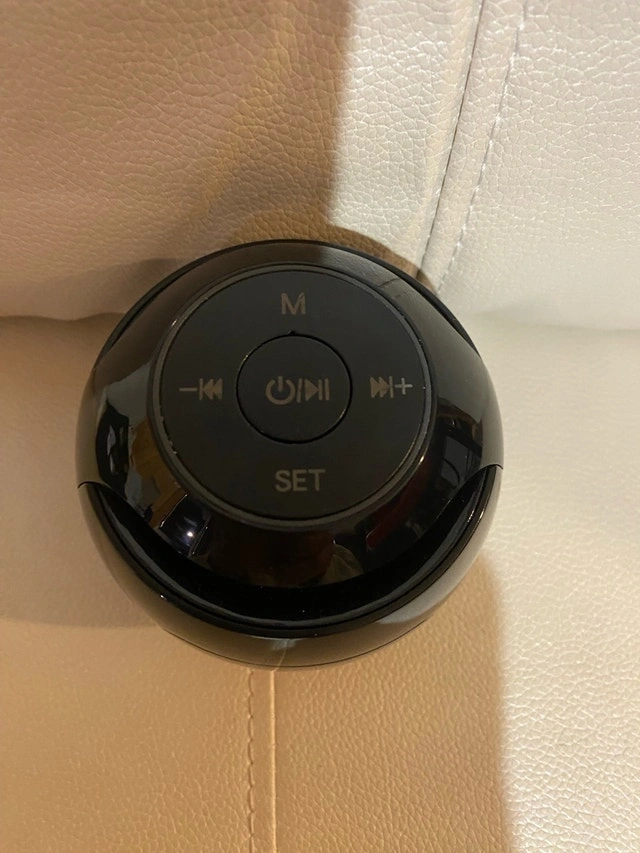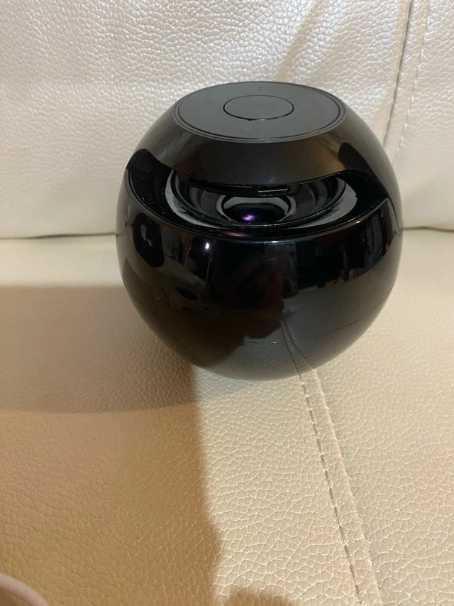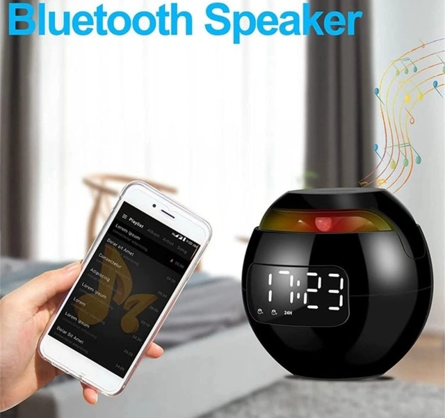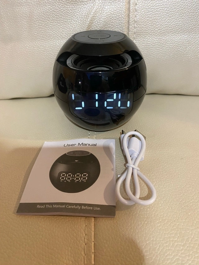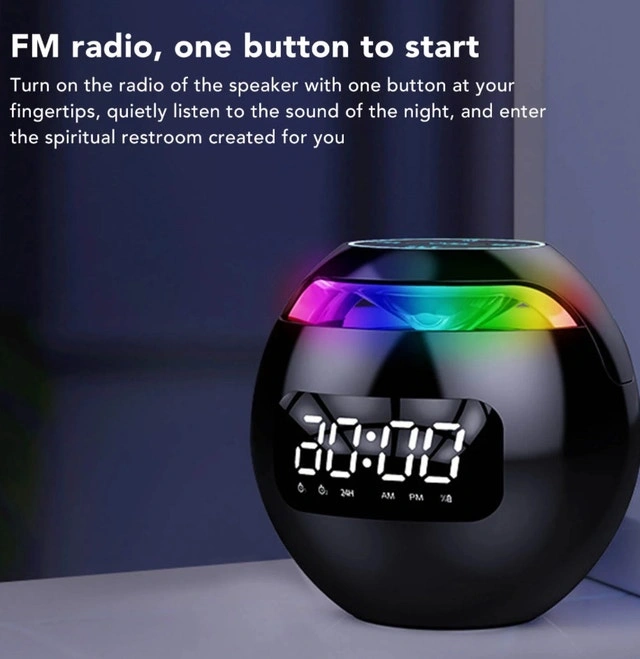 Sphere-shaped Bluetooth speaker. Features an FM radio, alarm clock, and colourful lights. Includes USB charging cable and user manual. Plays music from Bluetooth, TF card, or USB.