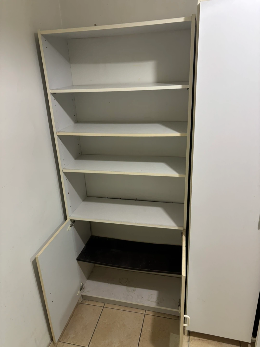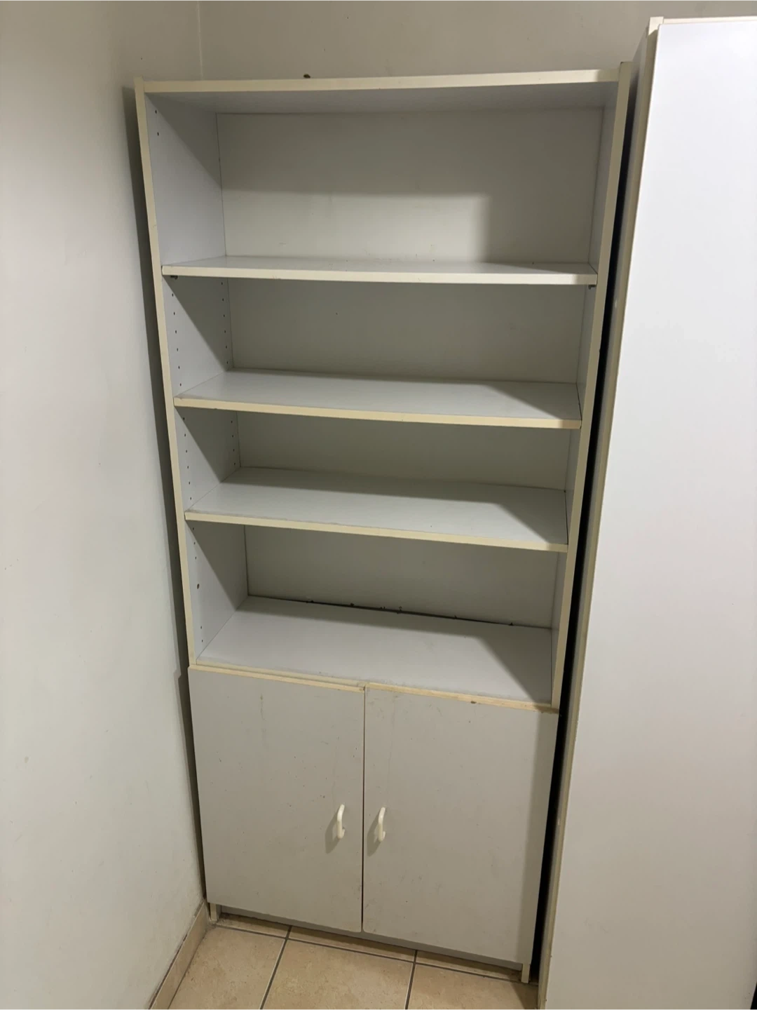 Selling a standing bookshelf in white. It has several shelves for storage and a cabinet at the bottom. Great for organizing books or displaying items!