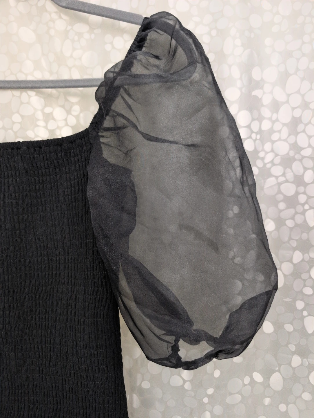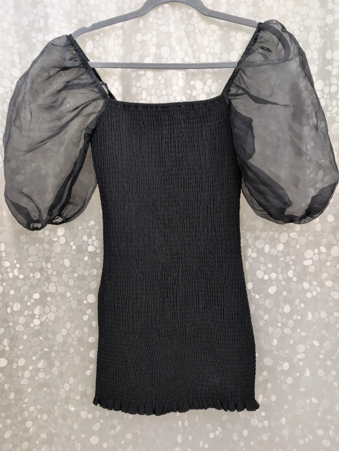 Selling a cute Forever 21 black mini dress! It features a square neckline and short, sheer sleeves. The dress is size small but stretchy material.