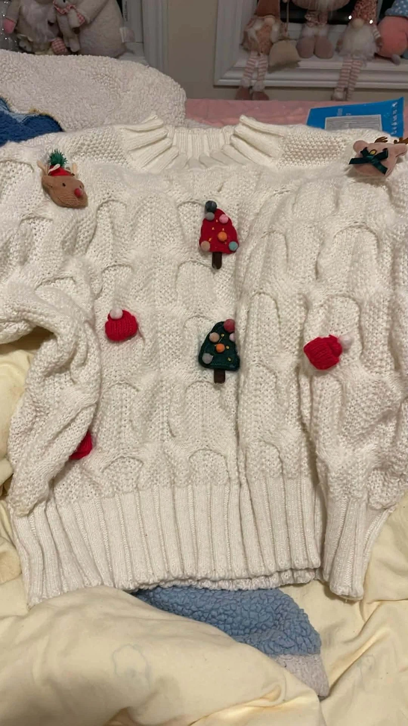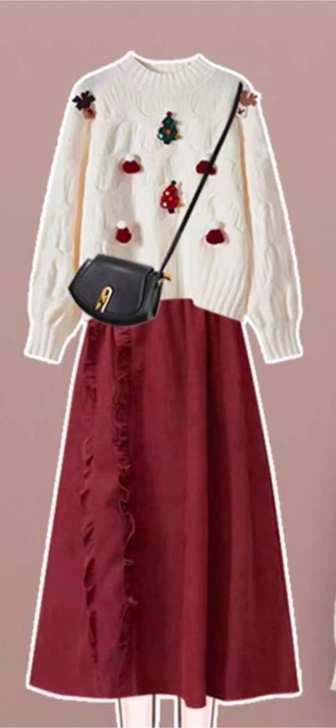 Selling a cute sweater and skirt set! The sweater is white with adorable Christmas-themed embellishments. The skirt is a lovely shade of red with a ruffled detail. Perfect for the holiday season or any festive occasion!
