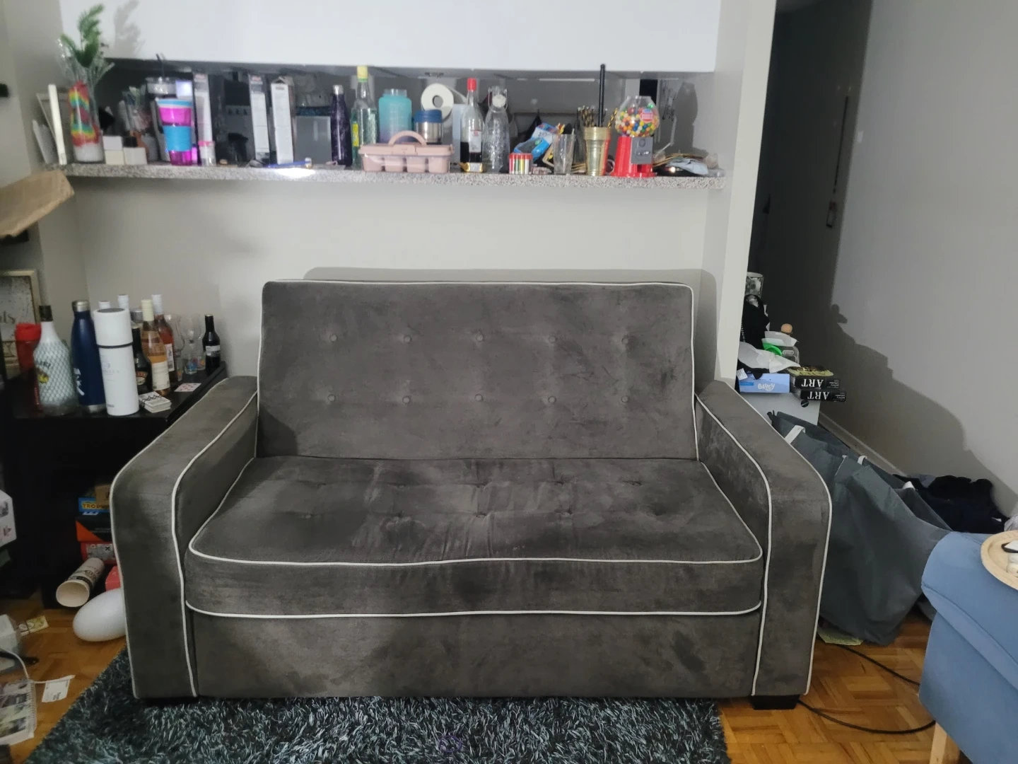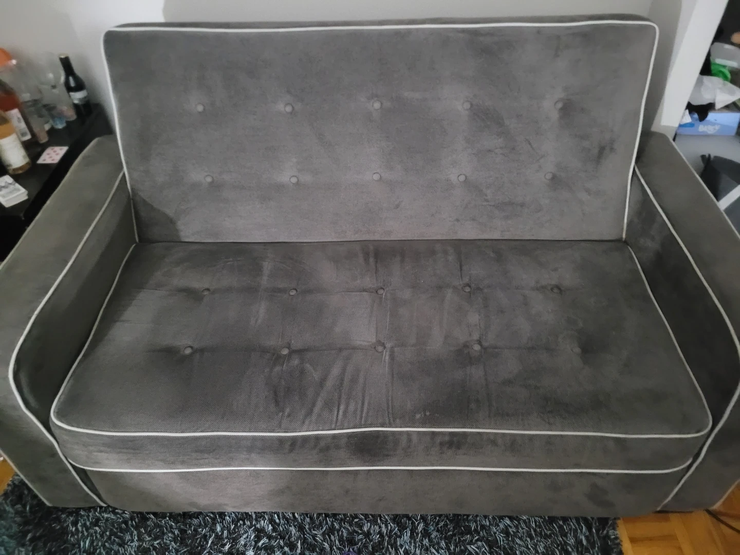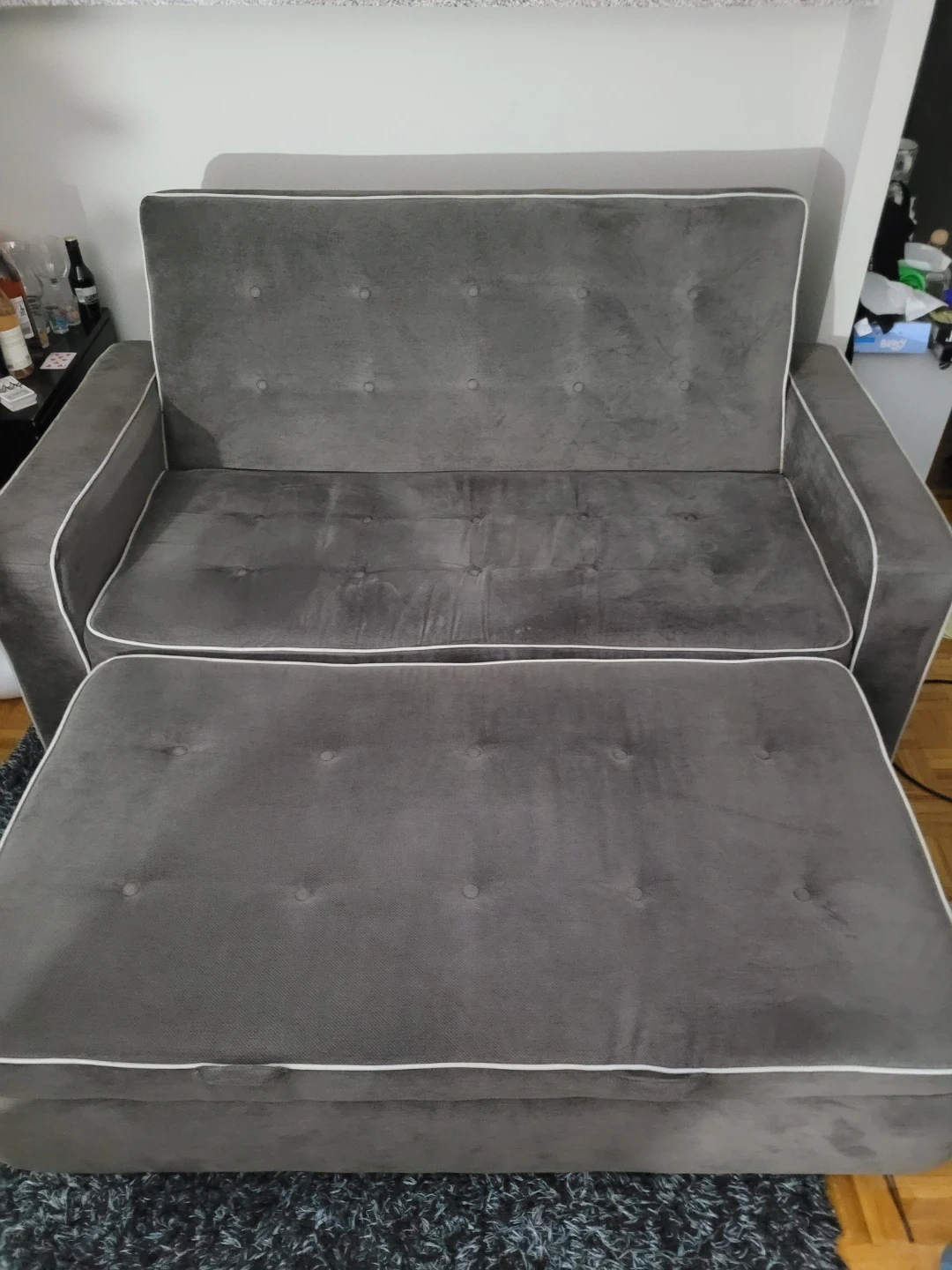 Selling a comfy grey sofa bed, perfect for guests or small spaces! It comes with a matching ottoman for extra lounging. The sofa is in good condition and ready for a new home.