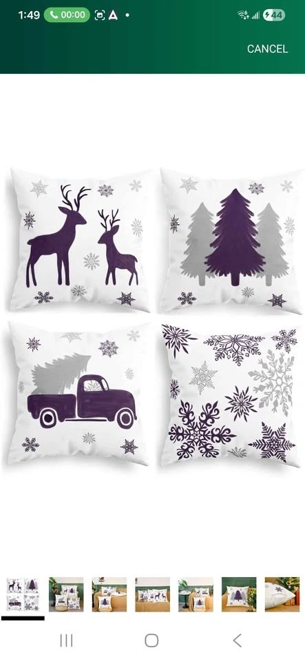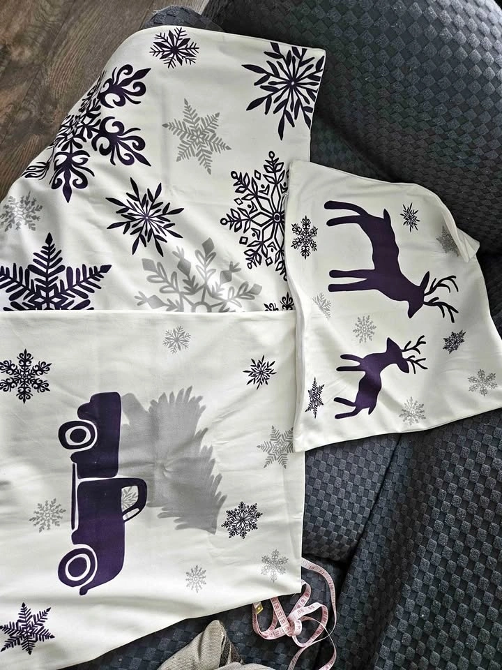 Brand new set of 3 cozy fleece throw pillow covers with tree, deer, car, and snowflake designs. Cushion cases for couch, bed, sofa, or farmhouse decoration. 16 X 16 inches, deep purple.