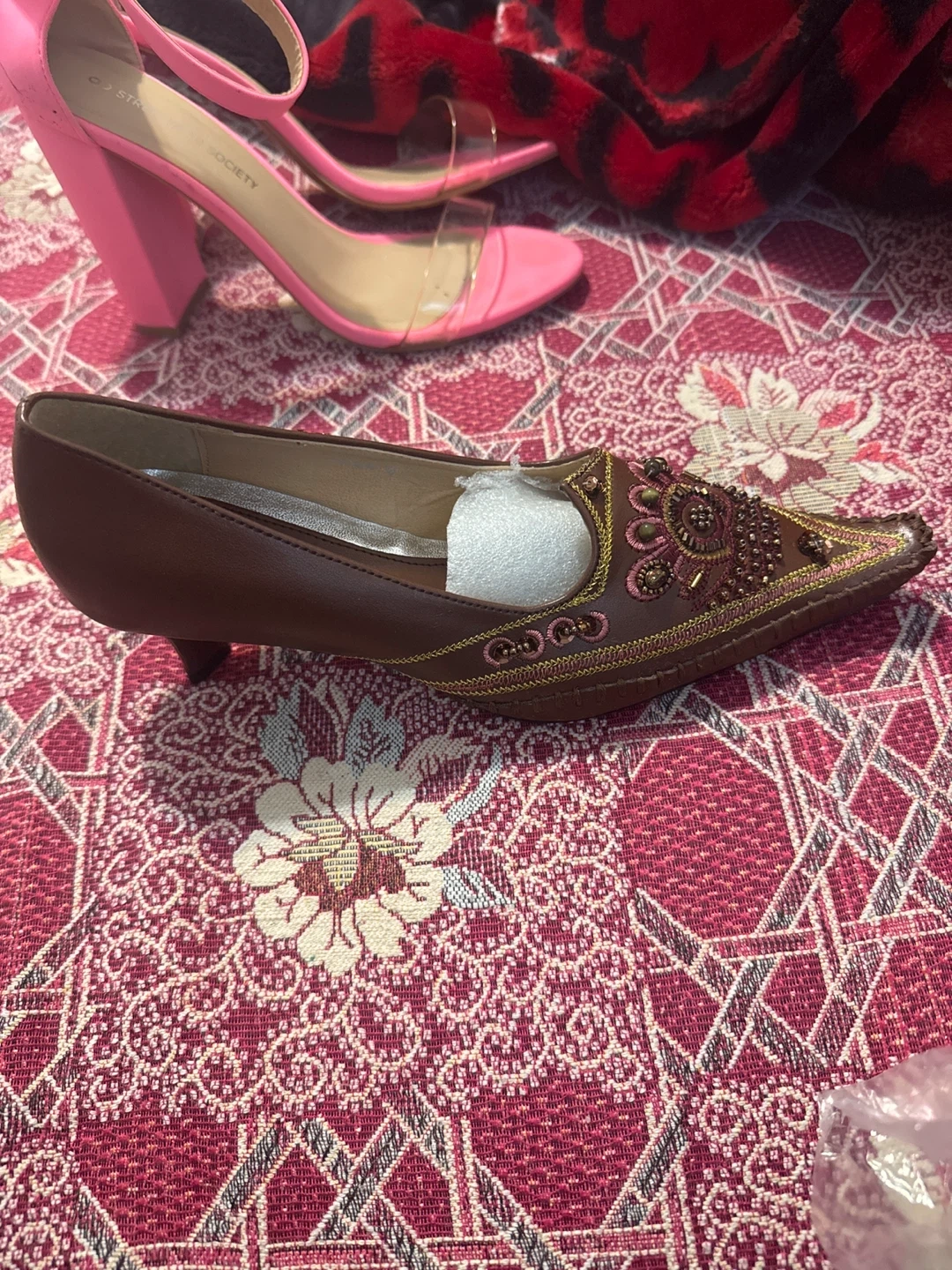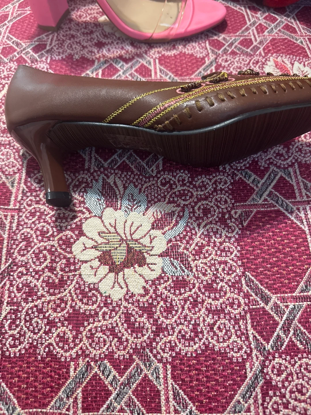 These brown kitten heel shoes have beautiful embellishments and are in great condition! They're a size 6, perfect for adding a touch of elegance to any outfit