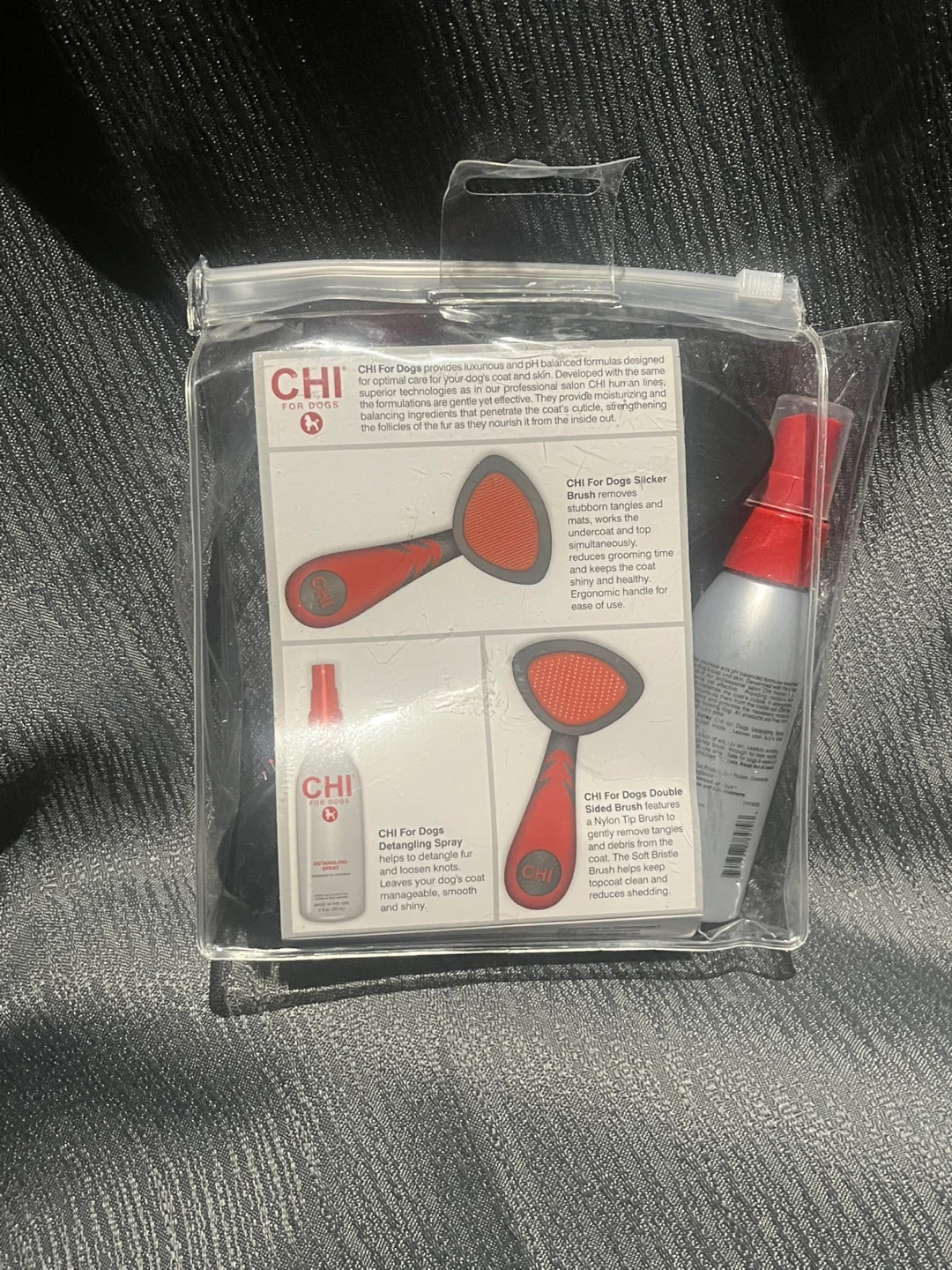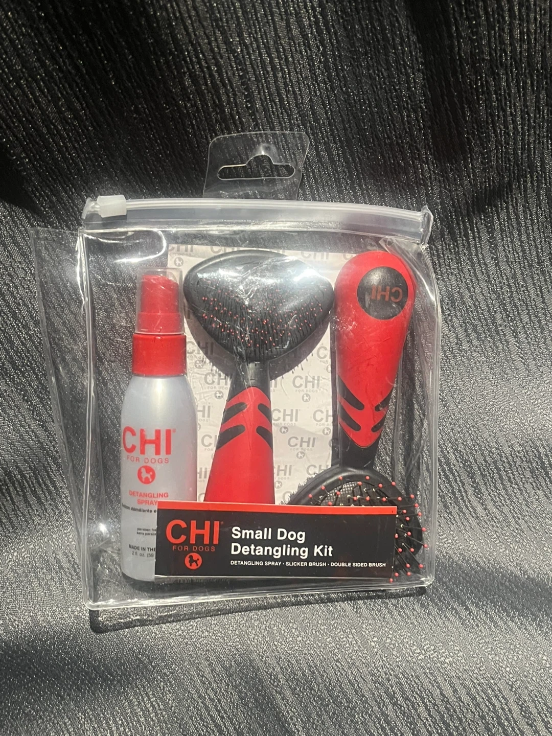 I'm selling a brand new CHI Small Dog Detangling Kit! It includes detangling spray, a slicker brush, and a double-sided brush, all designed for your dog's coat and skin. The kit comes in its original packaging