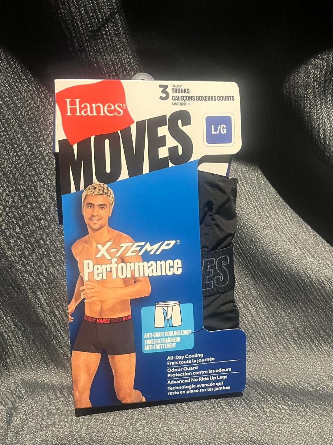 Selling a brand new pack of Hanes Moves men's trunks, size L/G. These are still in the original packaging and feature X-Temp Performance fabric for quick-dry and 4-way stretch. The waistband is designed to wick away moisture, keeping you comfortable all day long. They also have anti-chafe cooling zones and advanced no-ride-up legs!
