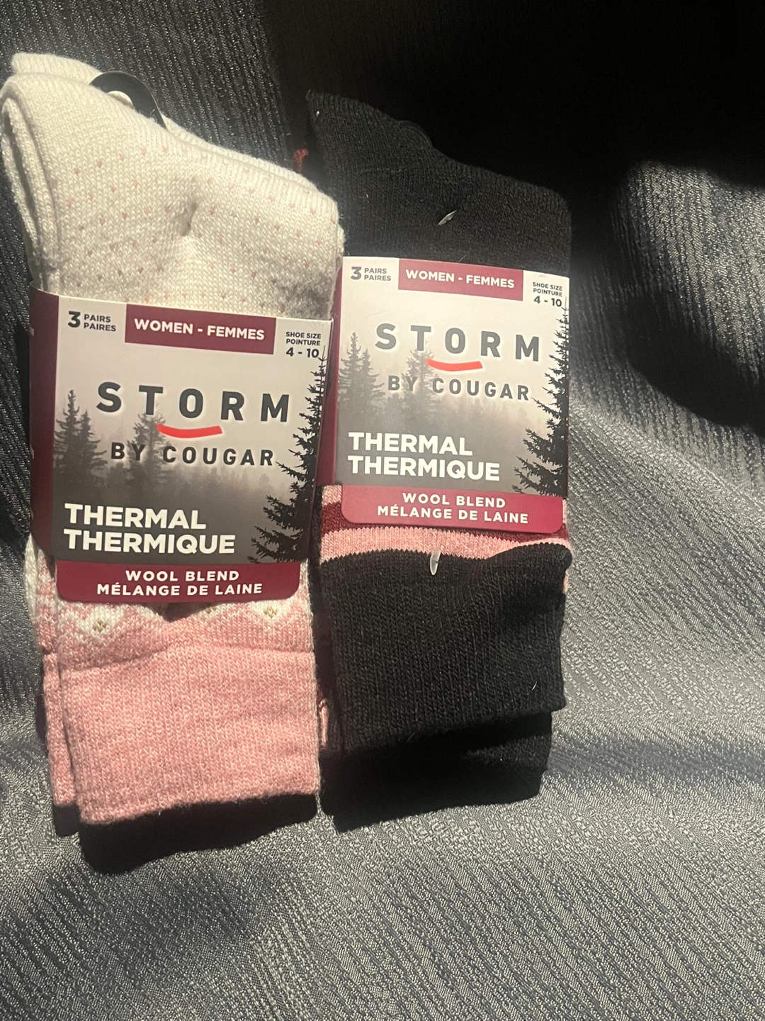 Selling two 3-packs of Storm by Cougar thermal socks! These wool blend socks are perfect for keeping your feet warm and cozy. They fit shoe sizes 4-10 for women.