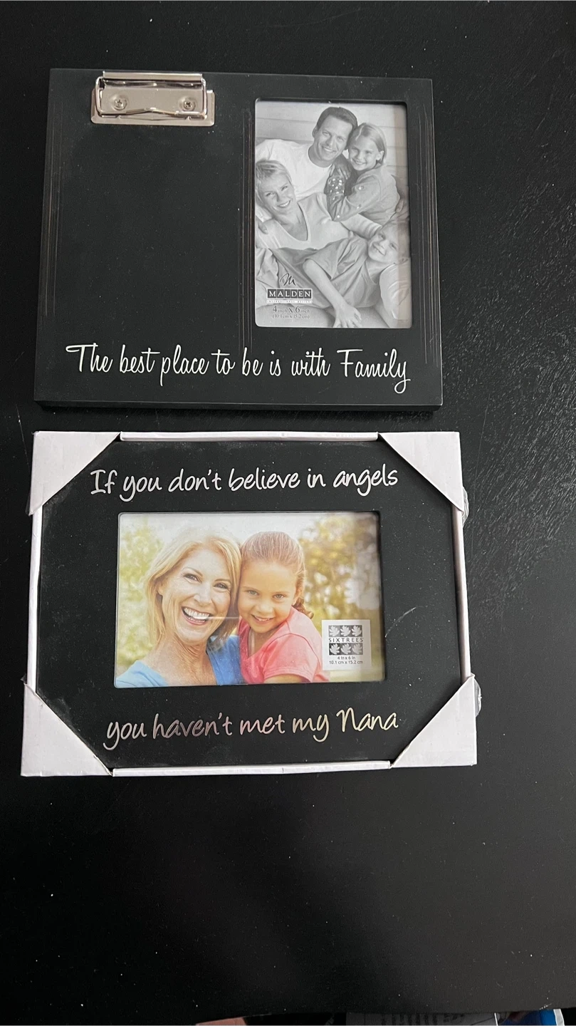 Two picture frames for sale! One is a Malden frame that says, "The best place to be is with family." The other is a Sixtrees frame that says, "If you don't believe in angels you haven't met my Nana."