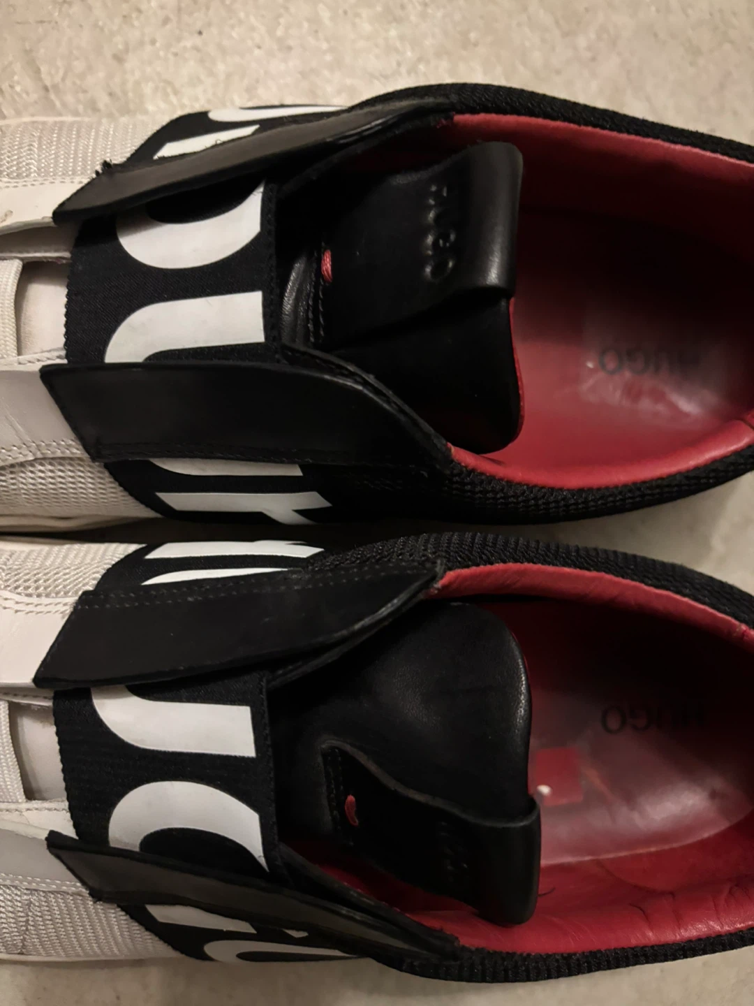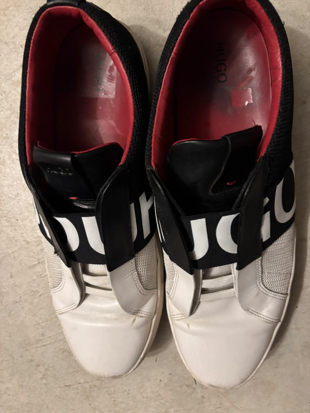 Selling a pair of Hugo slip-on sneakers! They're black and white with a sporty look. They're in used condition.