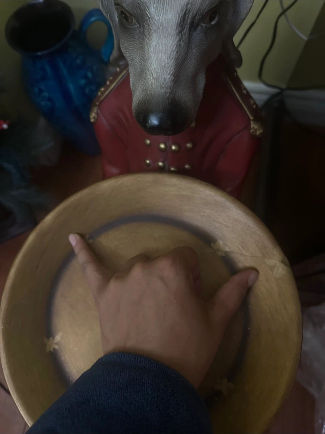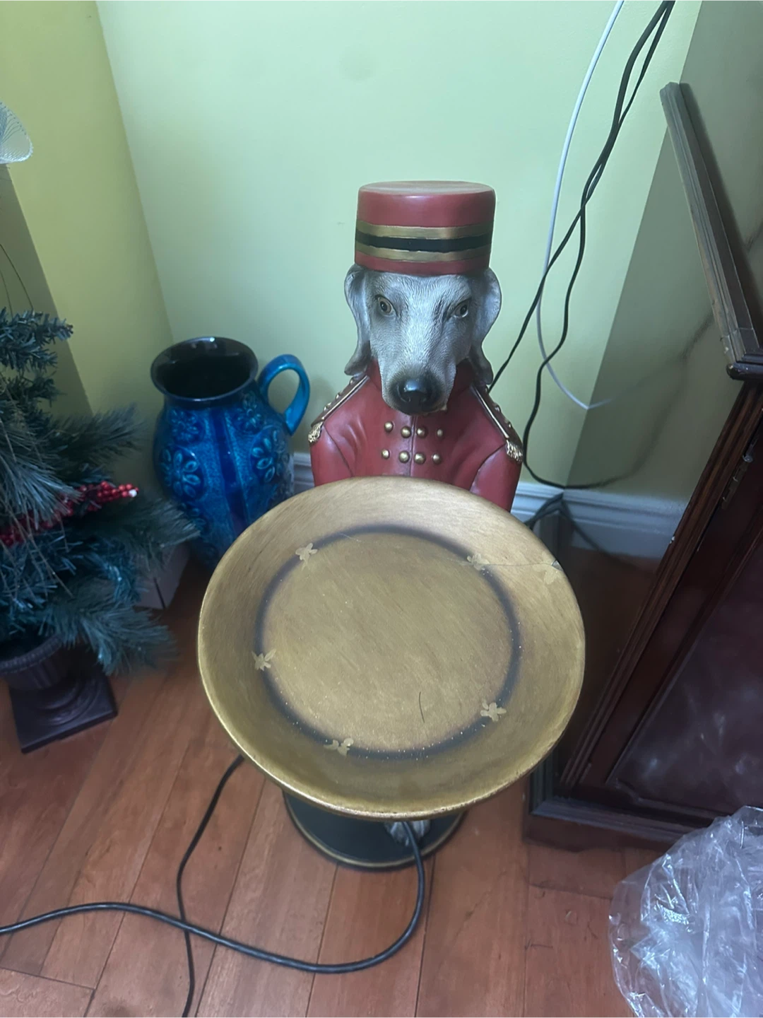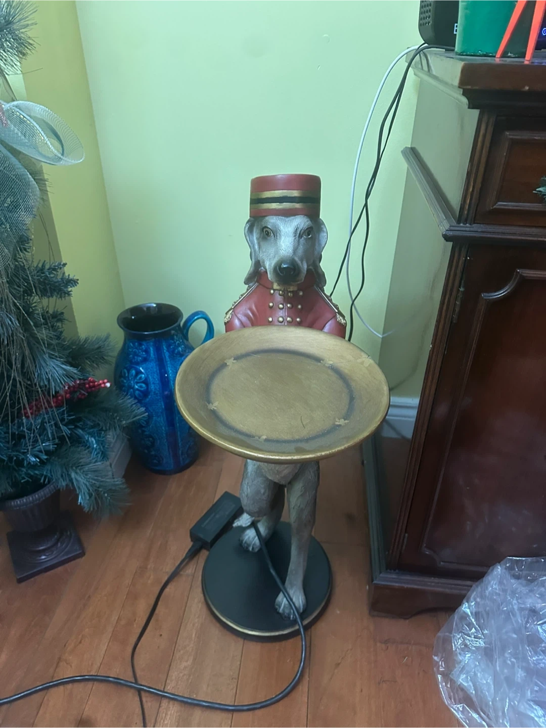 This is a unique dog butler accent table. It's a fun and quirky piece to add to your home decor. It features a dog dressed as a butler holding a tray. Tray has a slight crack in it.