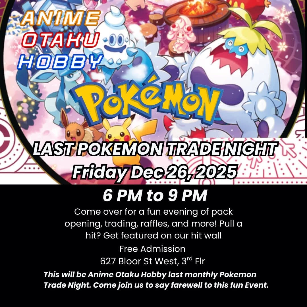 Pokemon Trade Night Last Trade night at 627 Bloor St West, Toronto. It's on Friday, December 26, 2025 from 6 PM to 9 PM. There will be pack opening, trading, raffles, and more! Free Admission
