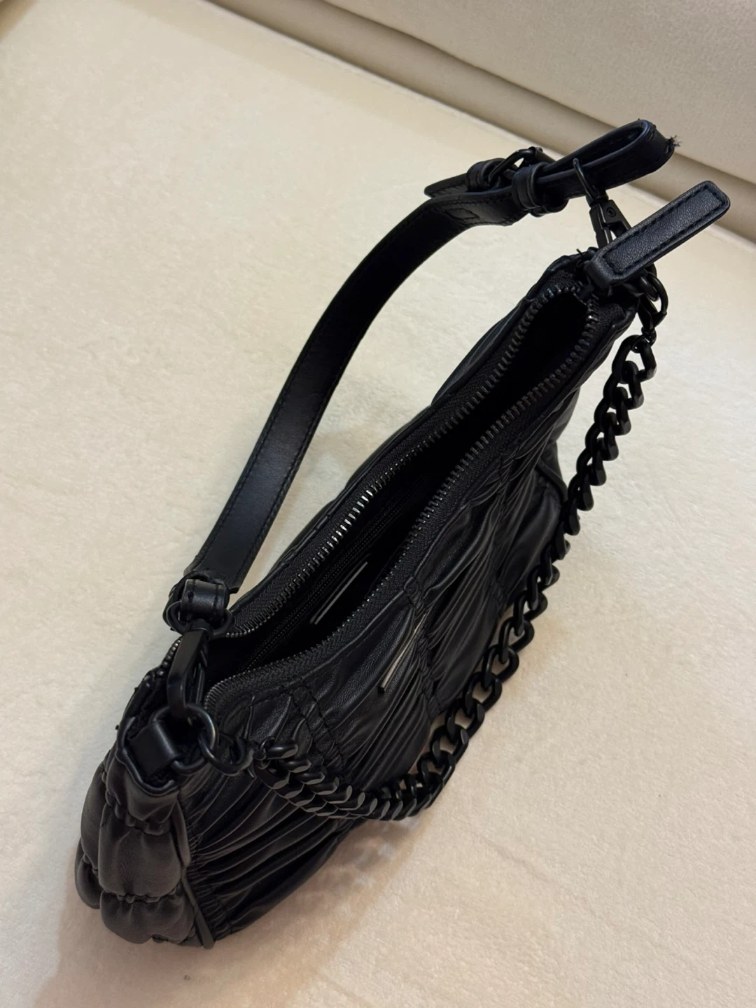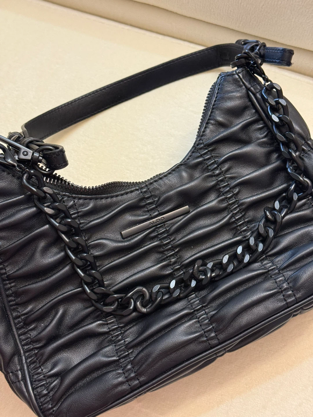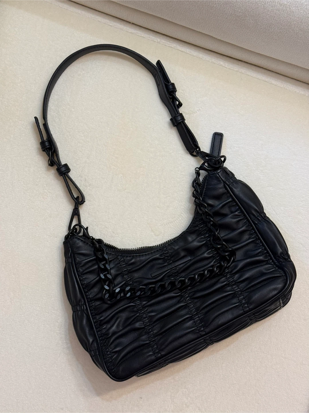 Selling a stylish black shoulder bag from ALDO! It's in great condition and features a unique ruched design and chain detailing. Perfect for adding a bit of edge to any outfit