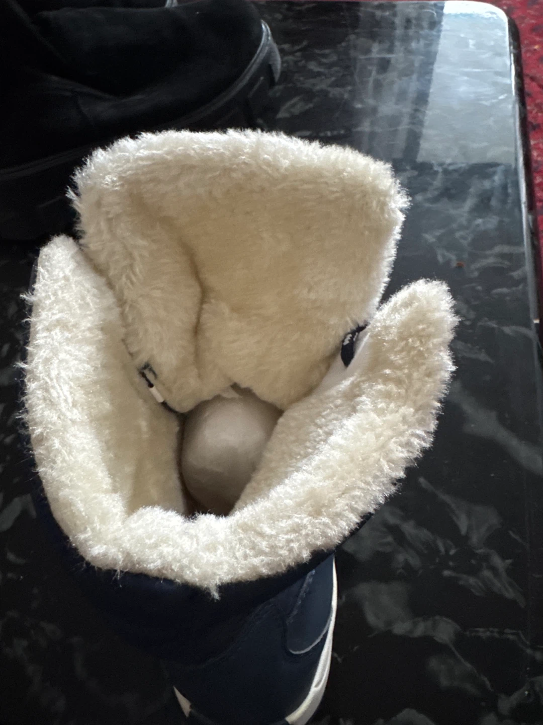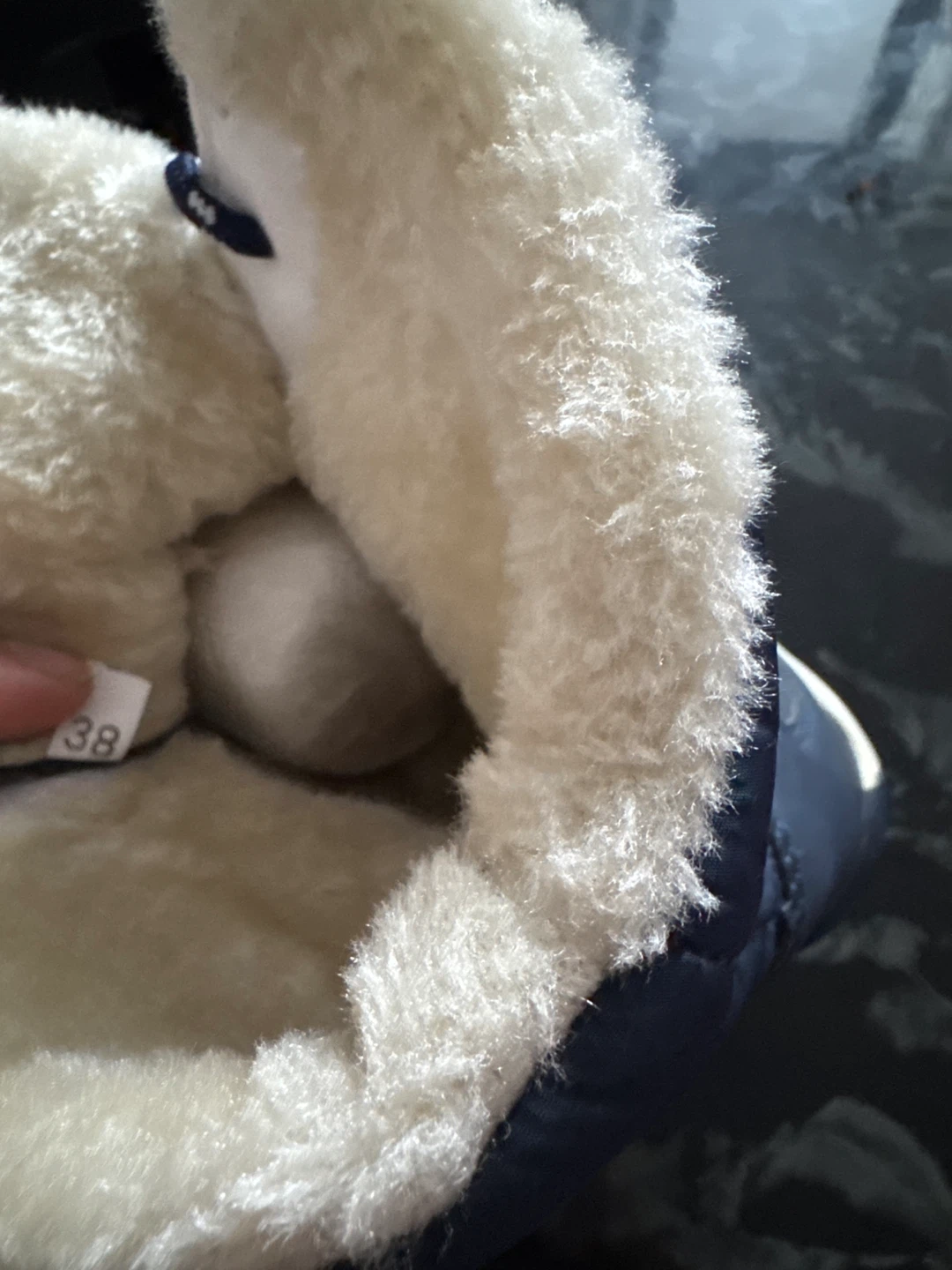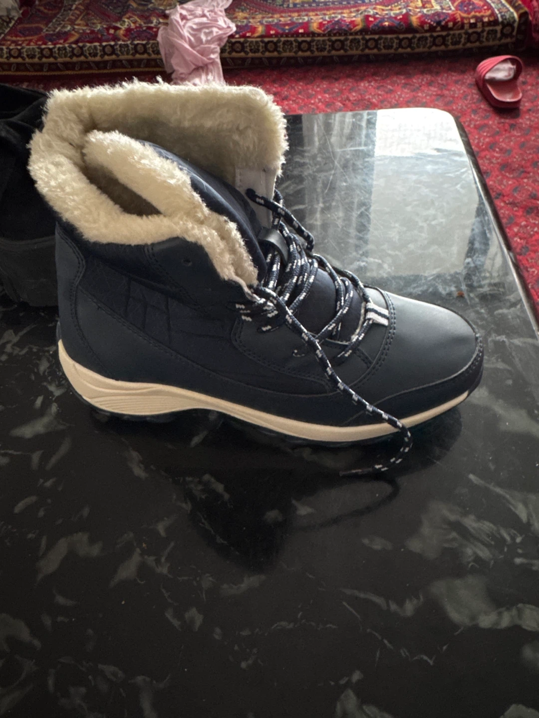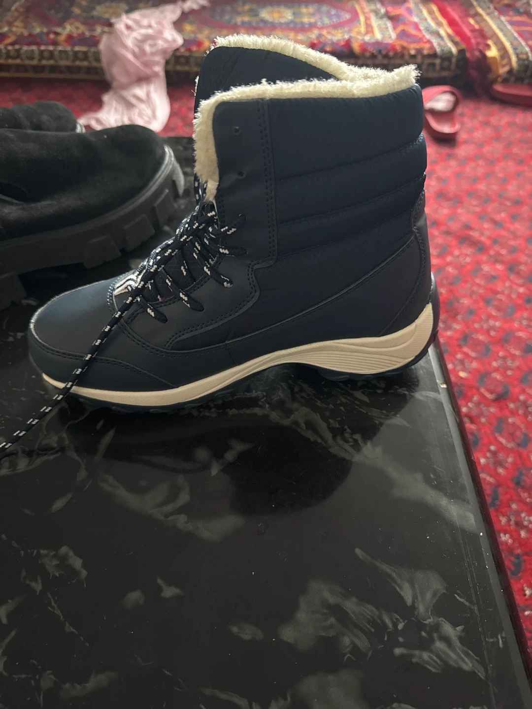 Cozy blue winter boots in EU size 38! They look like they'd be perfect for keeping your feet warm and dry during the cold months. They have a nice white faux fur lining, and a lace up design
