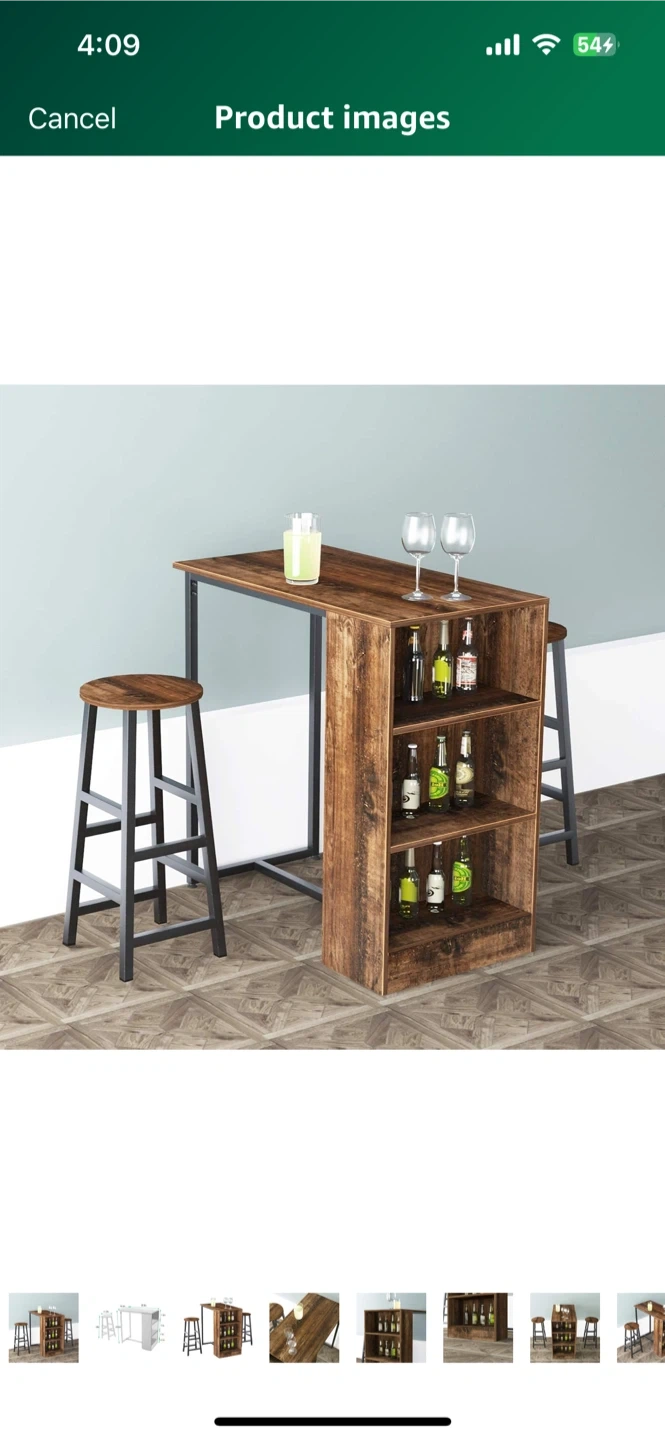 Selling a rustic brown bar table with two stools. The table features a built-in shelf for storing drinks or other items. The dimensions of the table are approximately 35.8 inches in length, 19.3 inches in width, and 35.8 inches in height. The stools are about 28 inches high with a diameter of 11.8 inches.