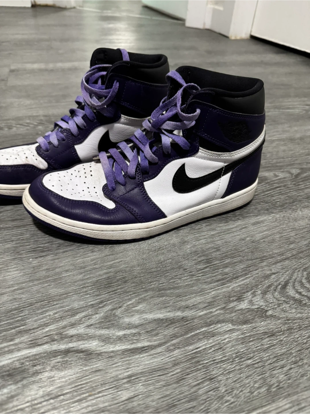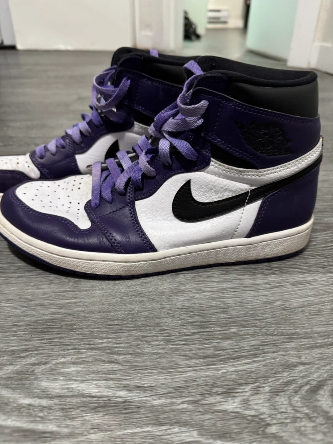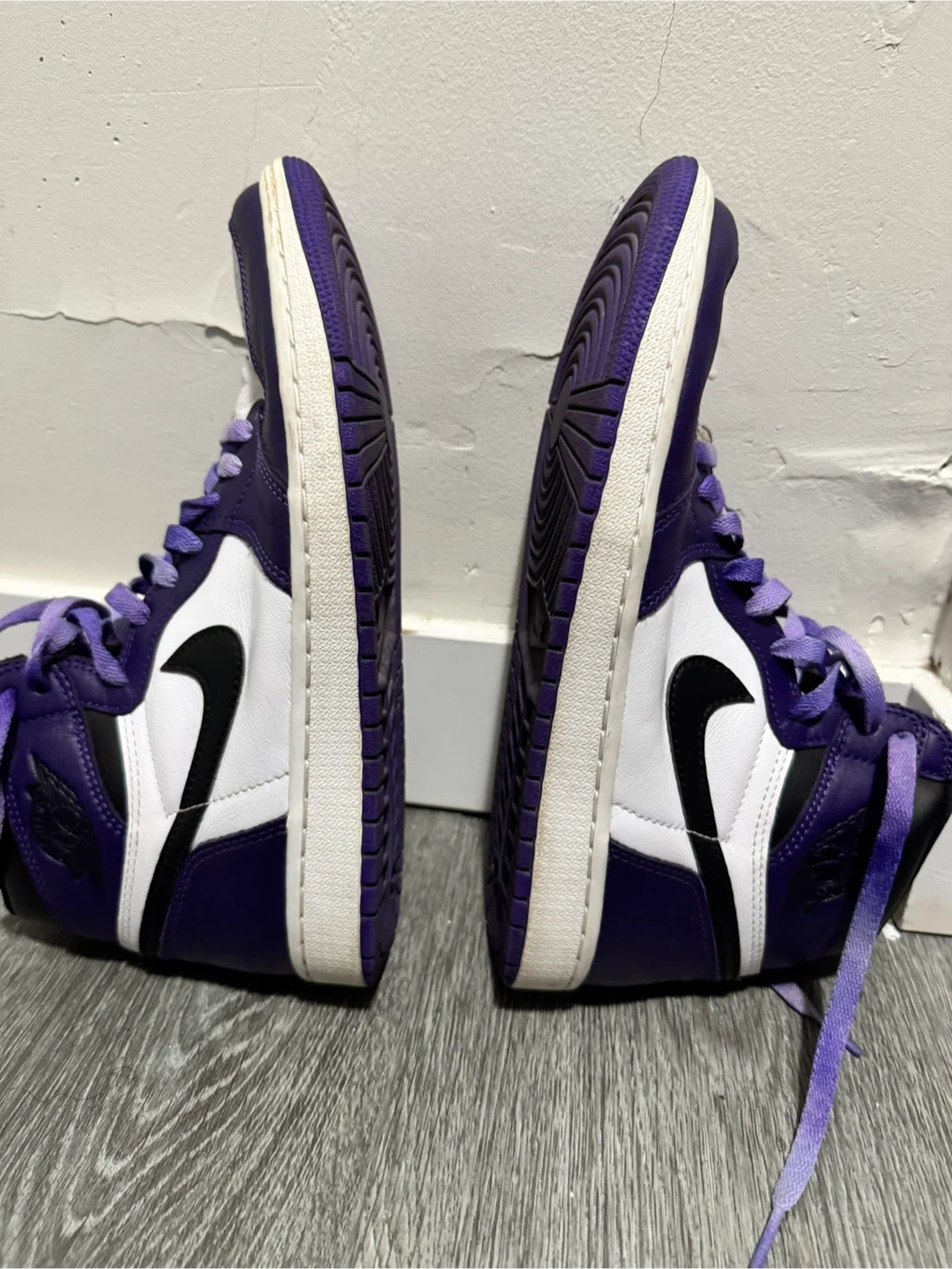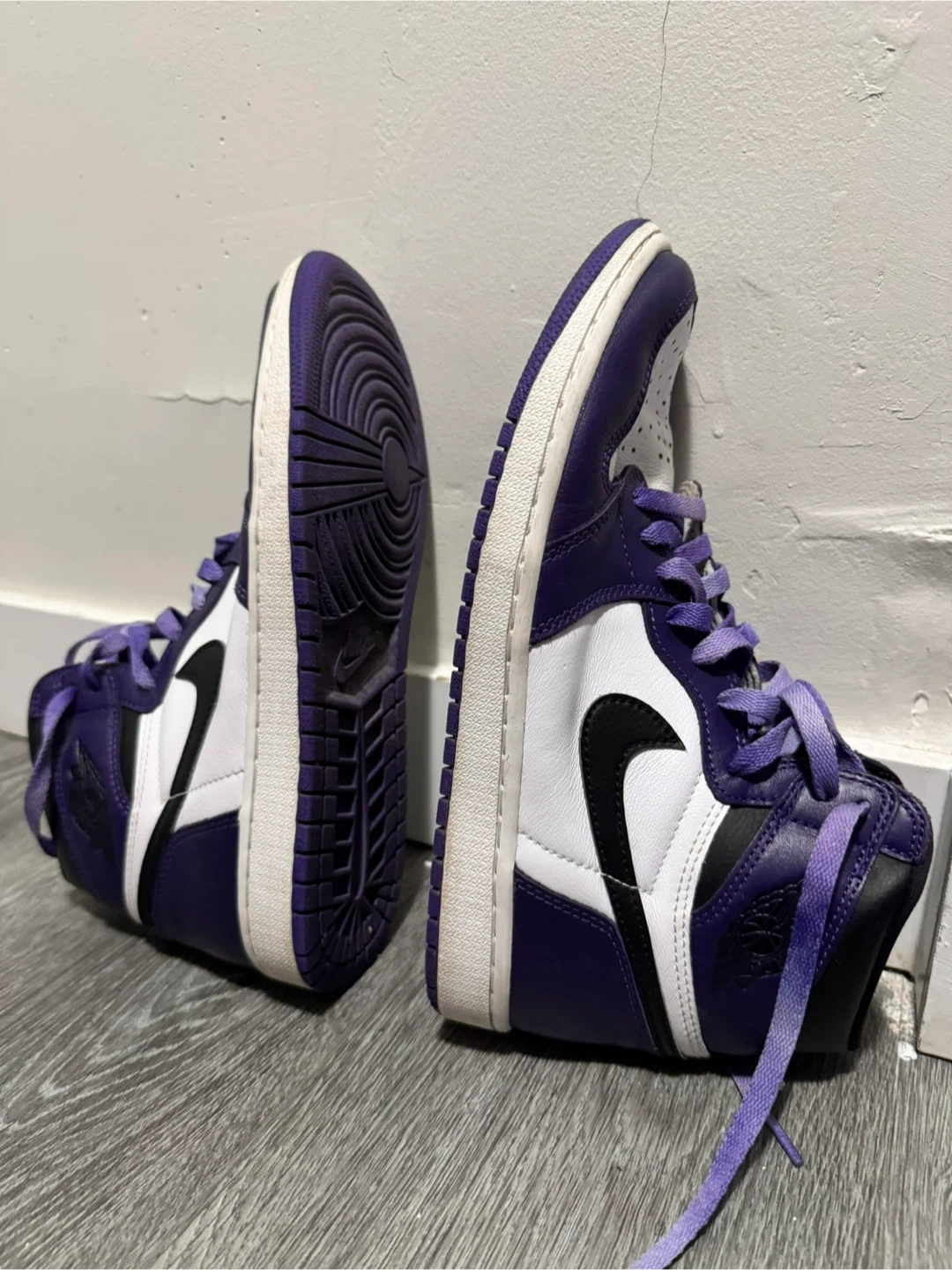 Selling a pair of Air Jordan 1 Retro High in Court Purple. These shoes have been worn and show some signs of wear, but still have plenty of life left! They're a classic style and a great addition to any sneaker collection.