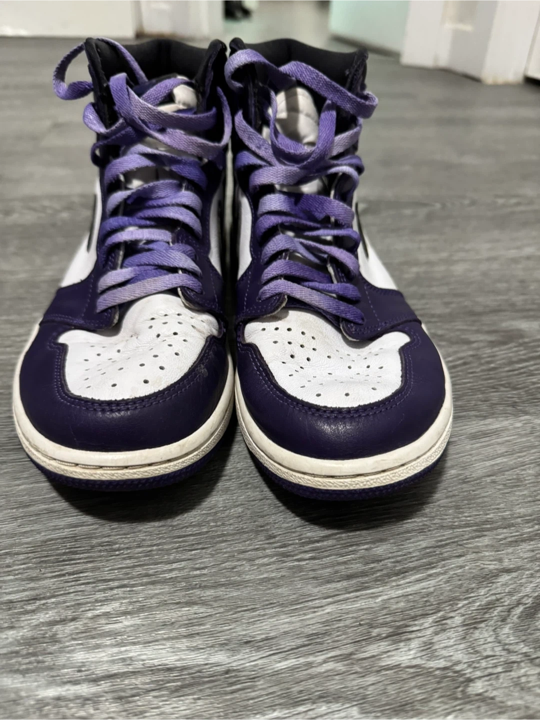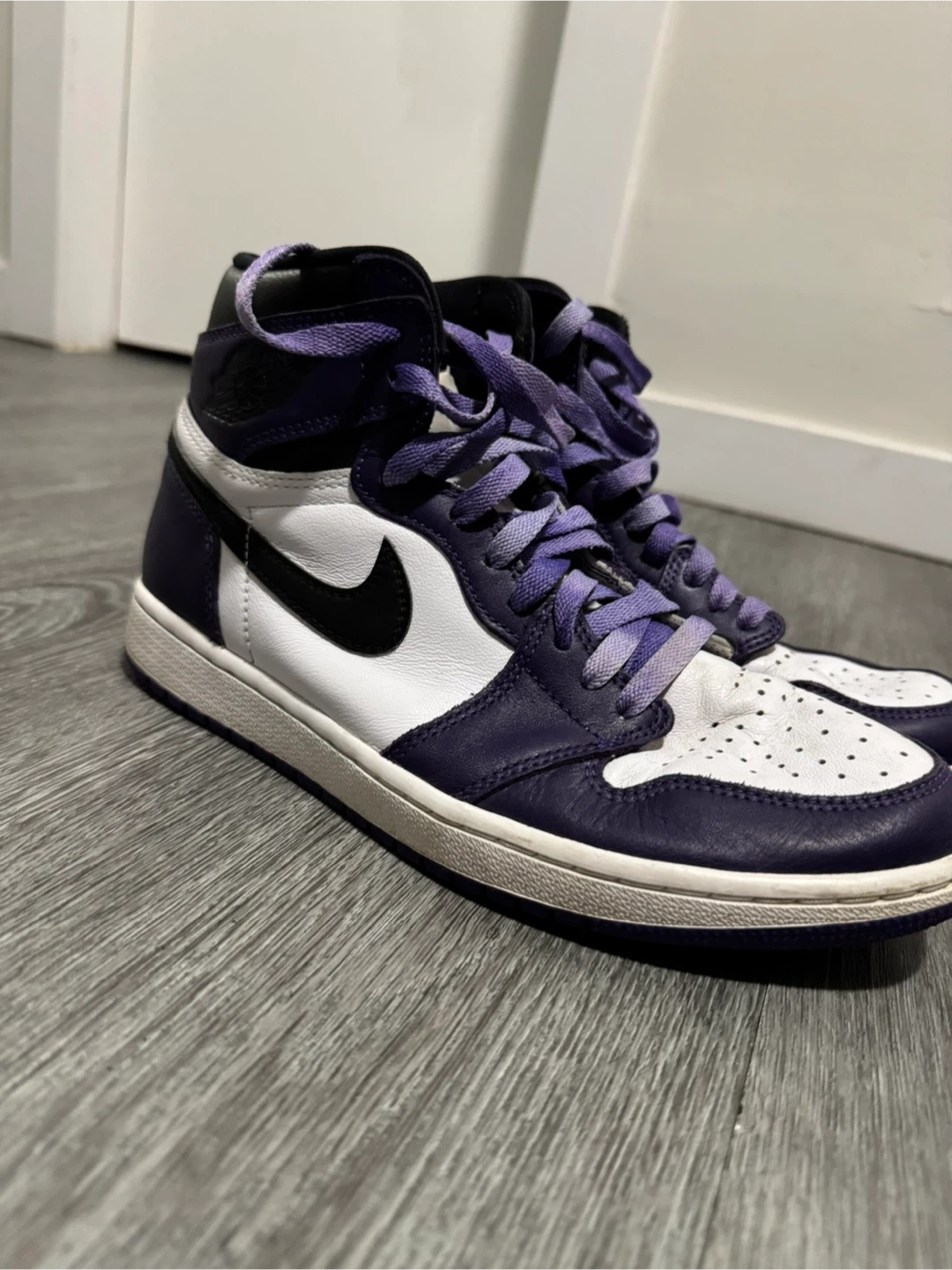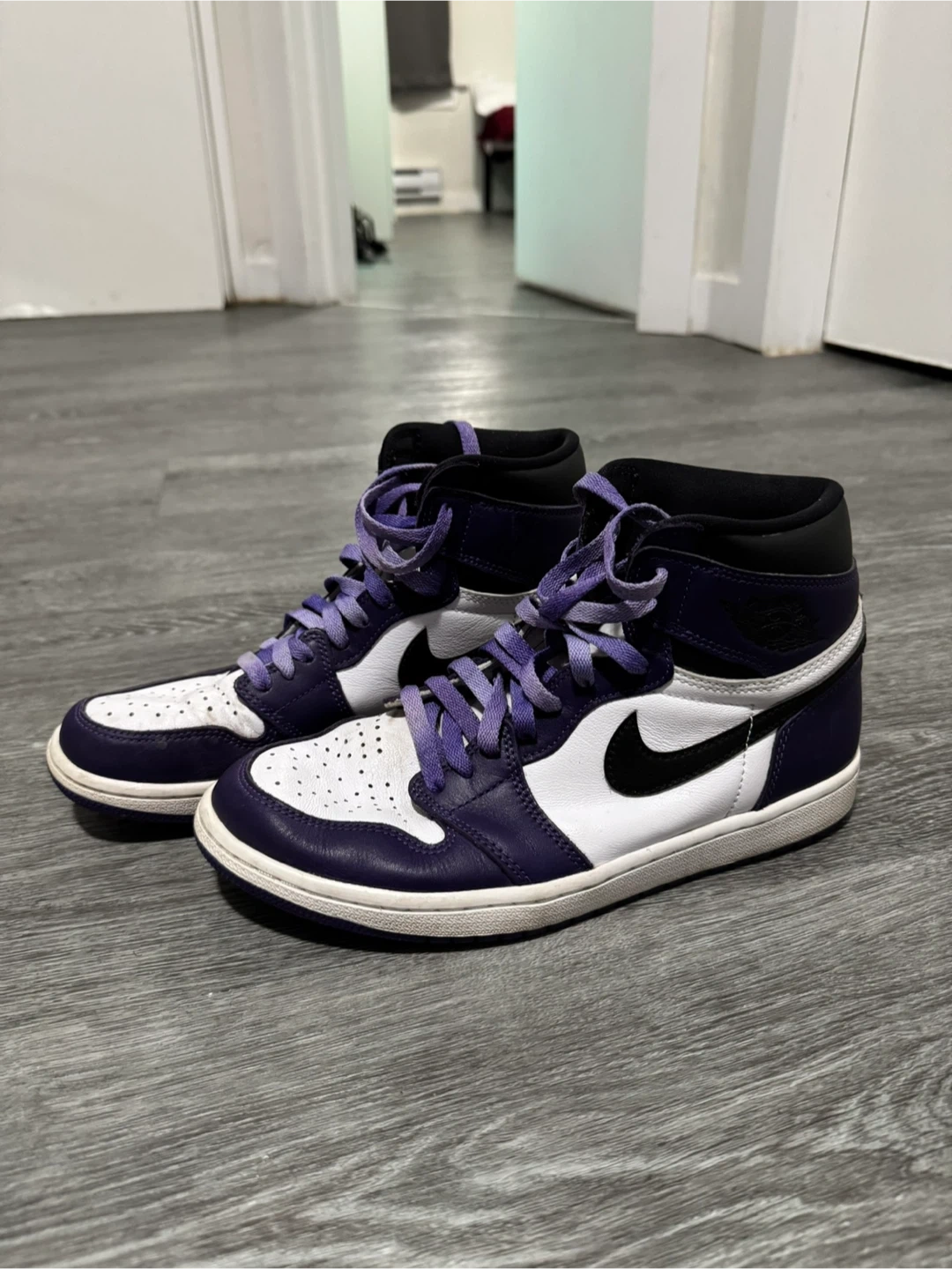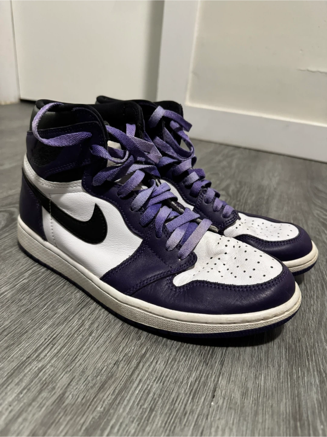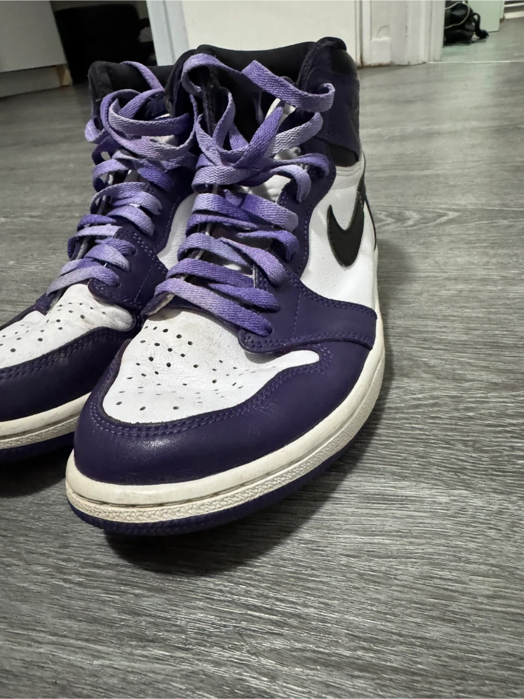 Selling a pair of Air Jordan 1 Retro High in Court Purple. These shoes have been worn and show some signs of wear, but still have plenty of life left! They're a classic style and a great addition to any sneaker collection.