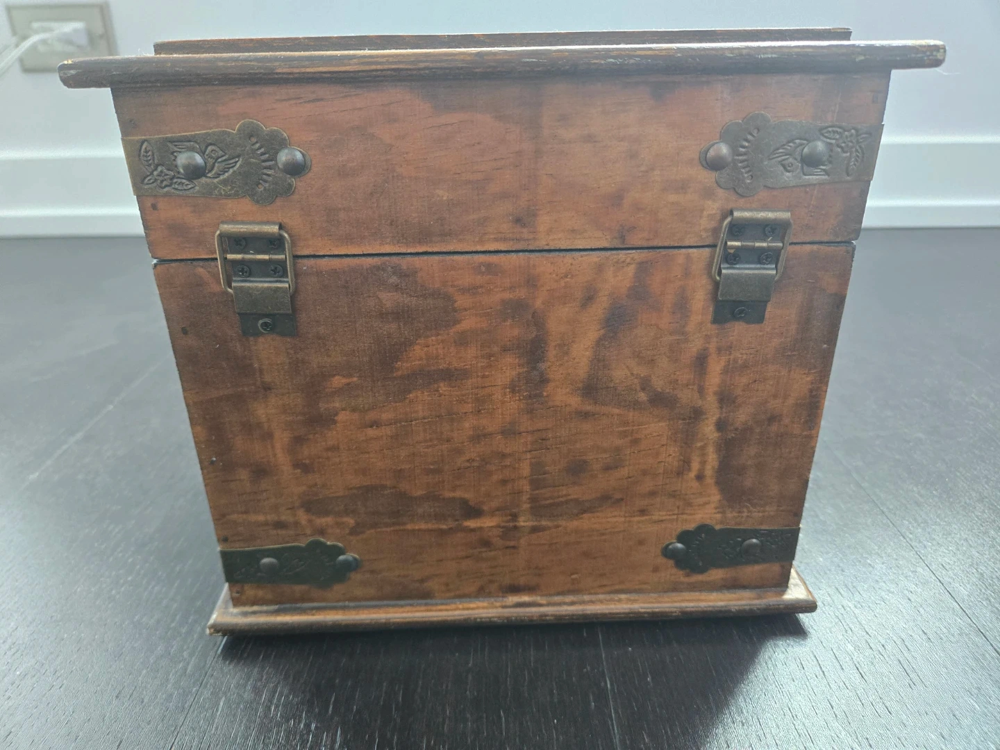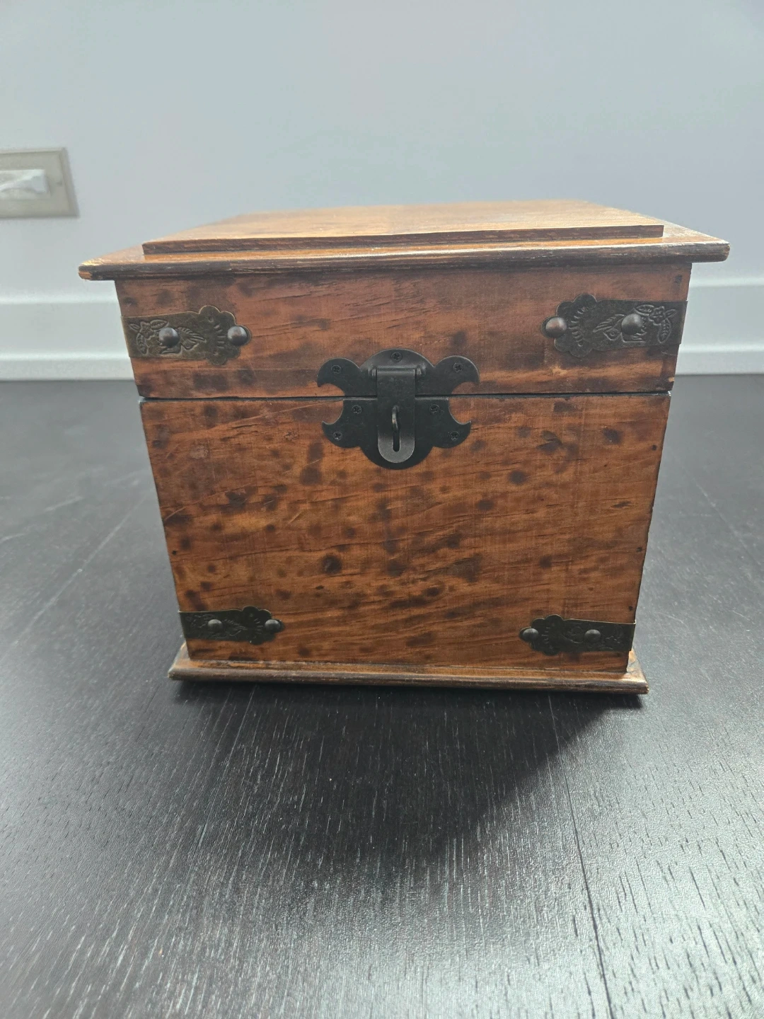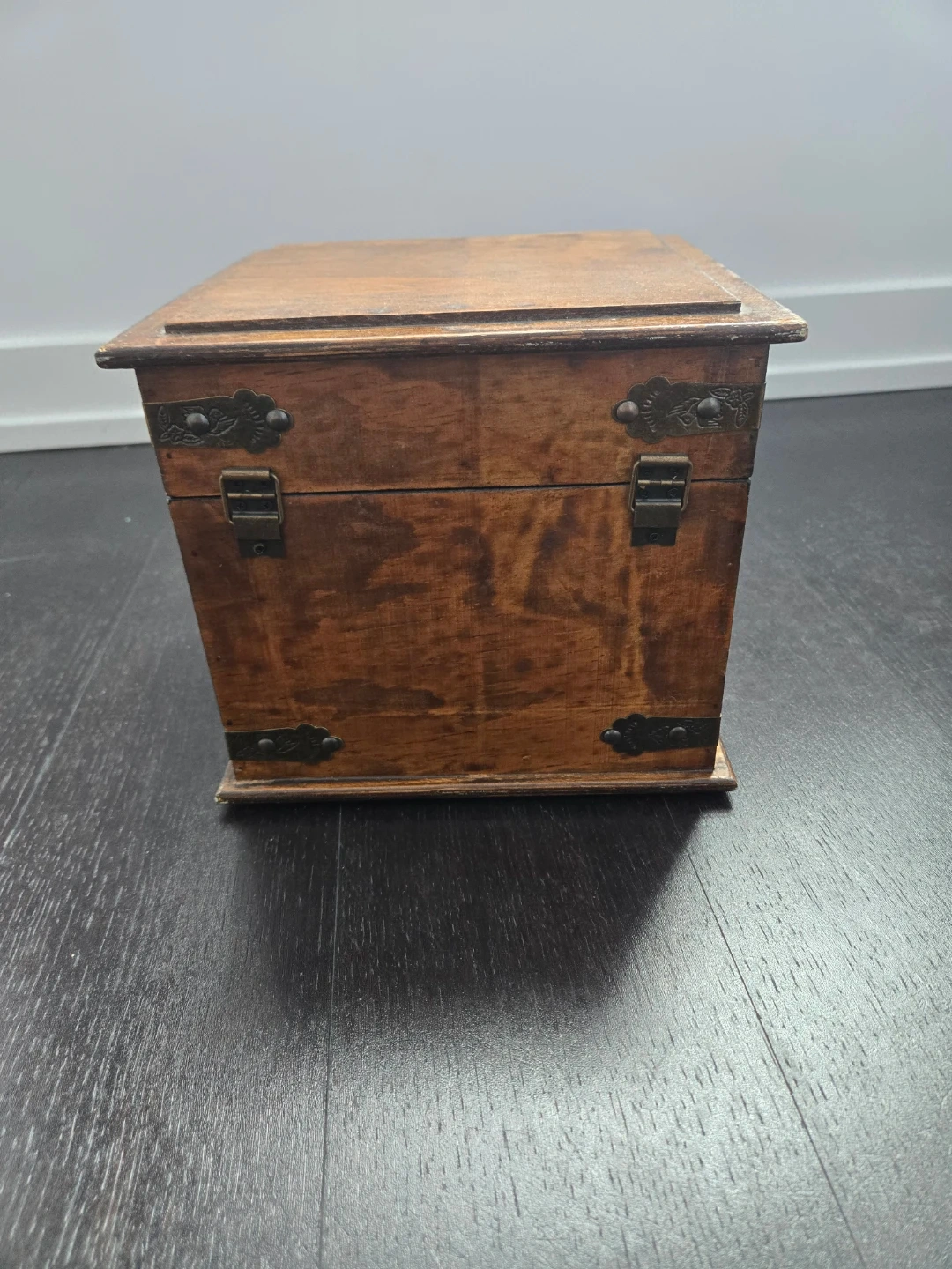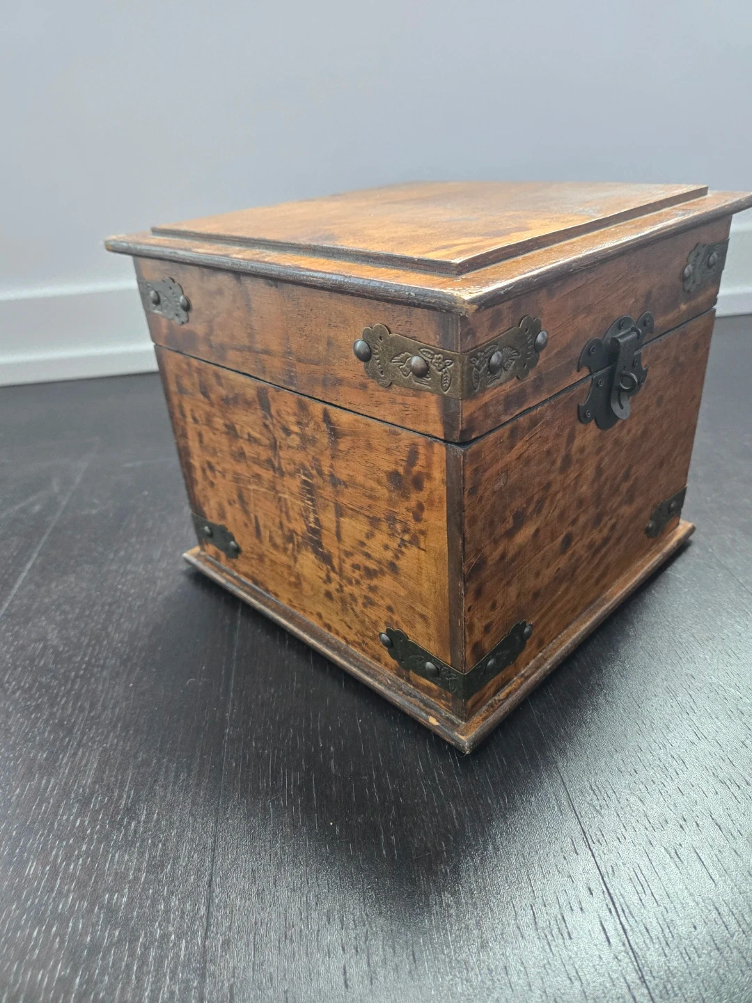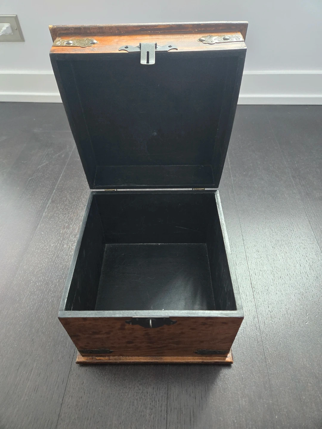A Special keepsake/wooden storage box with a dark finish and metal accents. It has a hinged lid and a clasp closure. The interior is lined with a dark material. It would be great for storing small items or as a decorative piece. Dimemsiobs: 25 cm square and 21 cm tall.