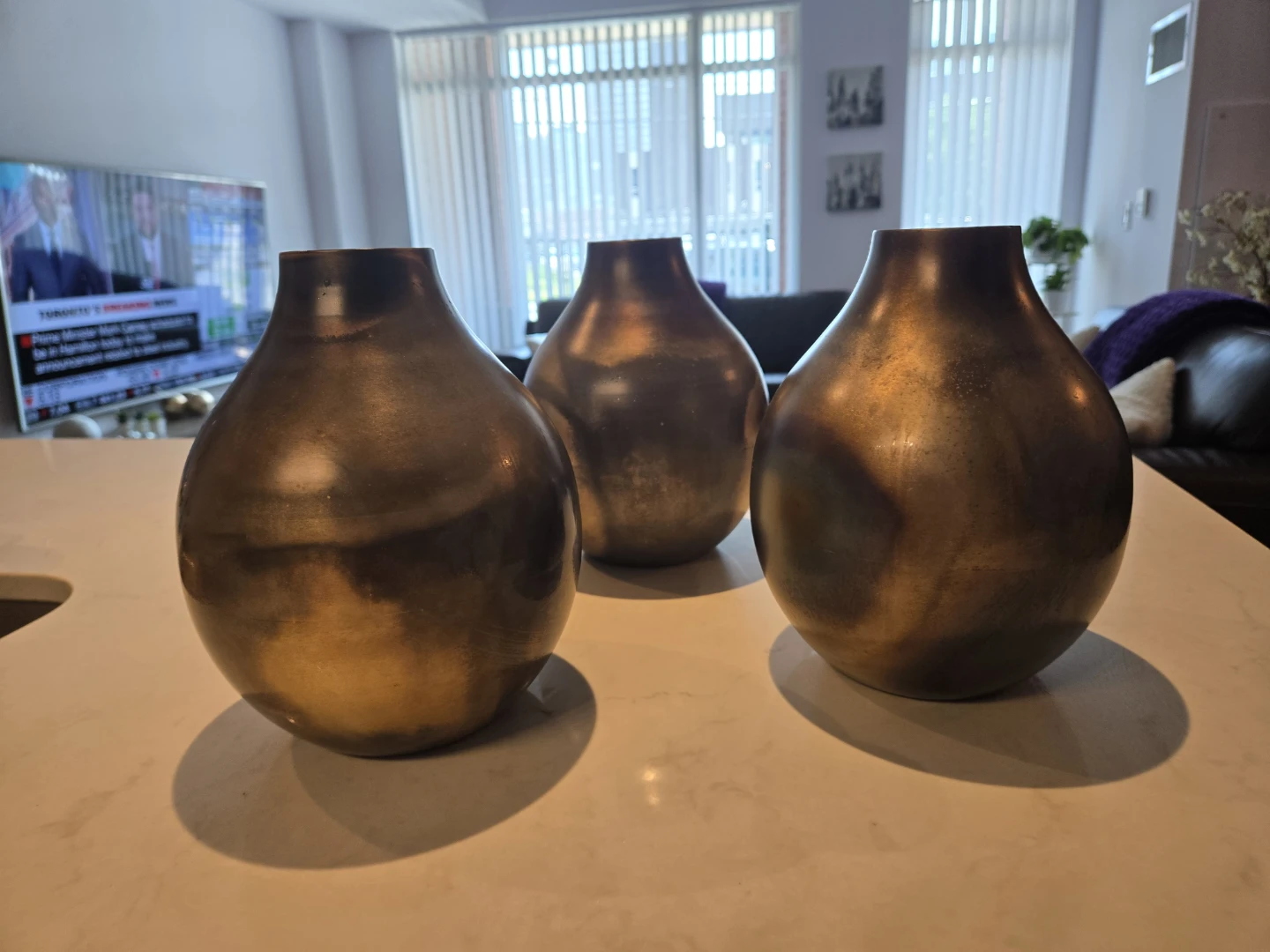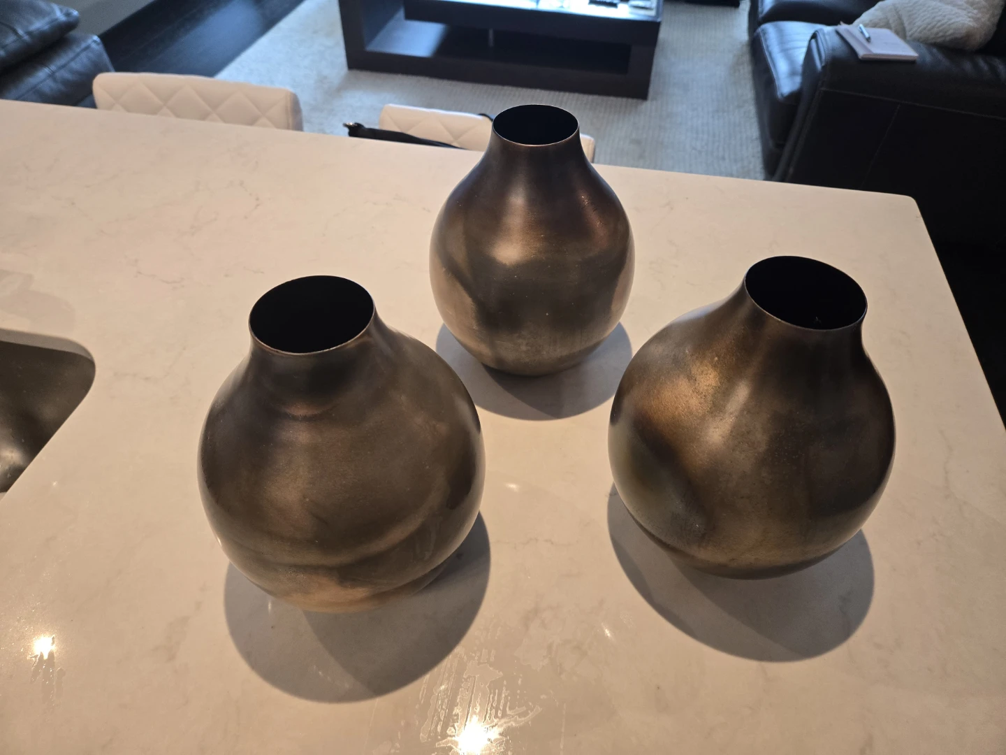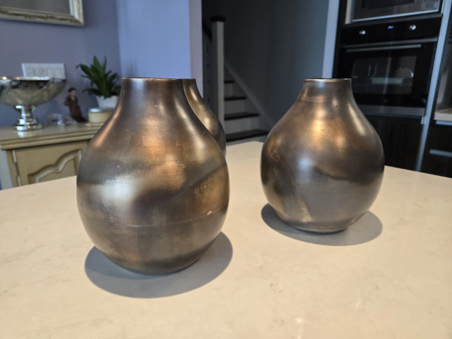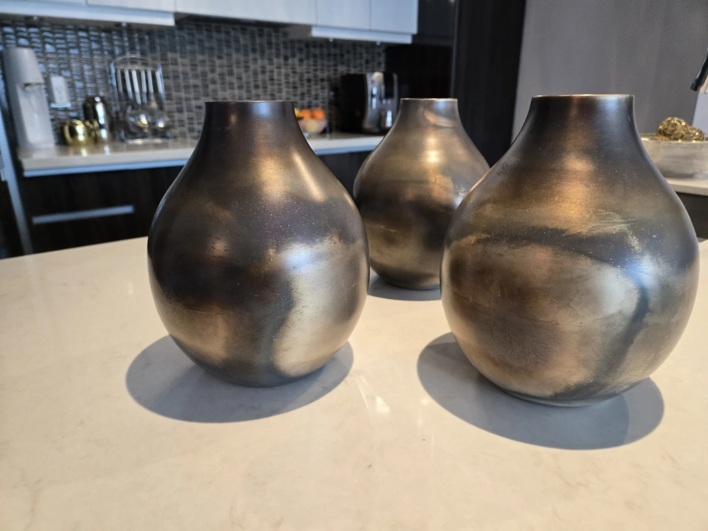 Selling a set of three decorative vases. They have a unique bronze/brown finish with a marbled effect. They would look great as a centrepiece or on a shelf!