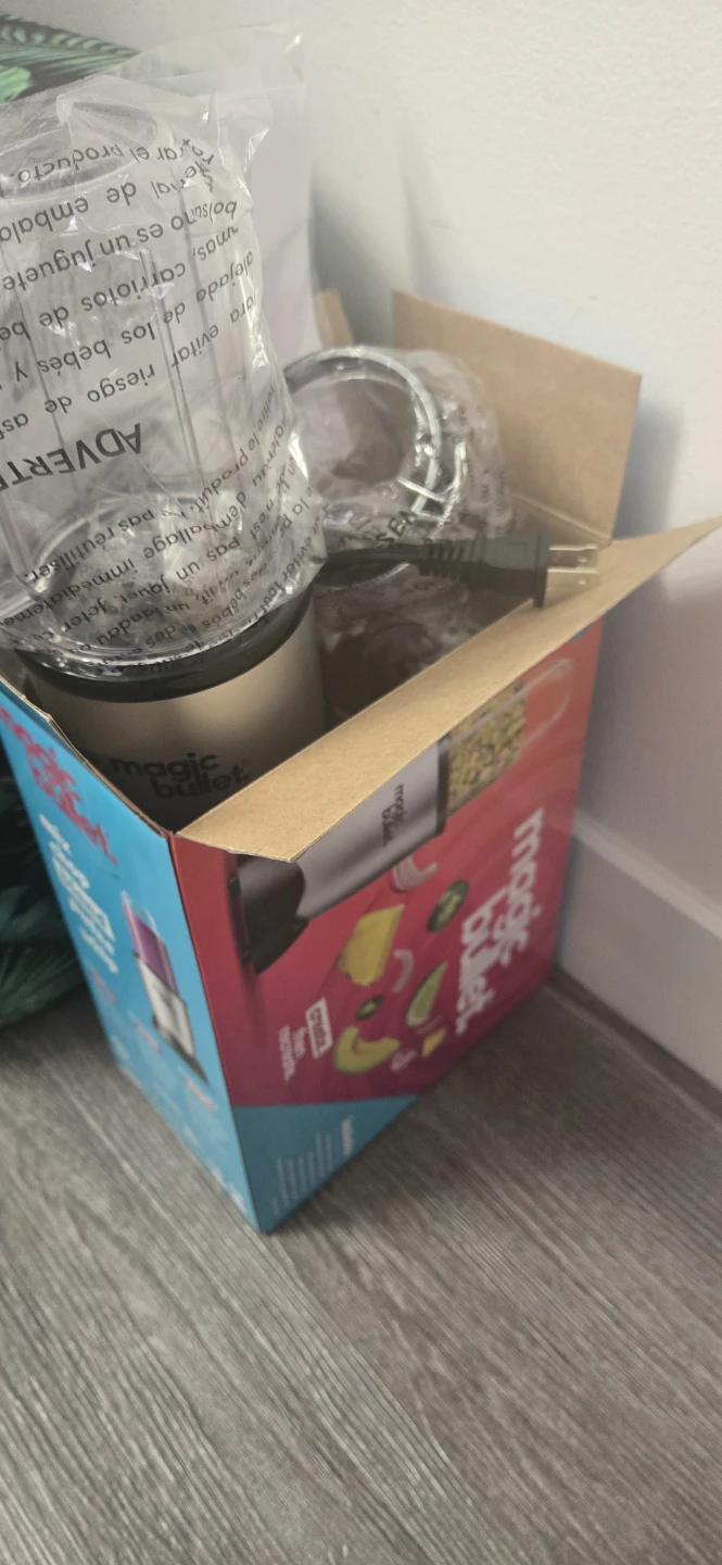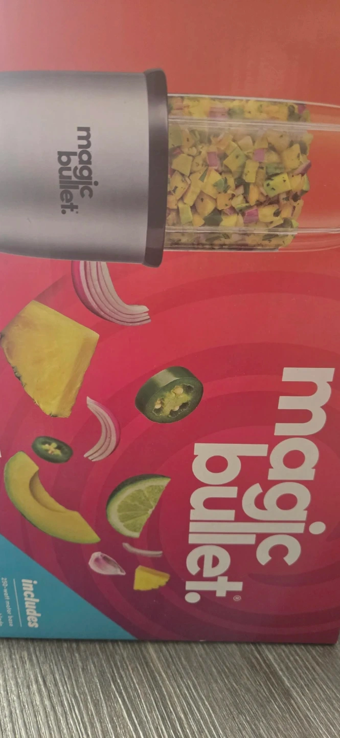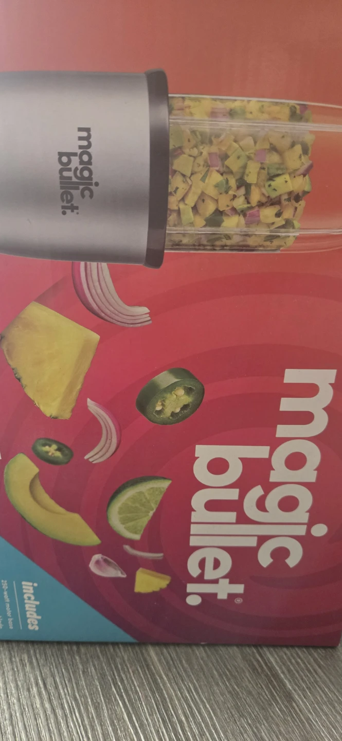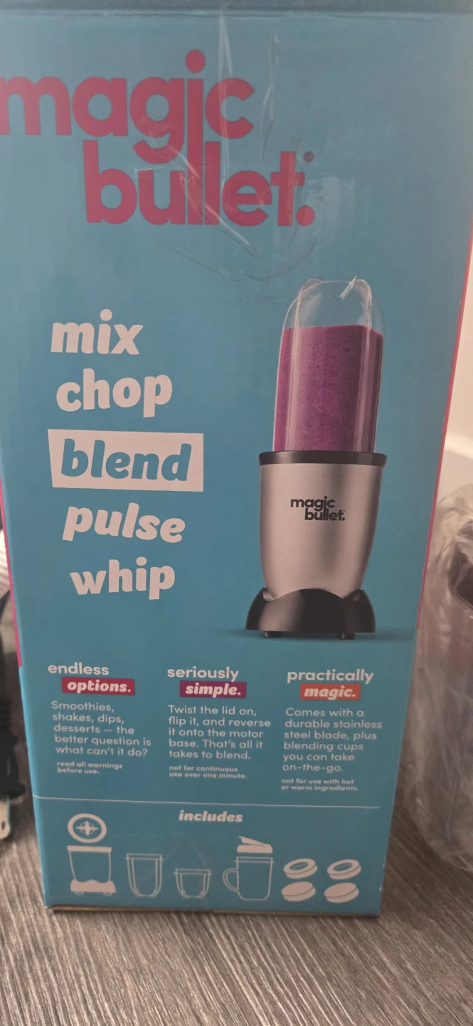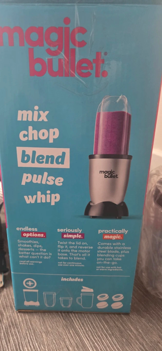 Selling a Magic Bullet blender set! It's perfect for smoothies, shakes, dips, and more. The box includes everything you need to mix, chop, blend, pulse, and whip up delicious treats. It comes with a durable stainless steel blade and cups for easy on-the-go enjoyment