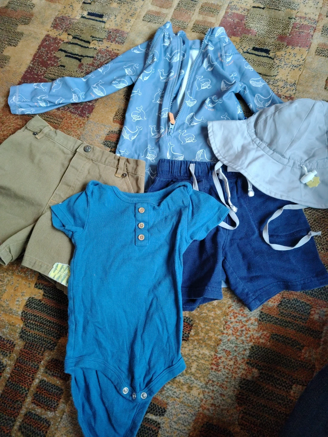A cute bundle of vacation clothes, perfect for a little one aged 6-36 months! Includes a mix of items like a onesie, shorts, a zip-up bathing suit and a sun hat. All in great condition and ready for a new baby!