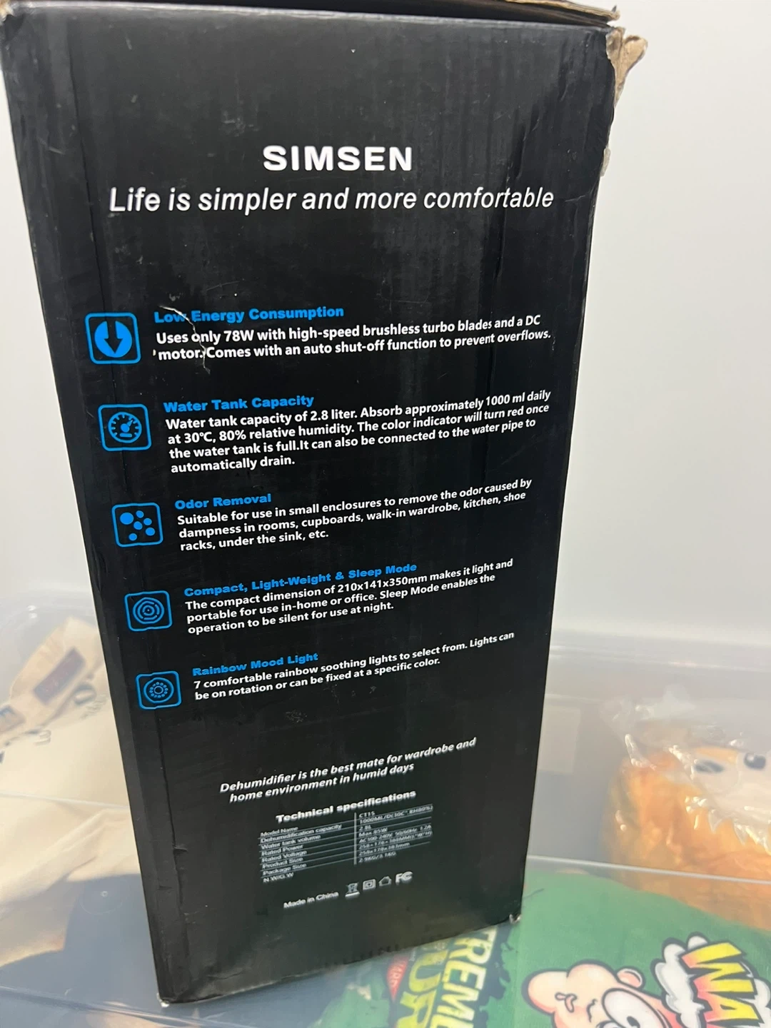 Selling a SIMSEN CT15 Dehumidifier in excellent condition! It uses only 78W with a high-speed brushless turbo blade and DC motor, and comes with an auto shut-off function to prevent overflows.