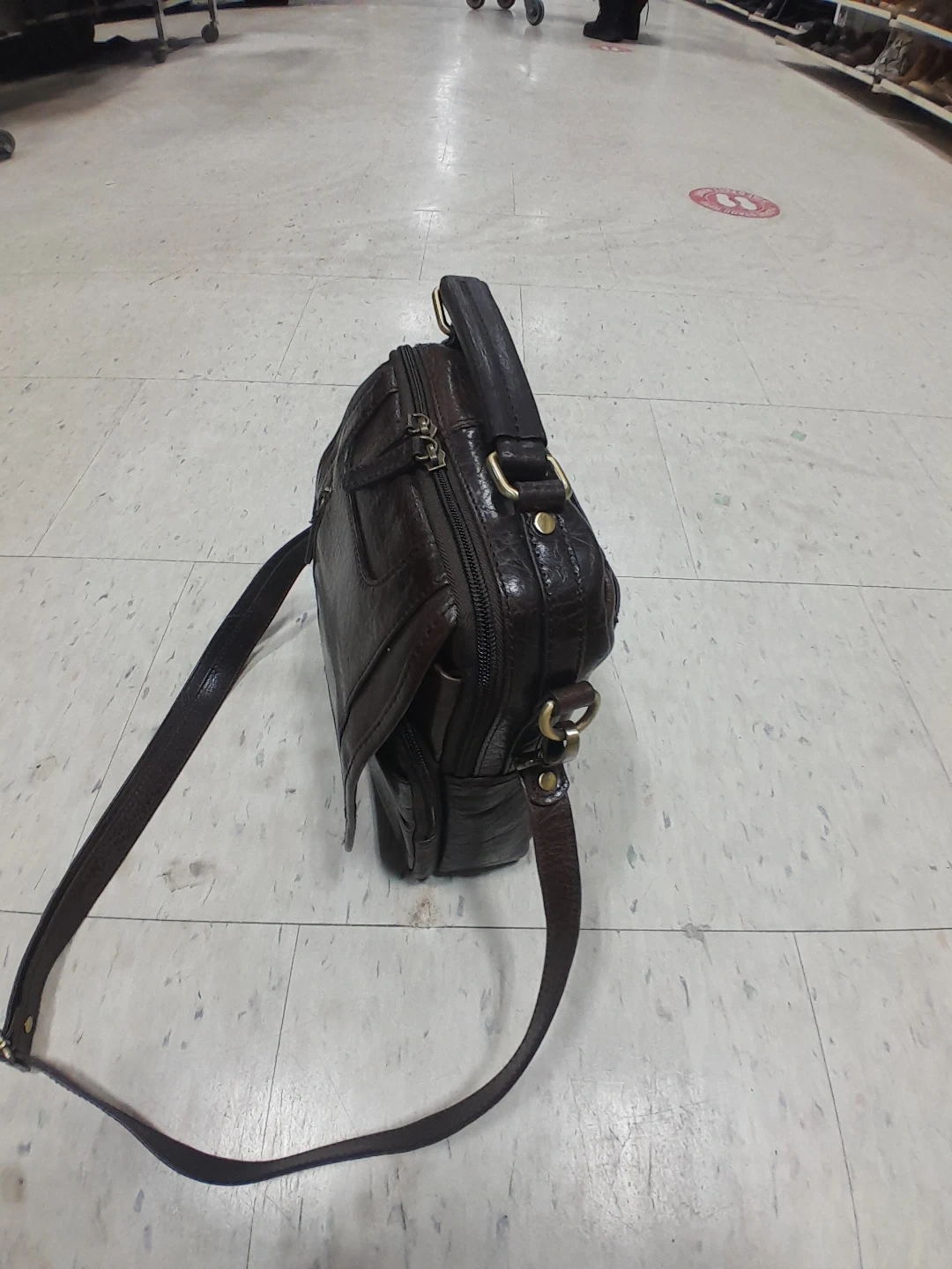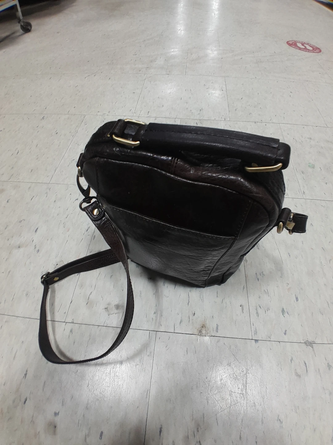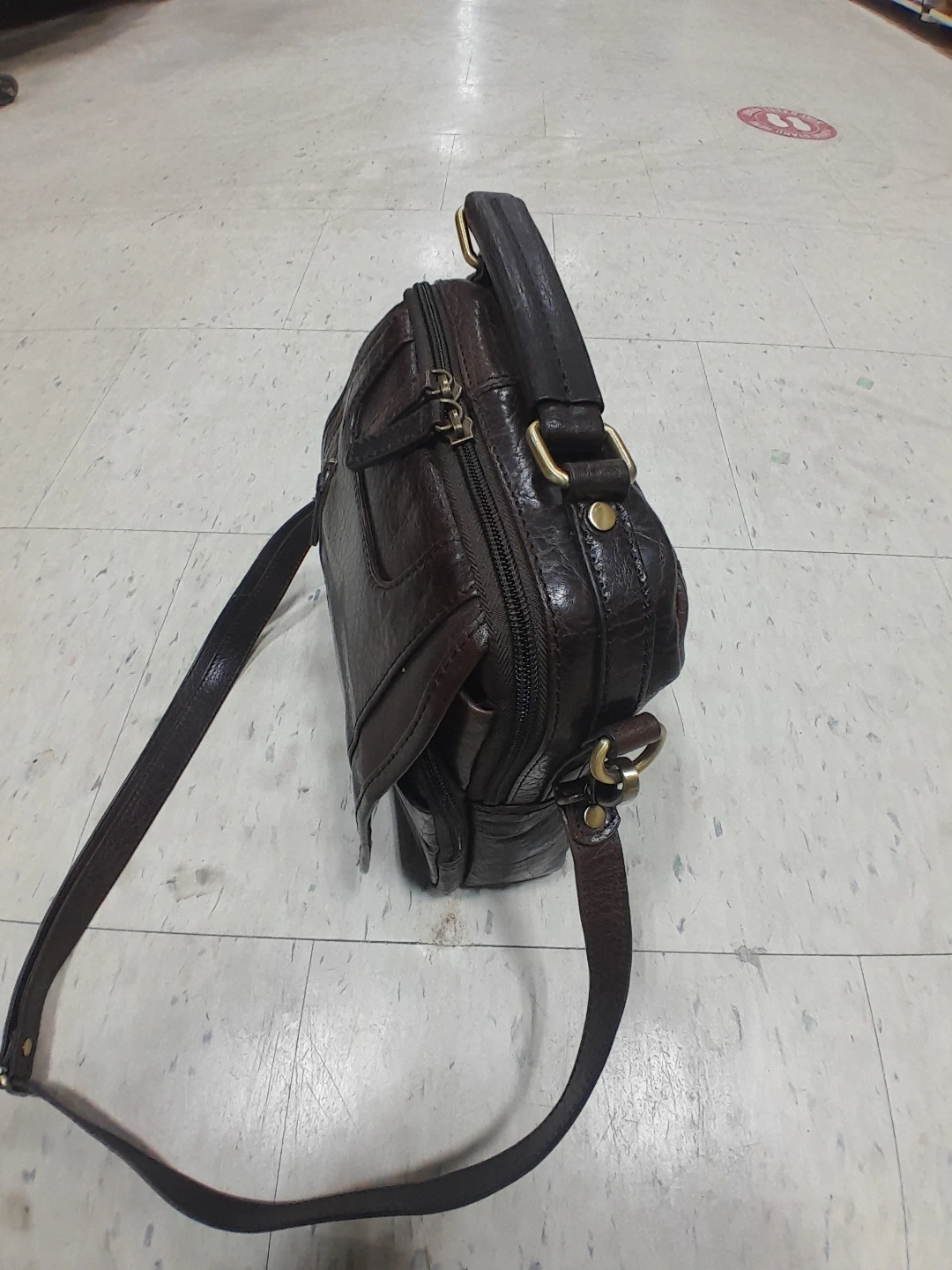 Stylish leather messenger bag in a dark brown colour. It features a top handle and adjustable shoulder strap. Perfect for carrying your essentials around town! Original Mancini Vintage for Elites.