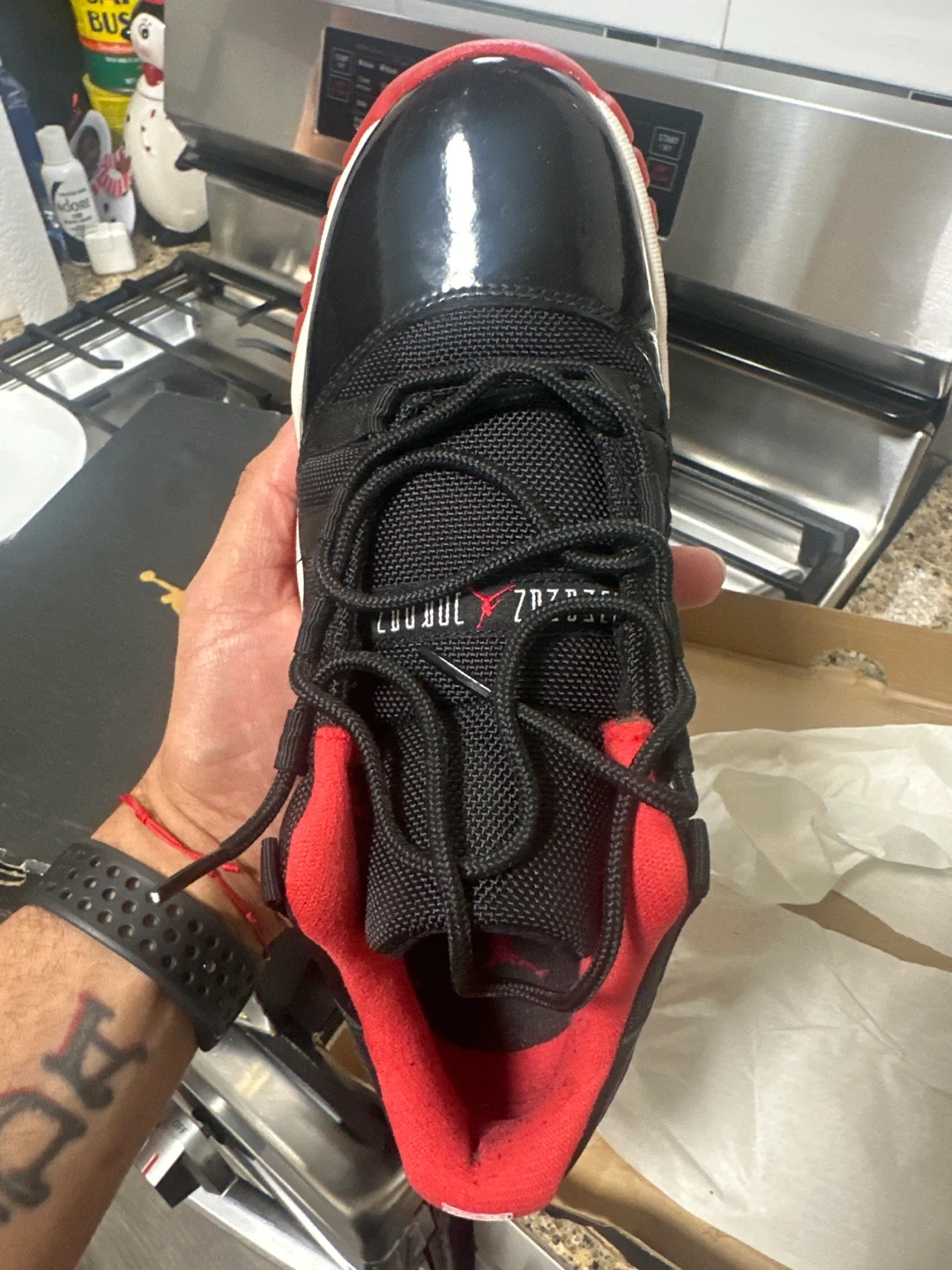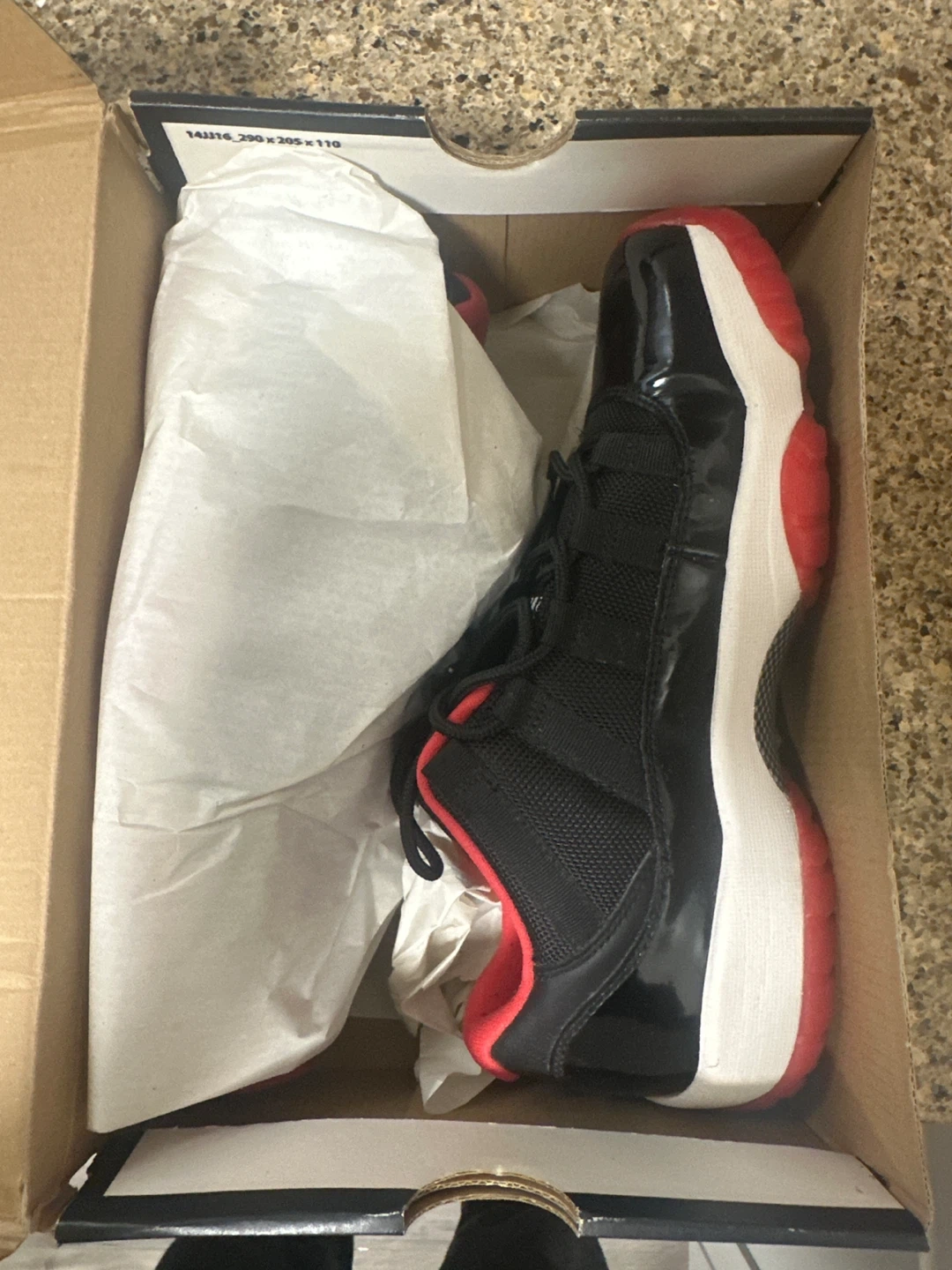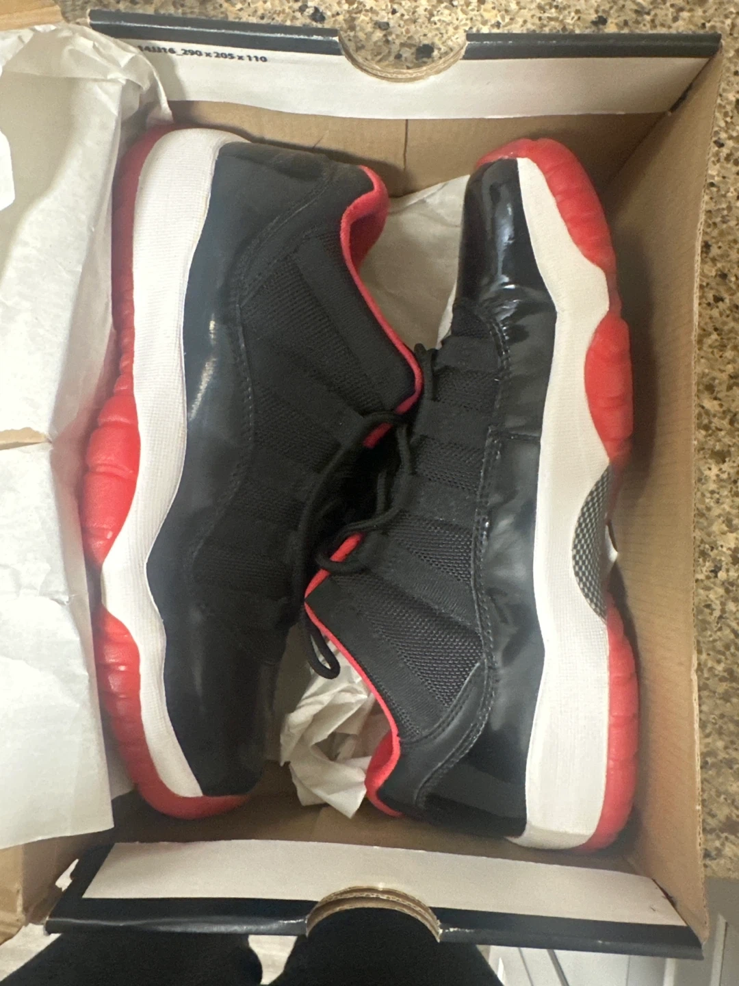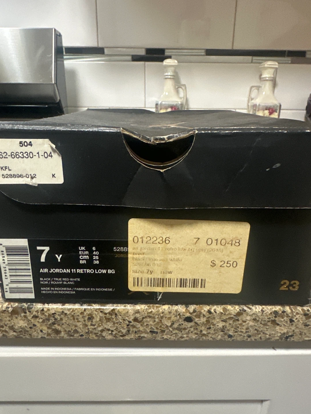 Selling a pair of Air Jordan 11 Retro Low BG in size 7Y. They come with the original box. The shoes are black, red, and white. The box indicates they were originally priced at $250