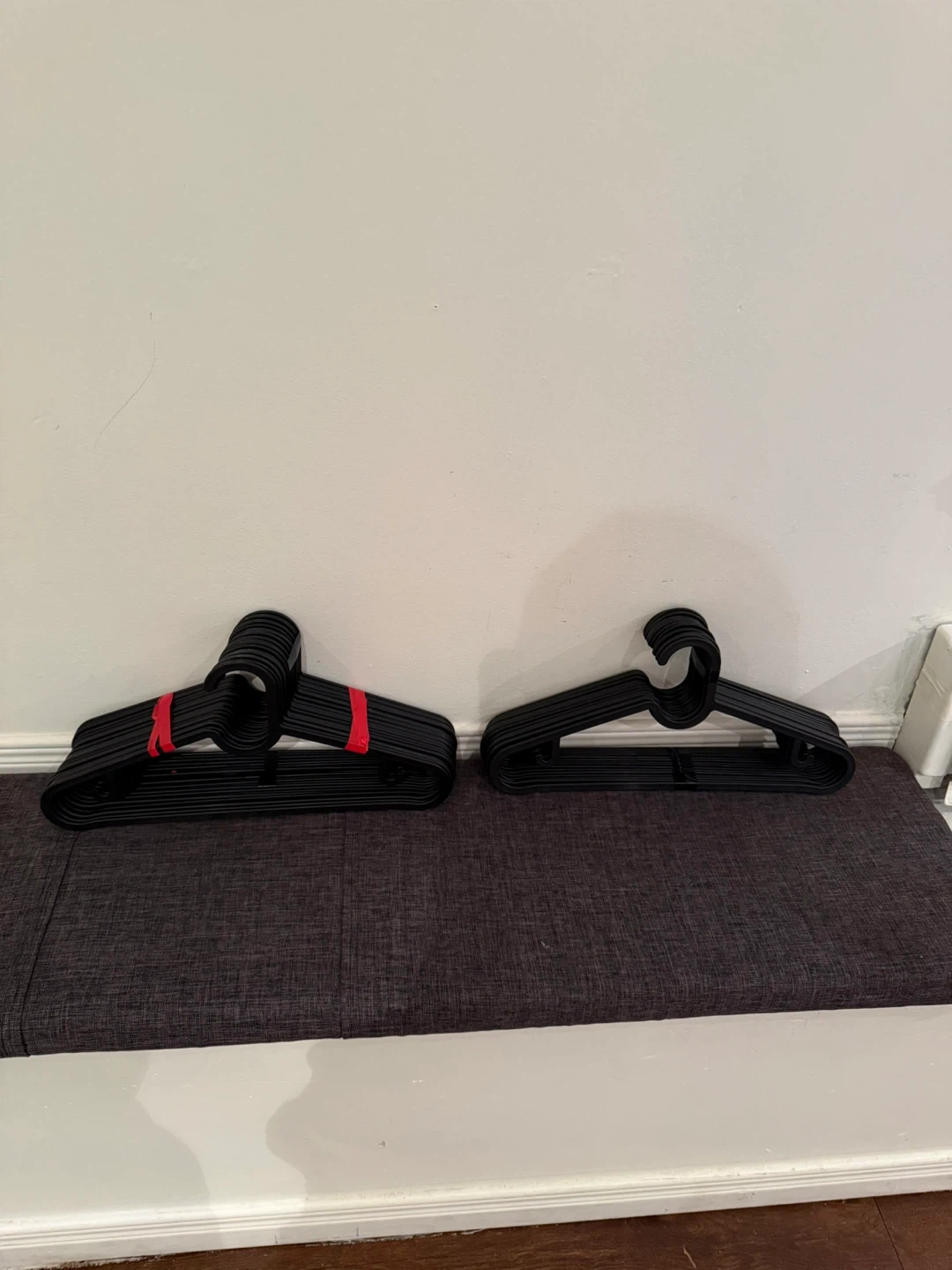Selling 37 black plastic clothes hangers. They're in great shape and ready to hold your clothes!
