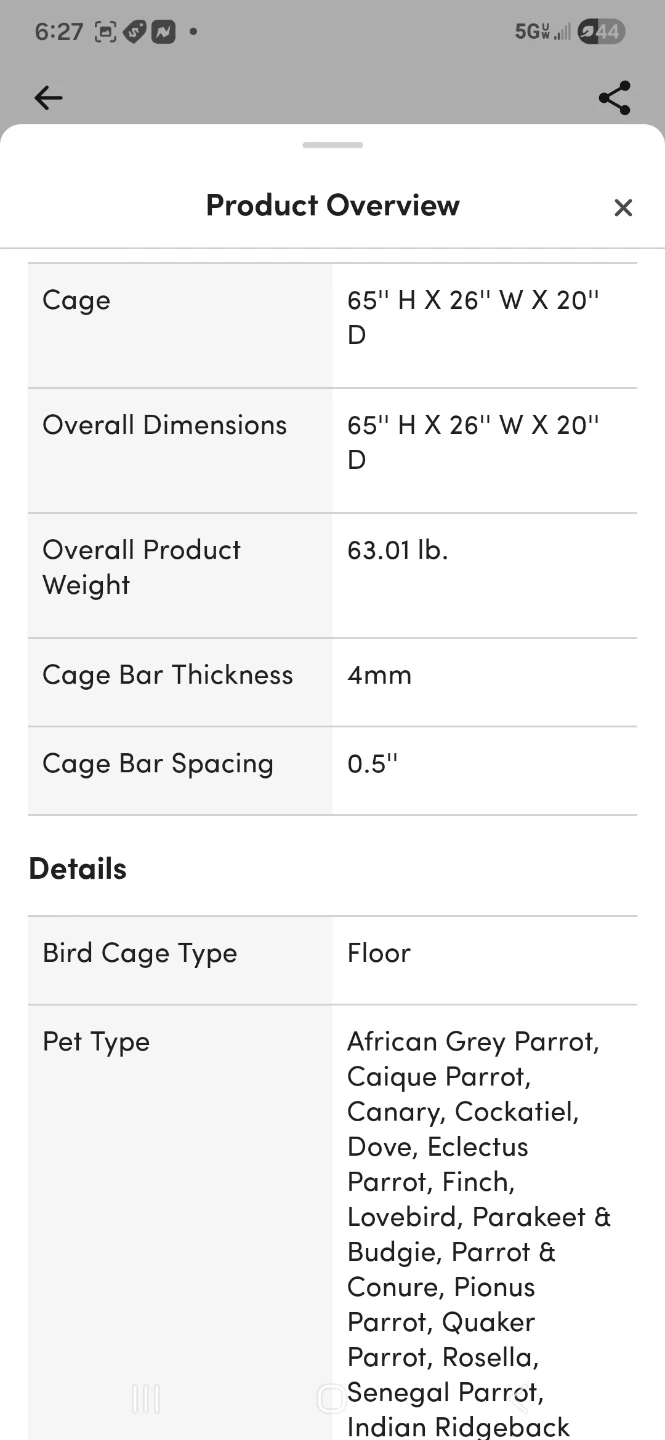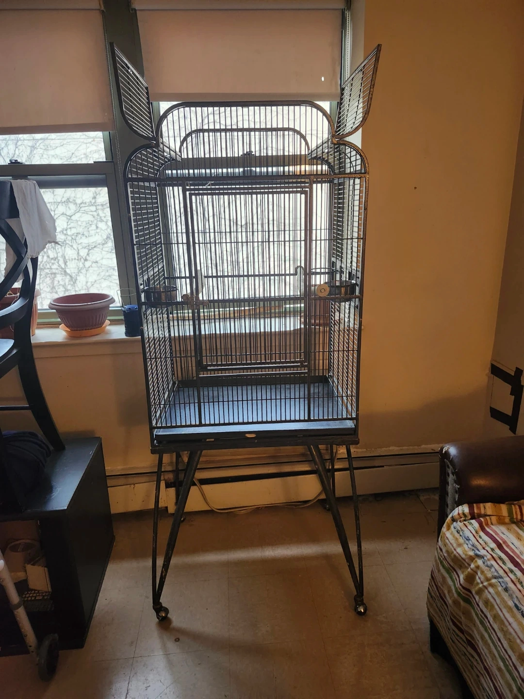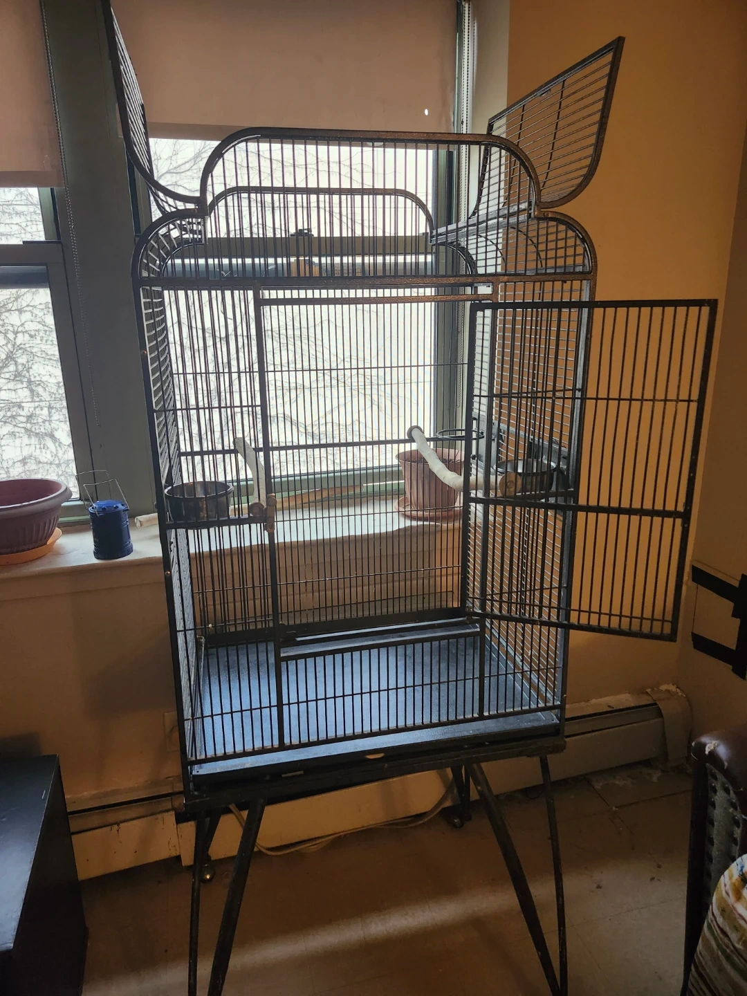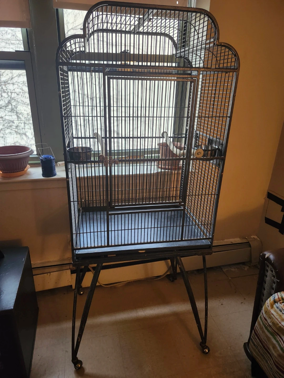 Selling a large bird cage in black with a stand. It includes 2 food bowls, perch and a removable bottom tray for easy cleaning. This cage offers plenty of space for your feathered friend to move around and feel comfortable, the dimensions are in the pictures.