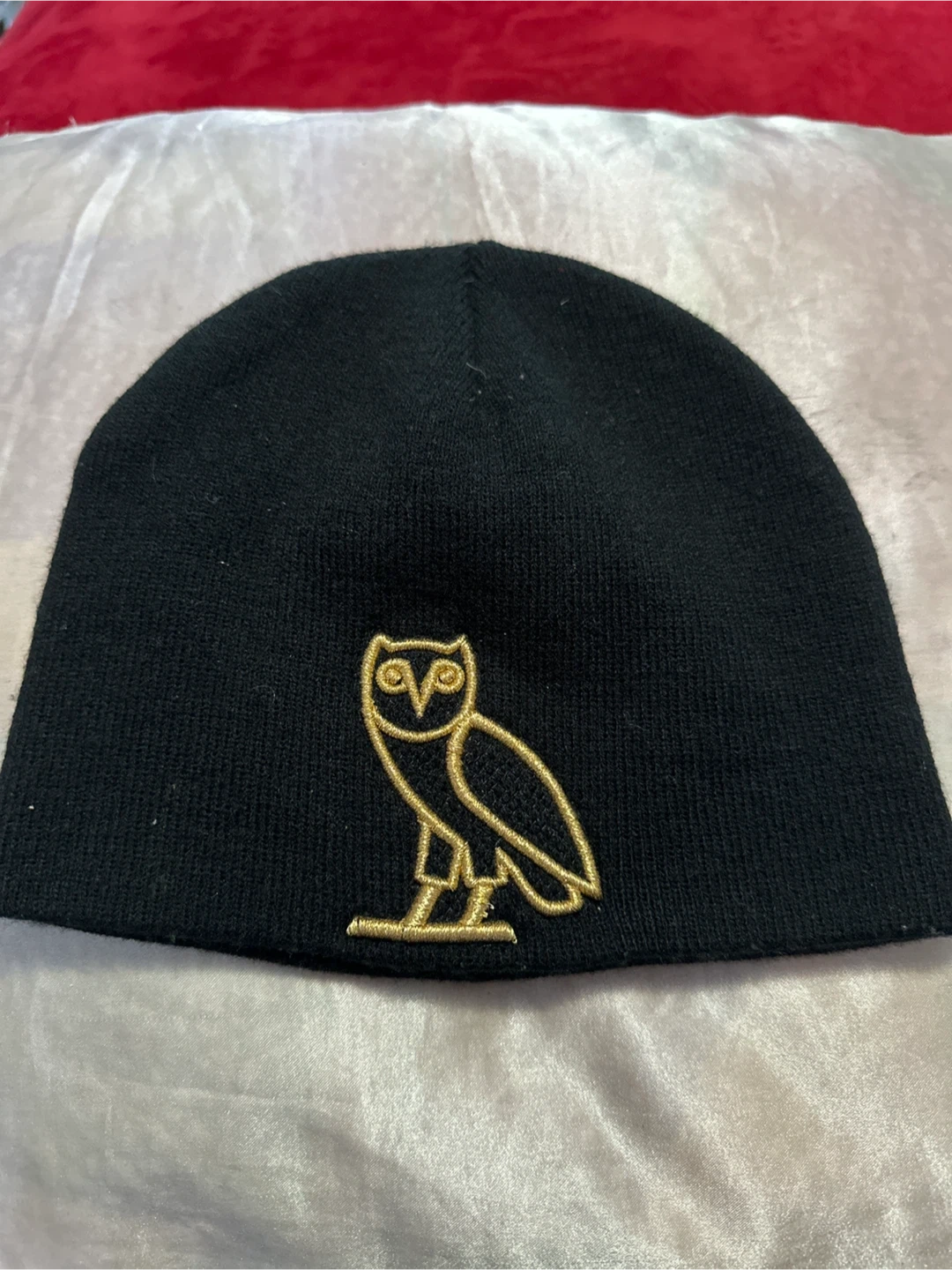 Selling a black OVO beanie. It's in great condition and features the classic OVO owl logo embroidered on the front. Perfect for keeping warm and showing off your style!