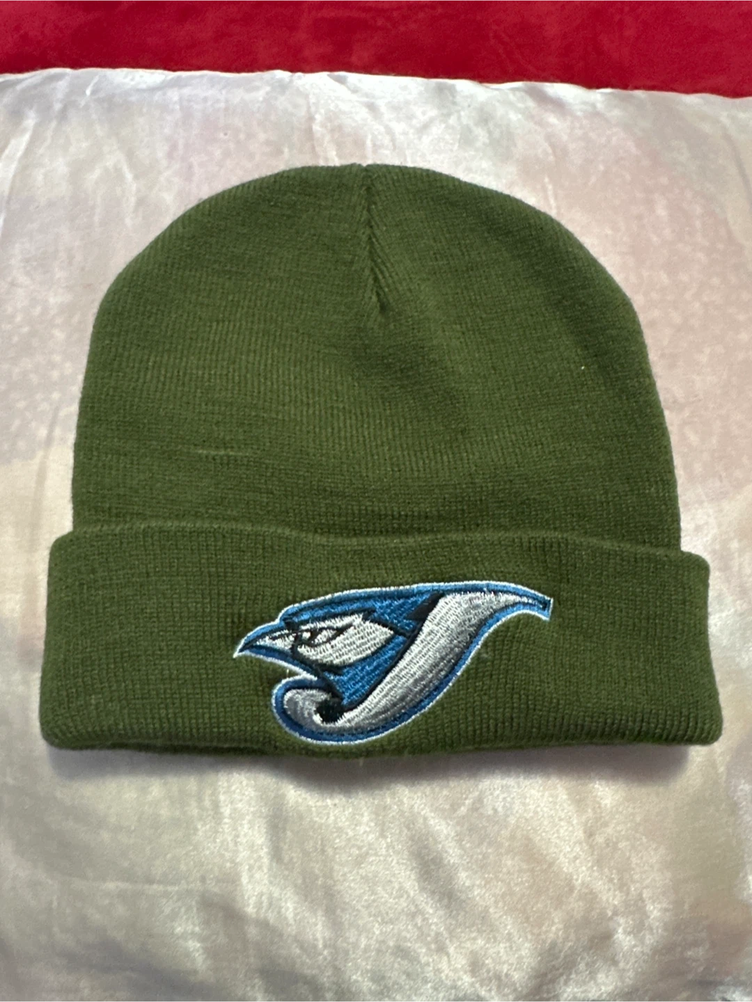 Selling a Toronto Blue Jays beanie in olive green! It's in great condition and ready to keep you warm during those chilly games or just out and about