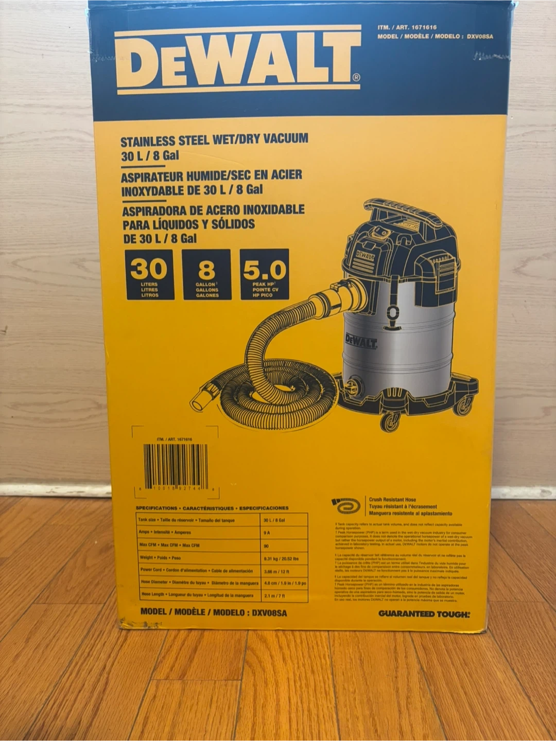 Selling a brand new DeWalt 30L/8 Gal stainless steel wet/dry vacuum! It's still in its original box and has never been used. This vacuum is designed for both liquids and solids, making it super versatile for any cleaning job. The model number is DXV08SA. Get ready to tackle any mess with this tough and reliable vacuum!