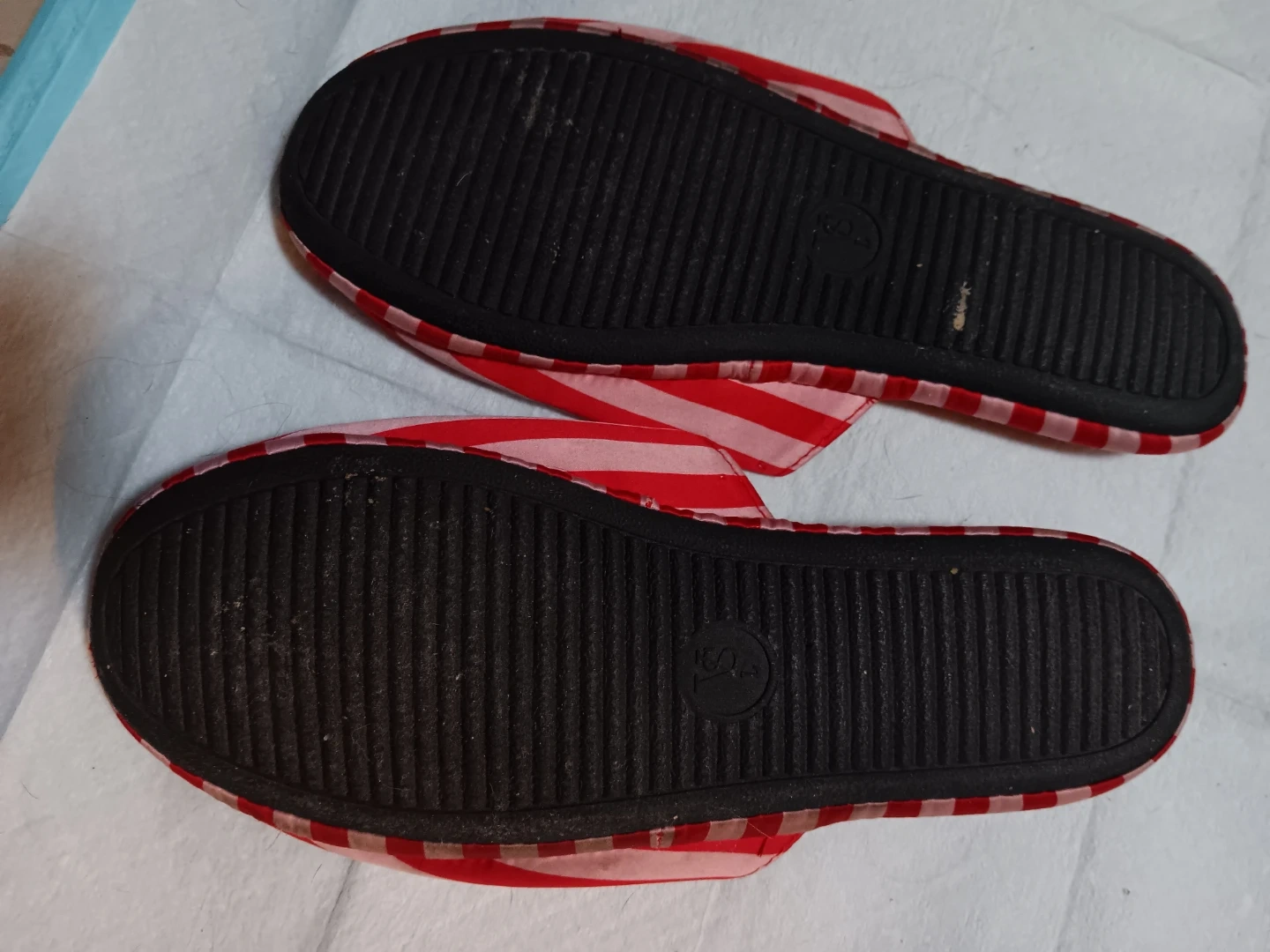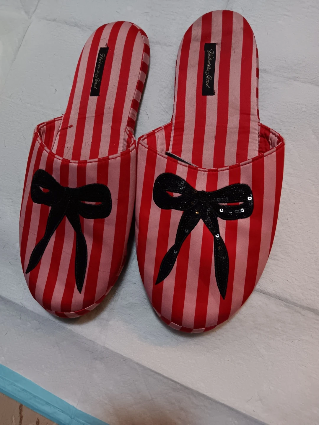 Cute Victoria's Secret slippers with a red and pink striped pattern and a black bow. They are in used condition, as shown in the pictures. Perfect for lounging around the house!