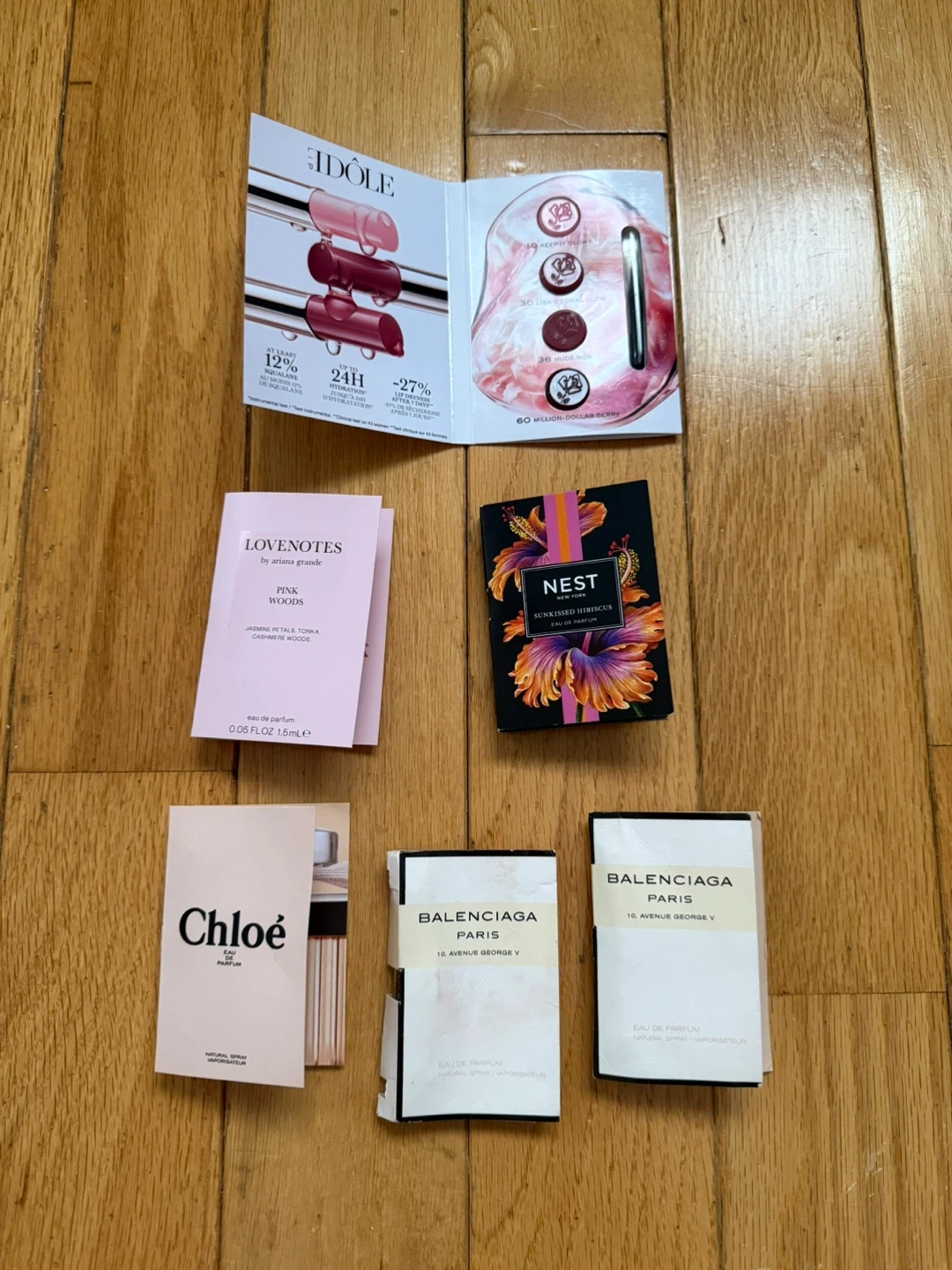 Nest, Chloe and Ariana Grande Love Notes mini perfume sampler. Two balenciaga minis which are each about half full. Lancôme Lip Idole sampler trio.