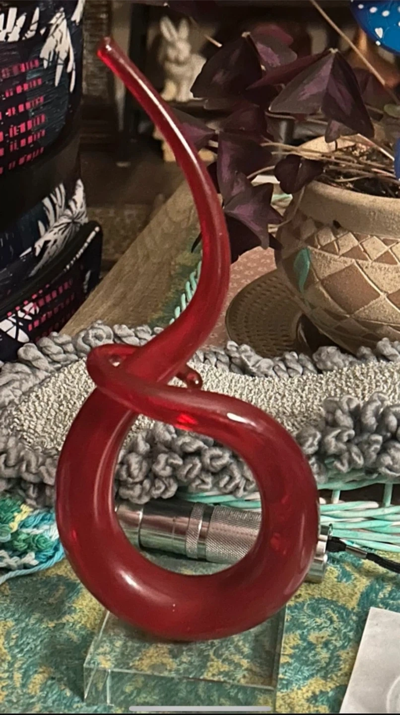 Here's a unique red glass swirl decoration! It's in good condition and would look great on a shelf or table. It adds a pop of colour and a modern touch to any room