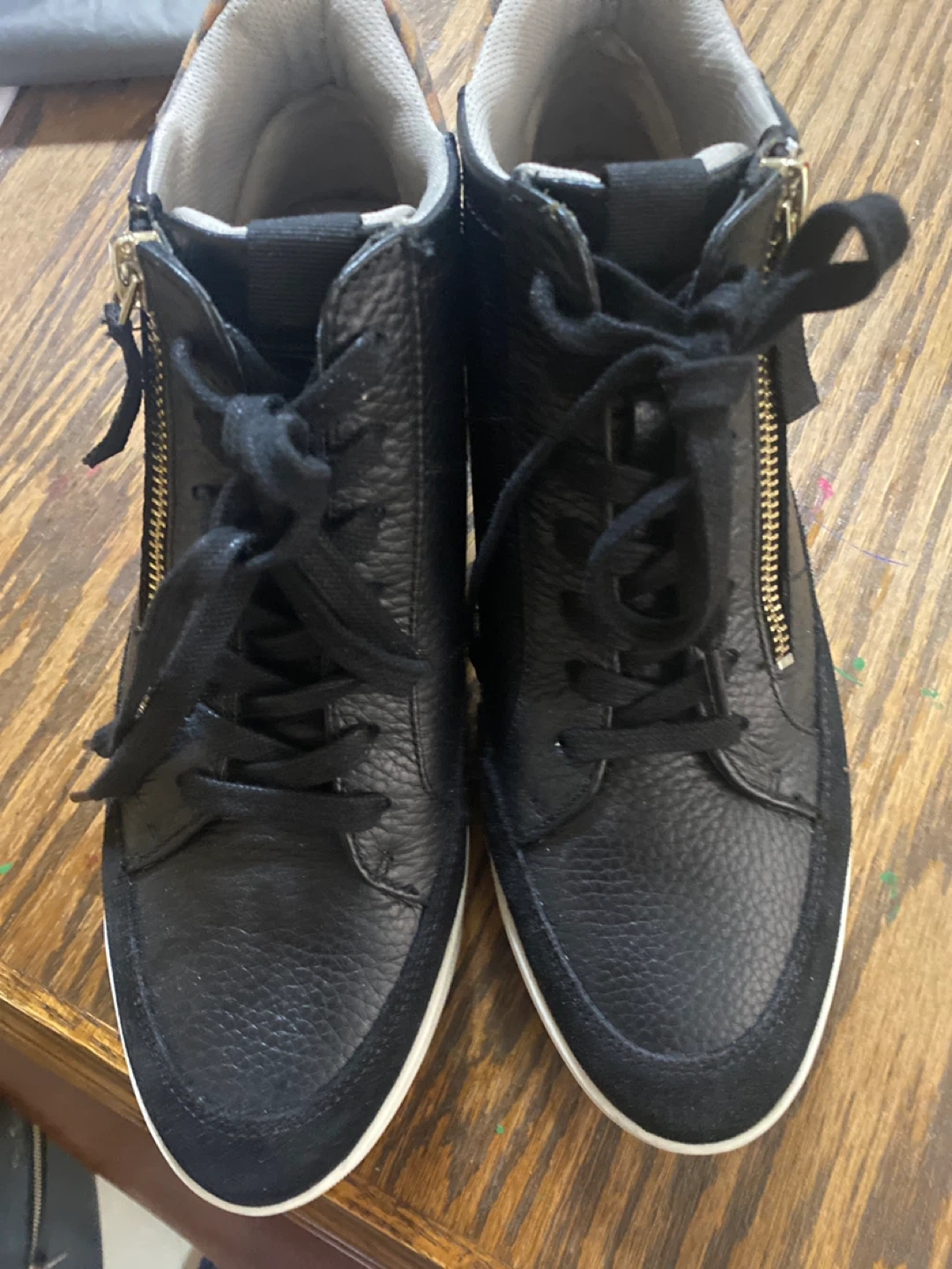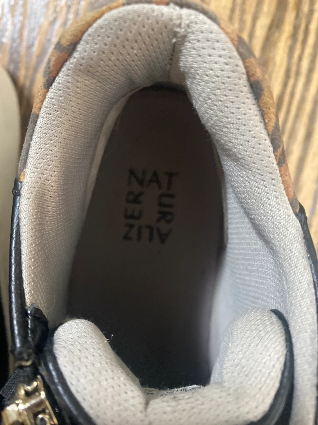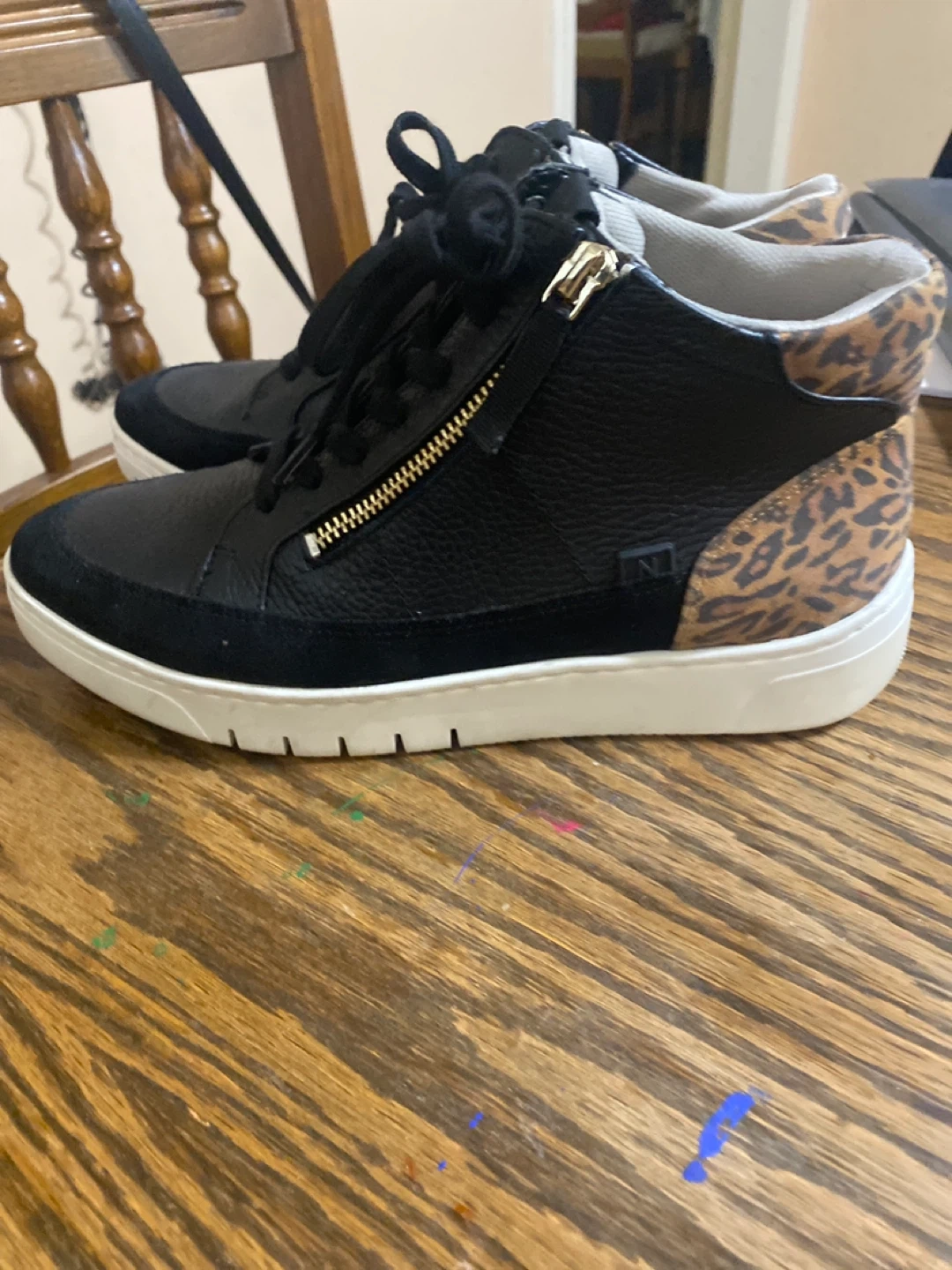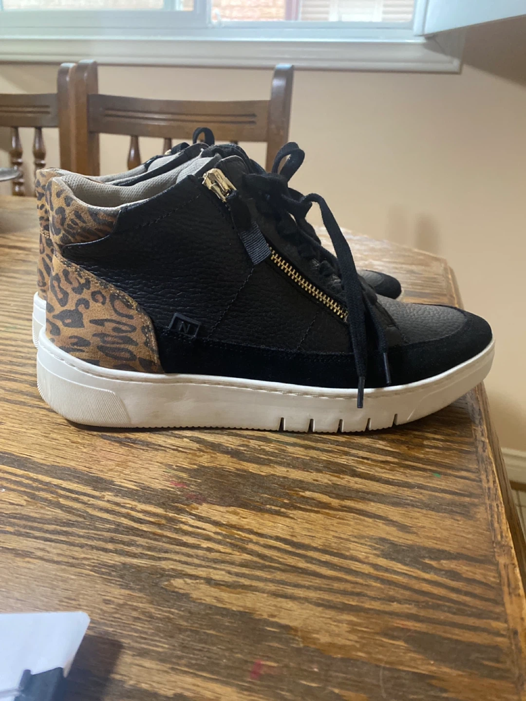 Selling a pair of Naturalizer sneakers. They feature a sleek black leather design with a fun leopard print accent around the ankle. These shoes have a zipper detail and are brand new .