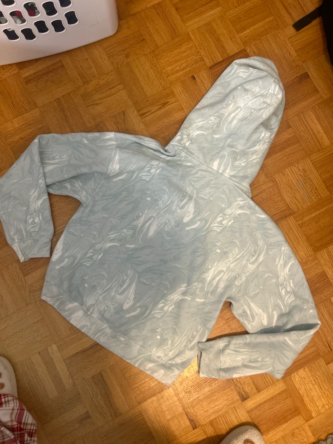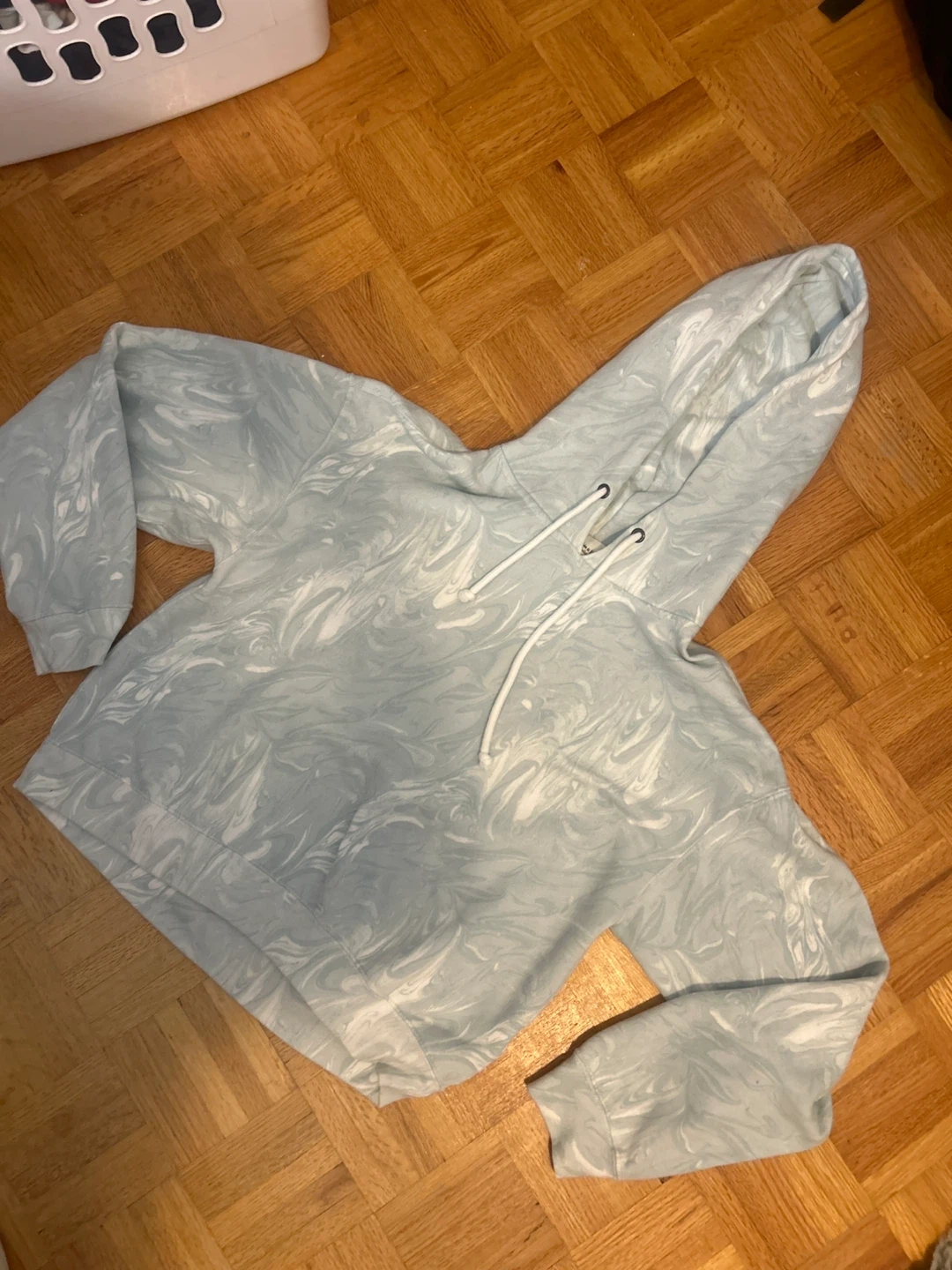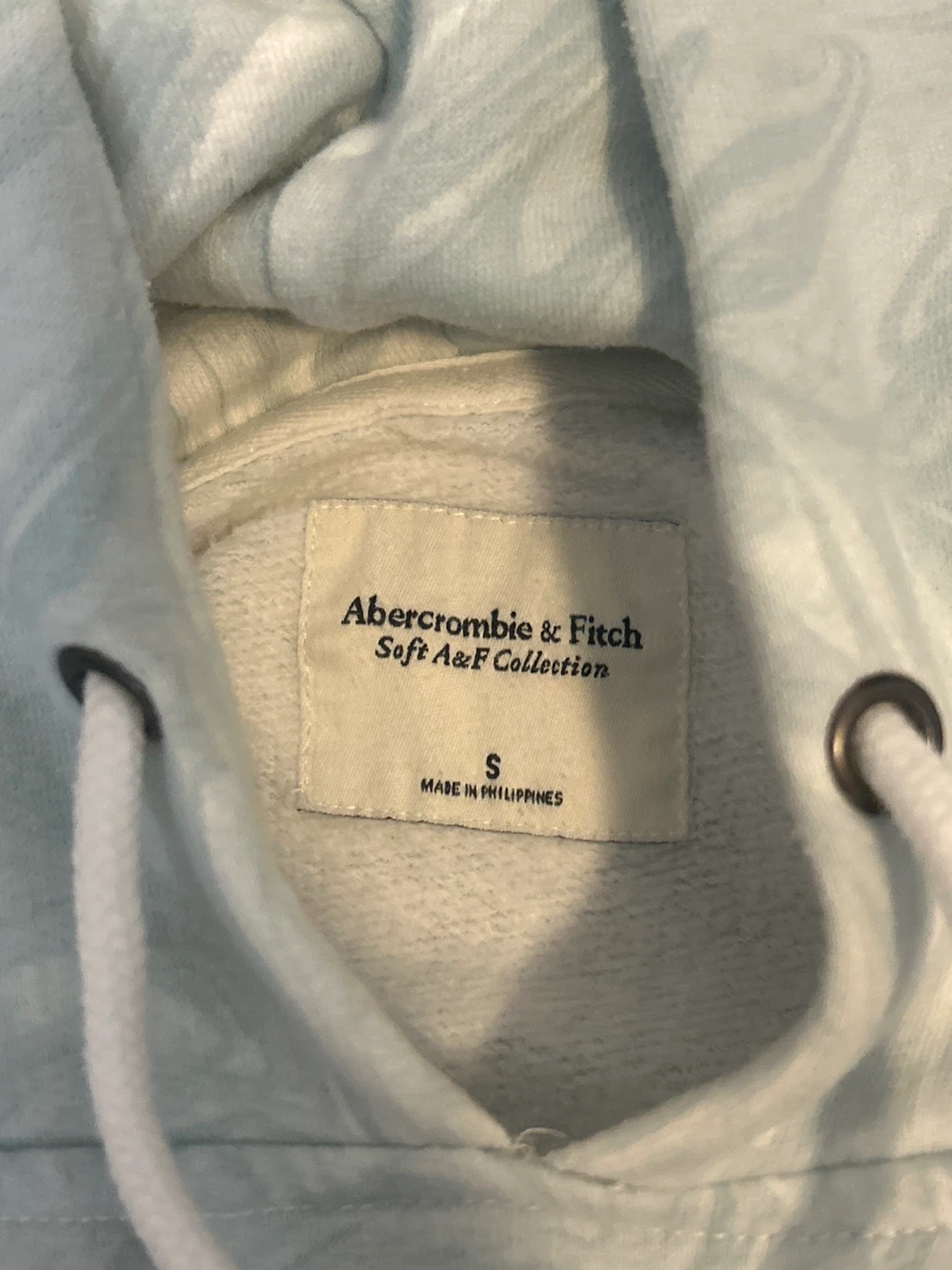 Cozy Abercrombie & Fitch hoodie from the Soft A&F Collection in size small. The hoodie features a unique light blue and white marbled pattern. It's in great condition and ready for a new owner!