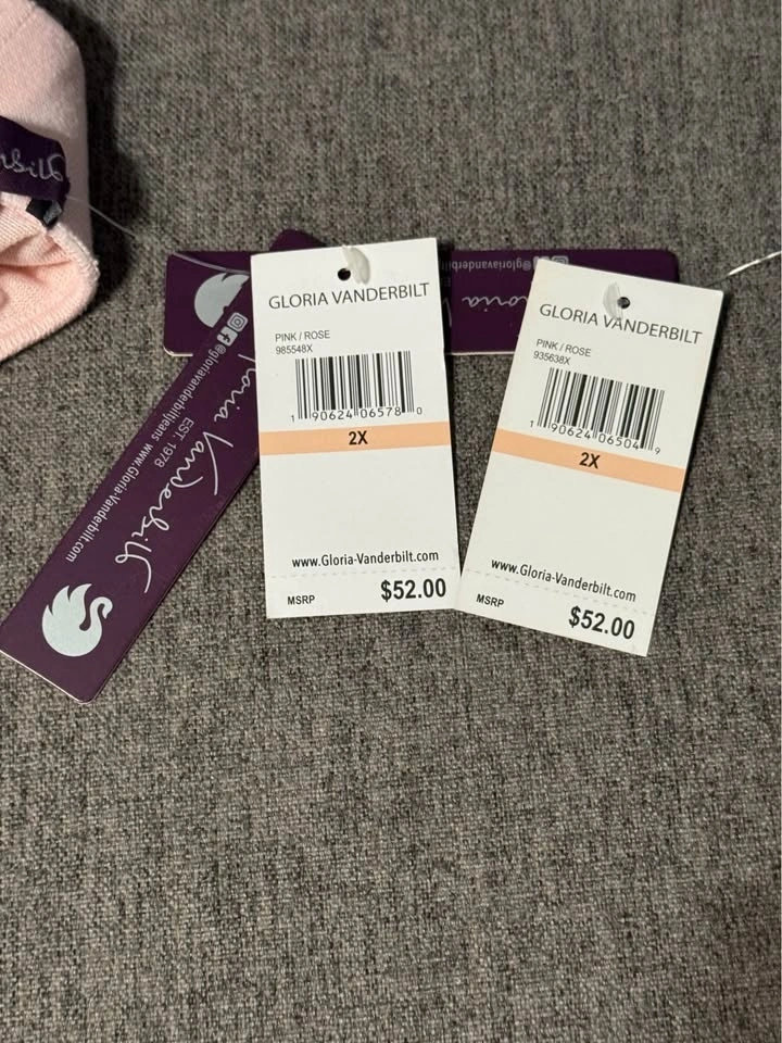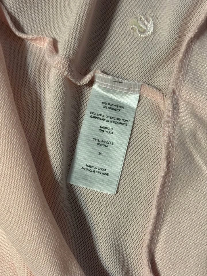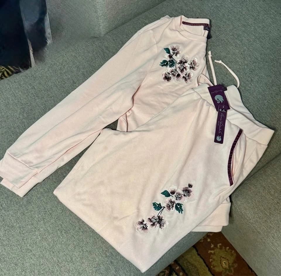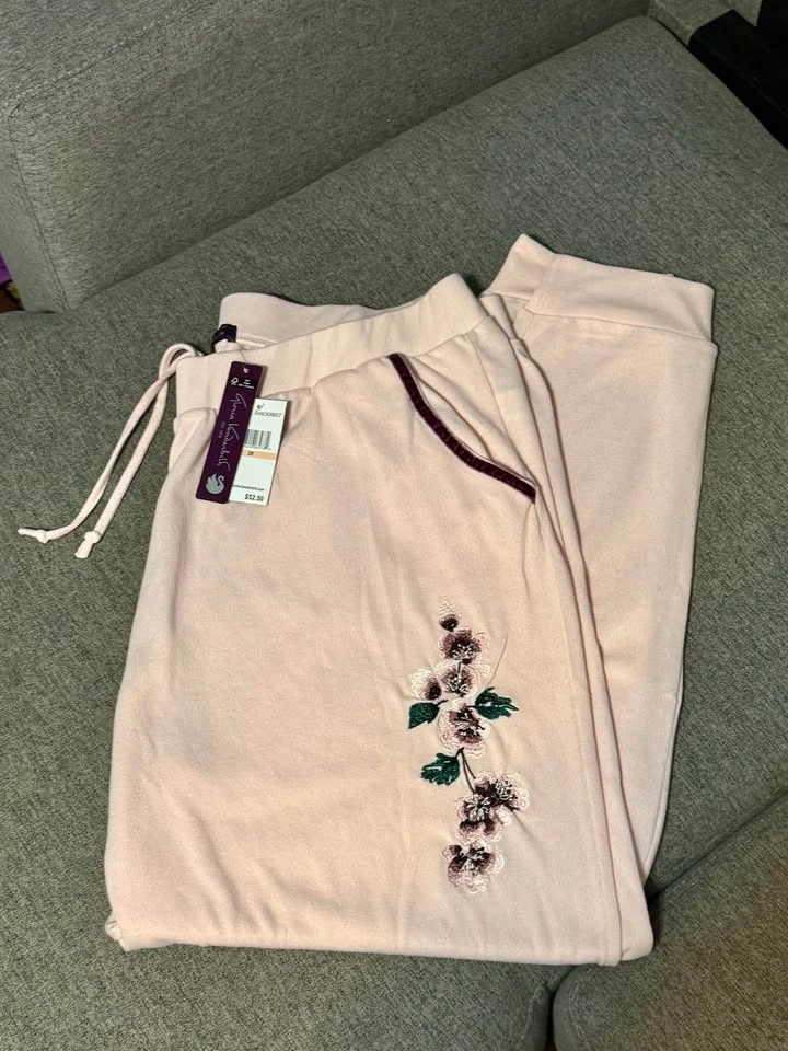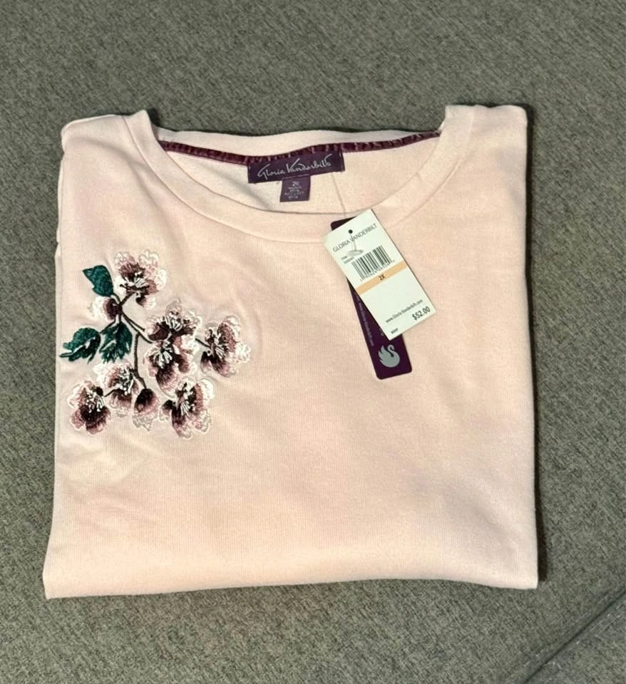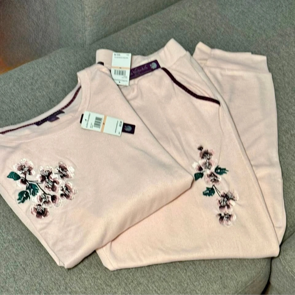 Brand new with tags. Gloria Vanderbilt 2 piece lounge set. Size is 2X. Light weight and soft material. Light pink colour. Beautiful embroidered detail on top and bottoms. Porch pick up at Essa Road and Innisfil Street.