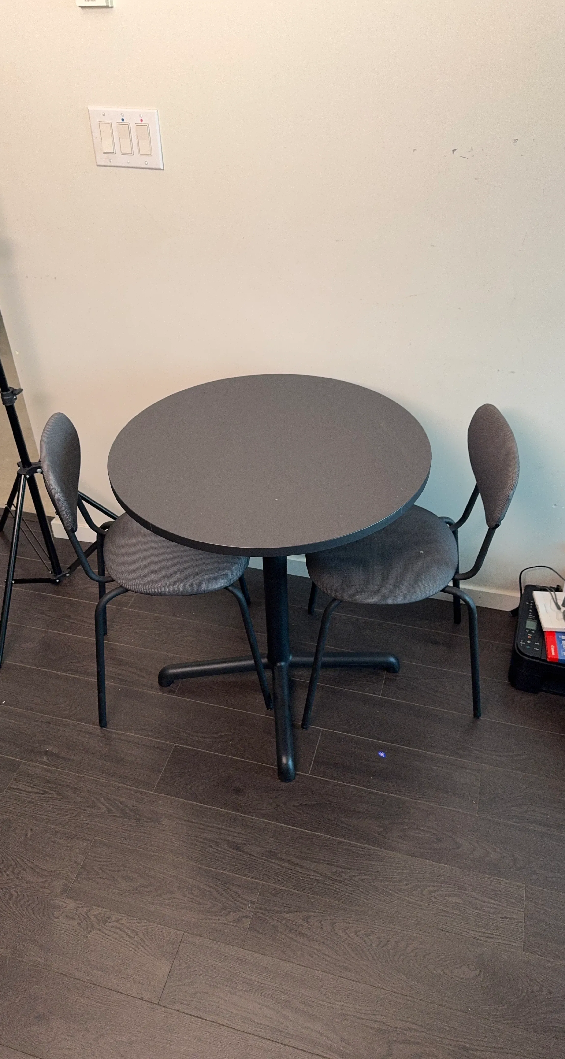 Selling a round table with two matching chairs. The set is in good condition and would be perfect for a small dining area or kitchen. The table and chairs are grey with black legs.