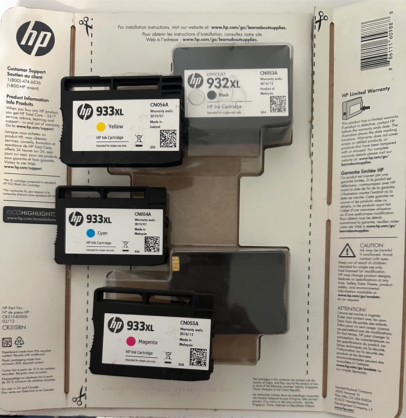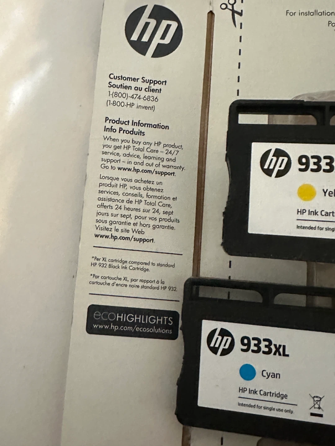 I'm selling a brand new set of HP 933XL ink cartridges. This set includes yellow, cyan, magenta, and black cartridges, all intended for single use only. Perfect for your HP printer! The box is included.