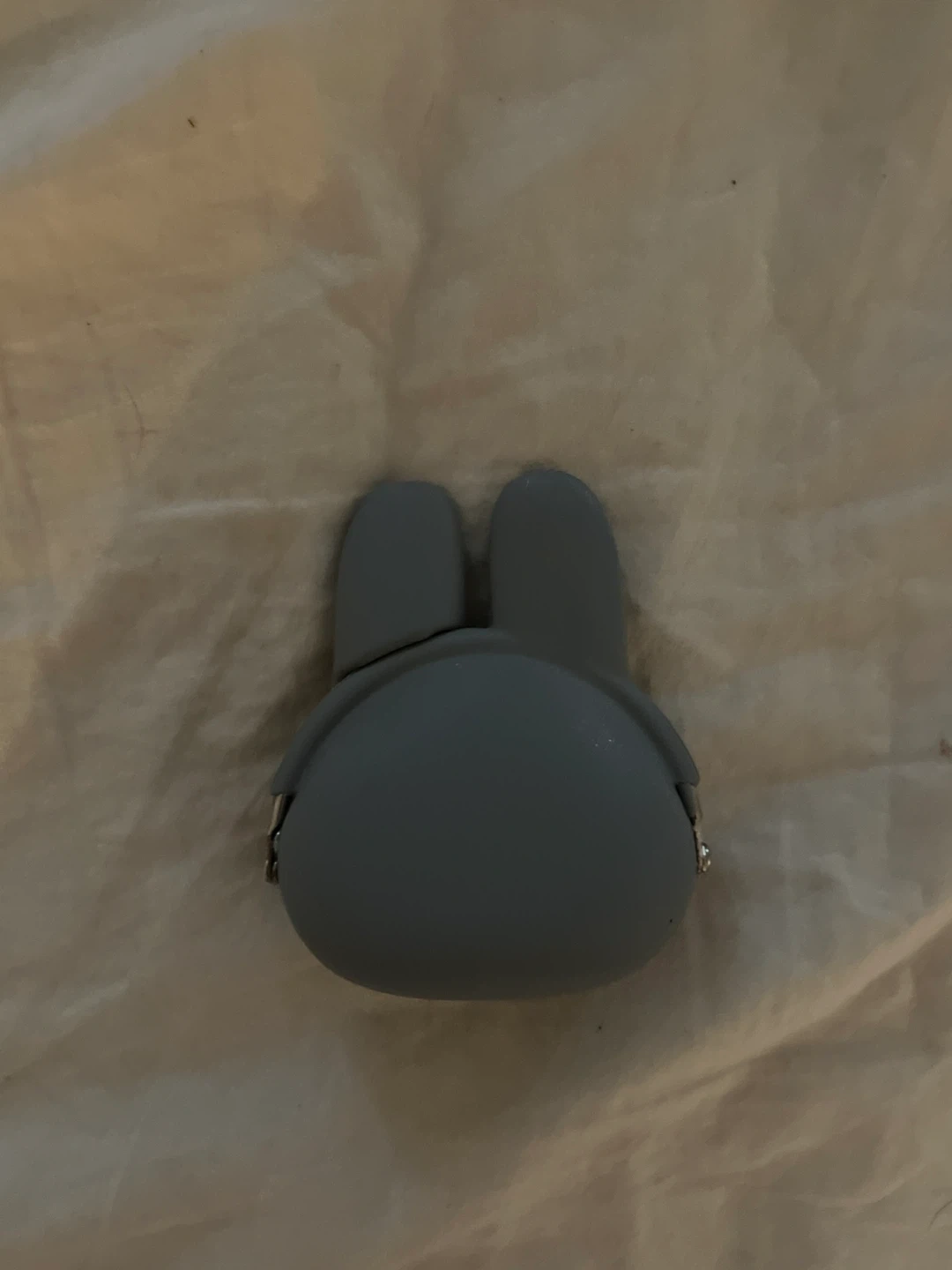 This is a super cute grey bunny coin purse! It's in great condition and perfect for holding your change or small trinkets. It has adorable bunny ears and a sweet winking face design. It's a fun and practical accessory!