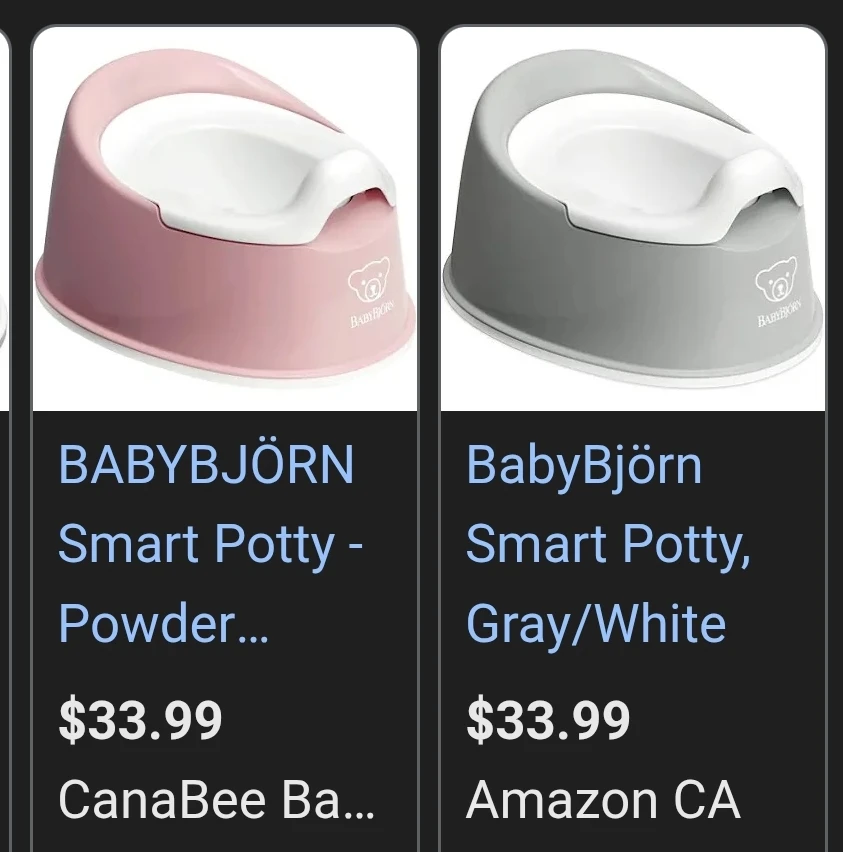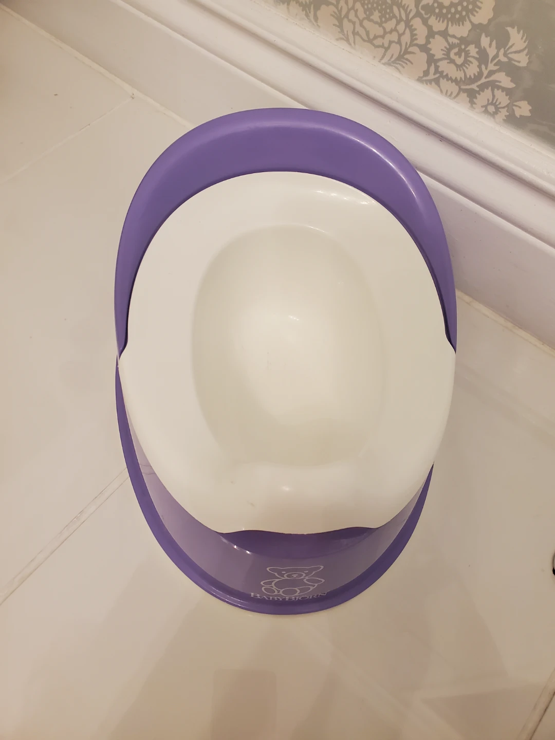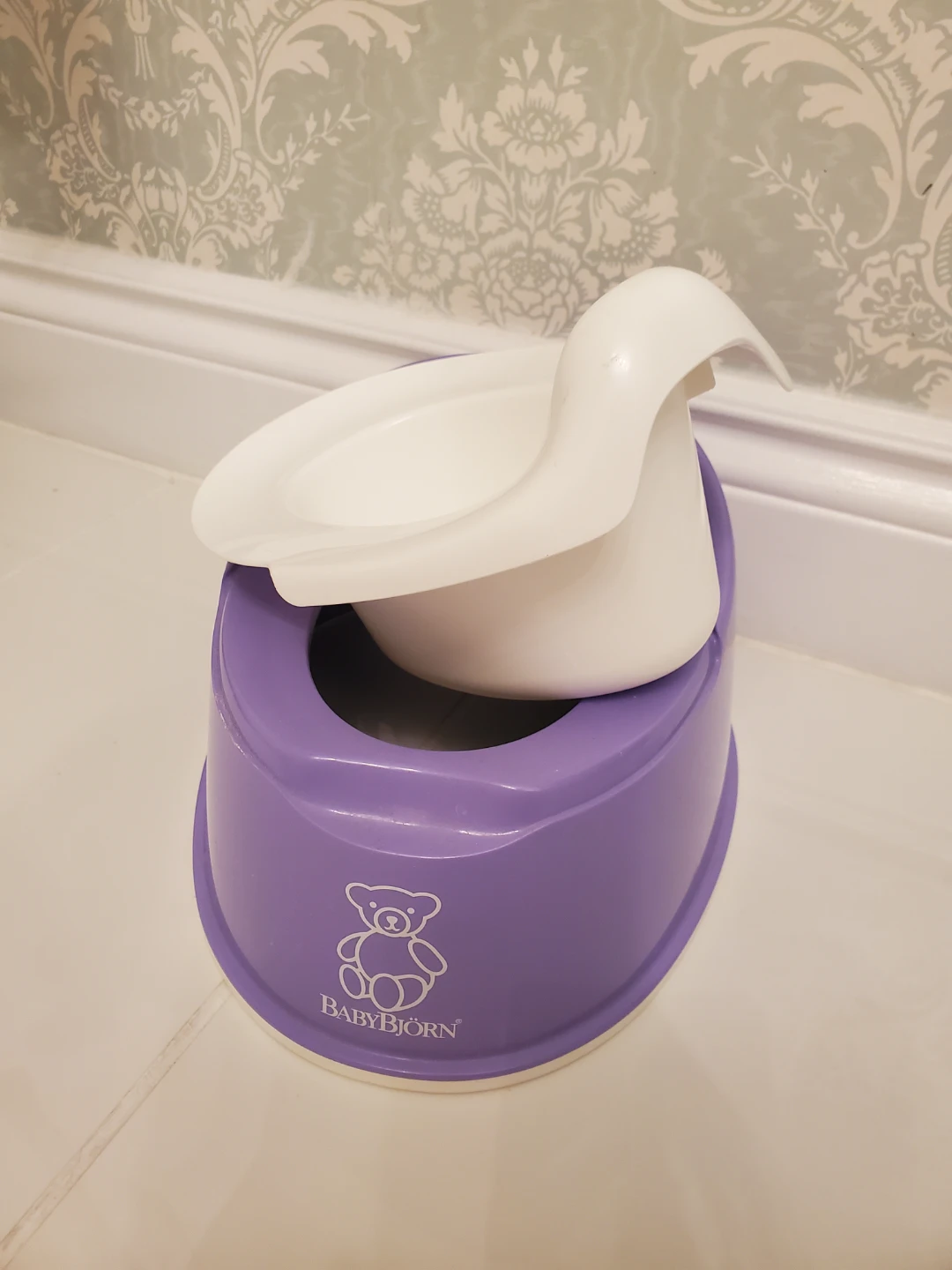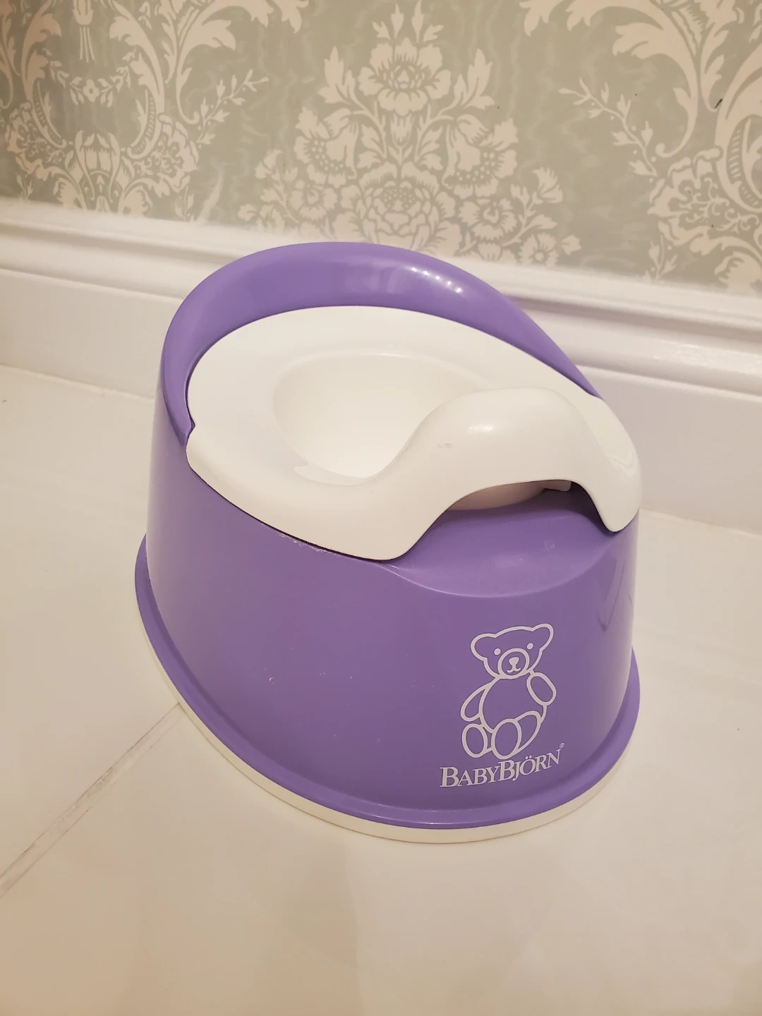 Selling a Baby Bjorn potty chair. It's a comfy and practical potty for your little one. The potty is purple and white and features the Baby Bjorn bear logo.