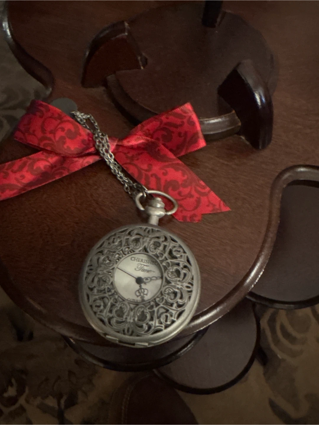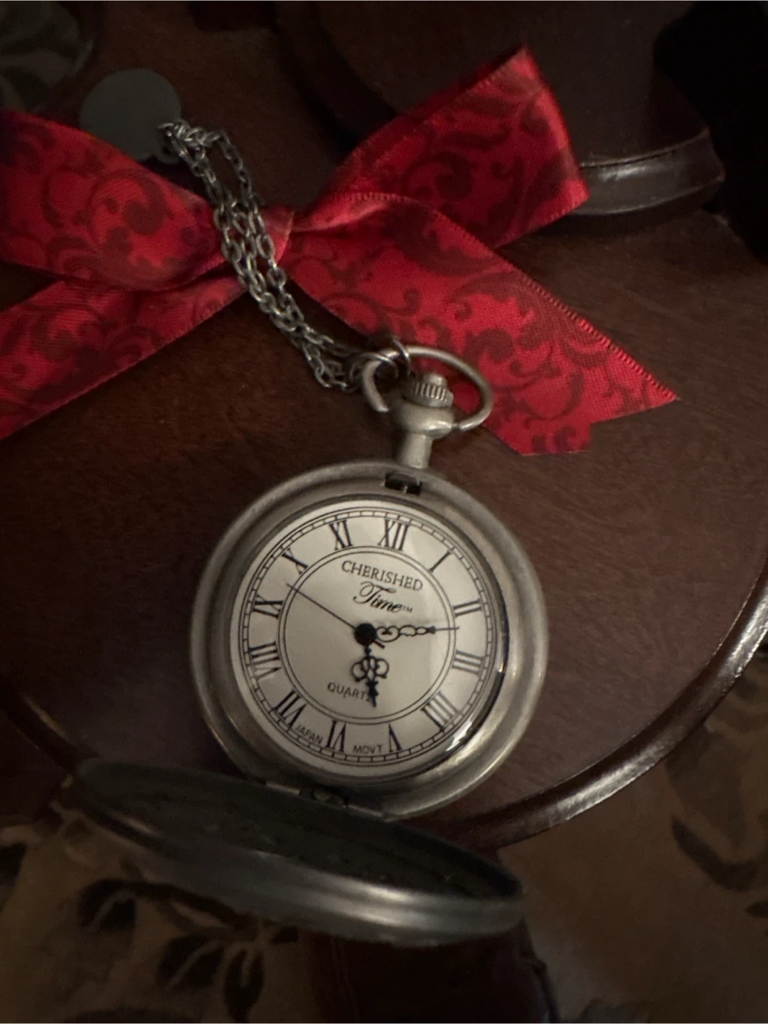 #Gifting This is a lovely Cherished Time pocket watch with a decorative design. It has a chain and a red bow attached. The watch face is classic with Roman numerals. It's in great condition and ready to add a touch of vintage charm to your style needs a new battery