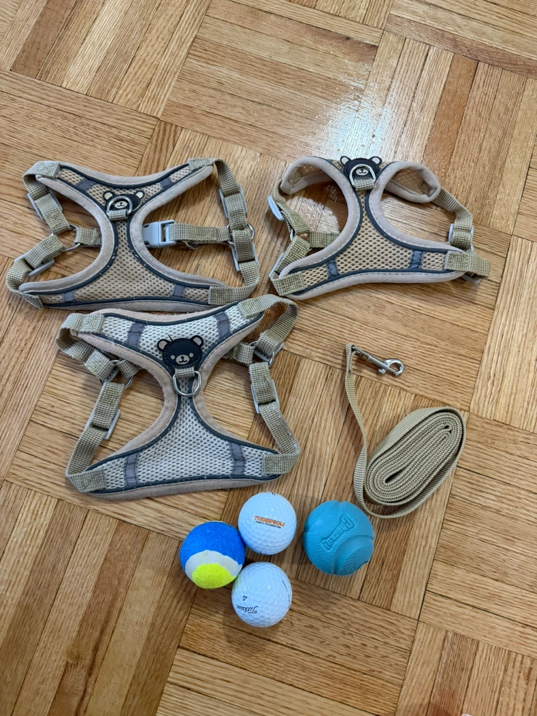 set of three dog harnesses(1 is new) and some balls(new). The harnesses appear to be in good condition and have a cute bear design. Included are a leash and a few balls for fetch!