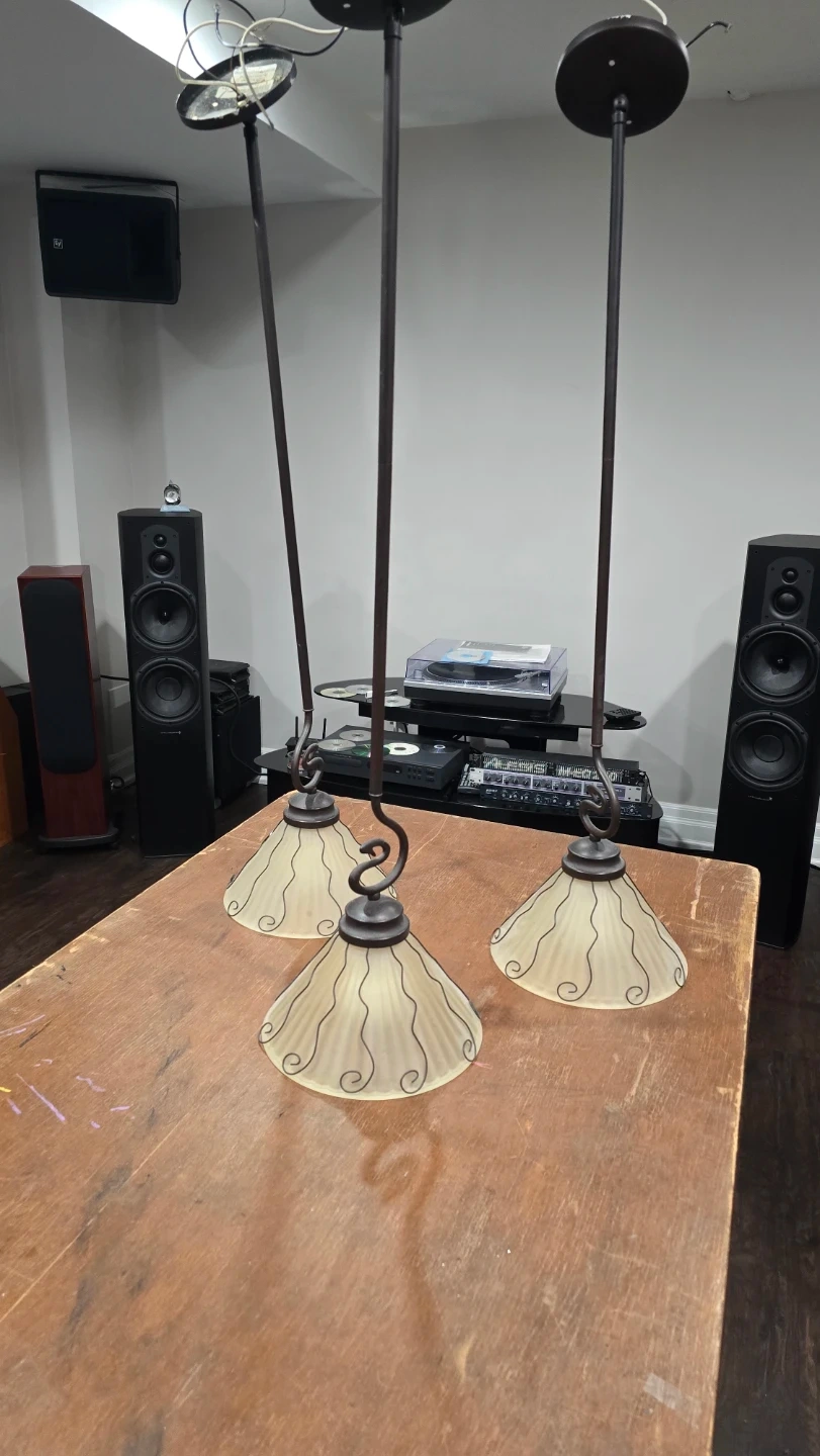 Here's a hanging pendant light fixture with three lights! It would look great above a dining table or kitchen island. The shades are a frosted glass with a decorative swirl design. It's in good condition and ready to brighten up your space