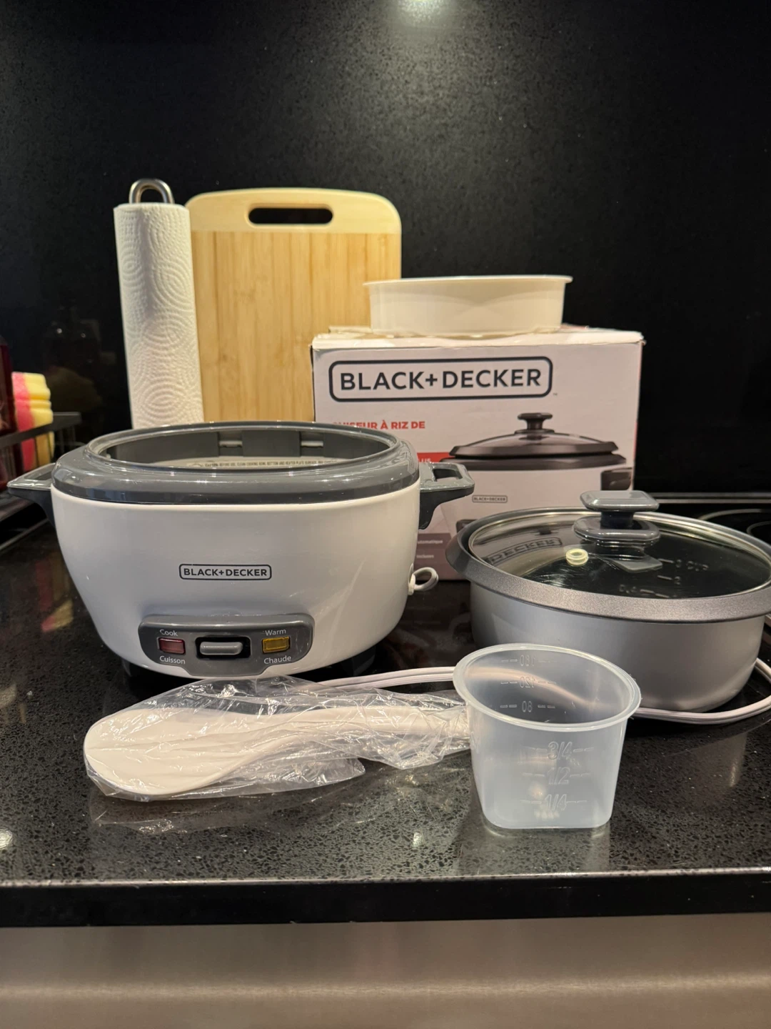 Black+Decker rice cooker that can cook up to 6 cups of rice. It comes with all the components, including the inner pot, lid, measuring cup, and rice paddle. The box is also included!