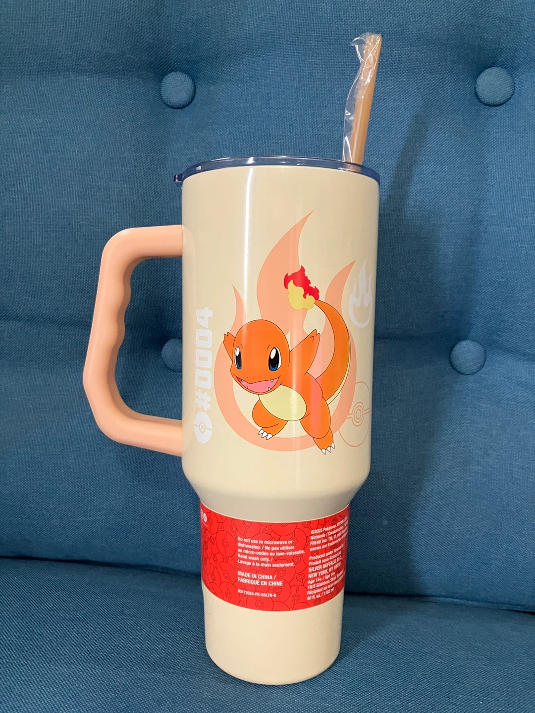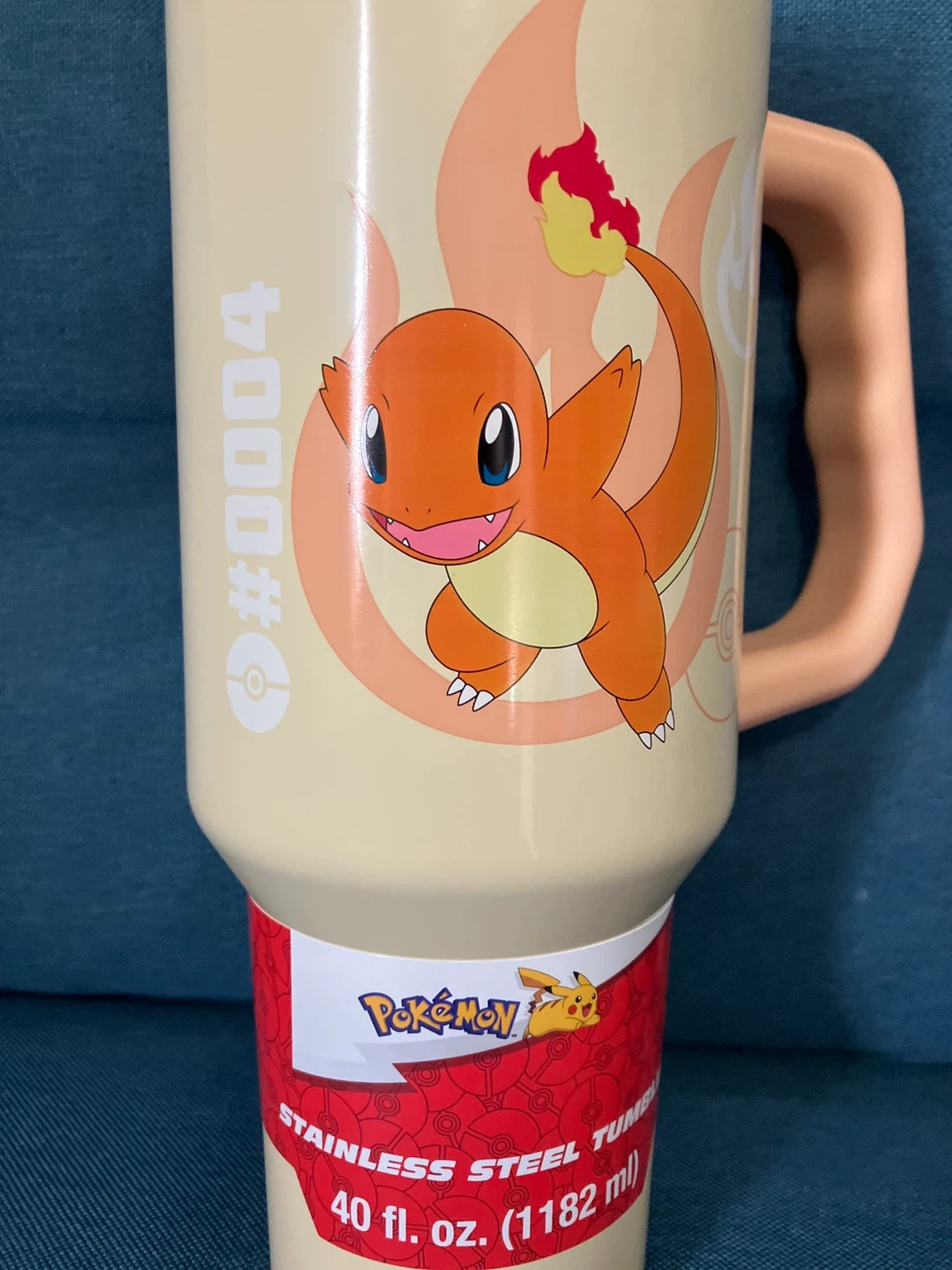 Pokémon stainless steel tumbler featuring Charmander! It holds 40 fl oz (1182 ml),