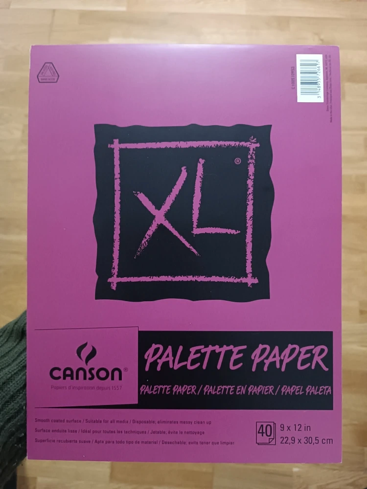 Selling a Canson XL Palette Paper pad. It's sized at 9 x 12 inches (22.9 x 30.5 cm) and contains 38 sheets (initially 40 sheets but two were used). It features a smooth coated surface suitable for all media and is disposable for easy cleanup!