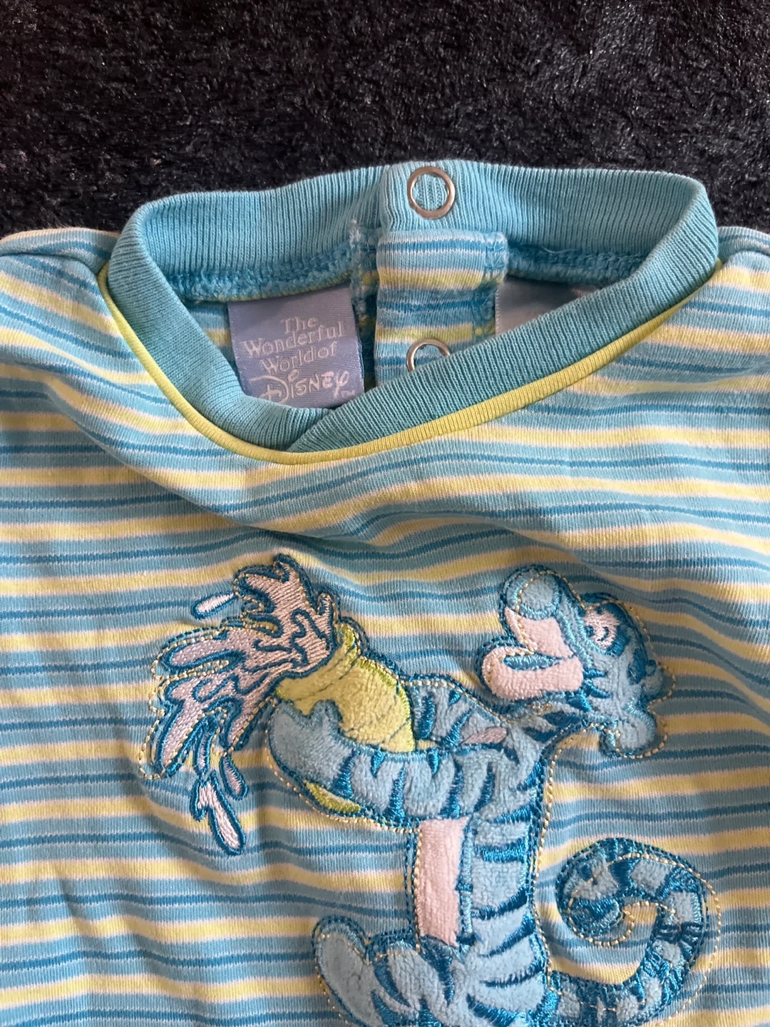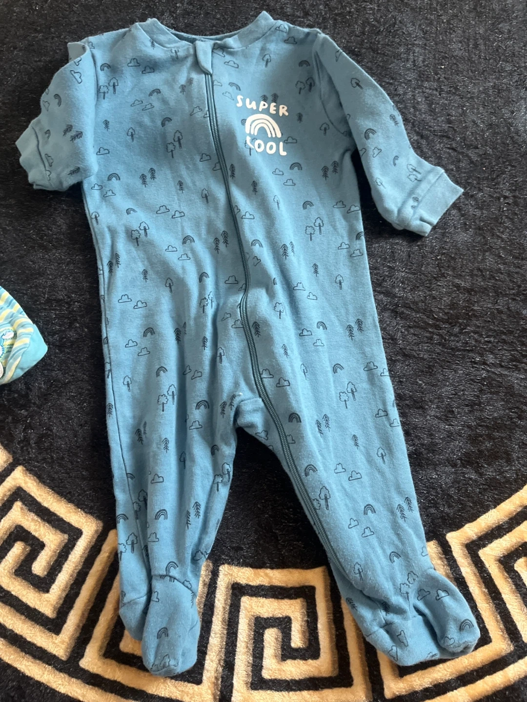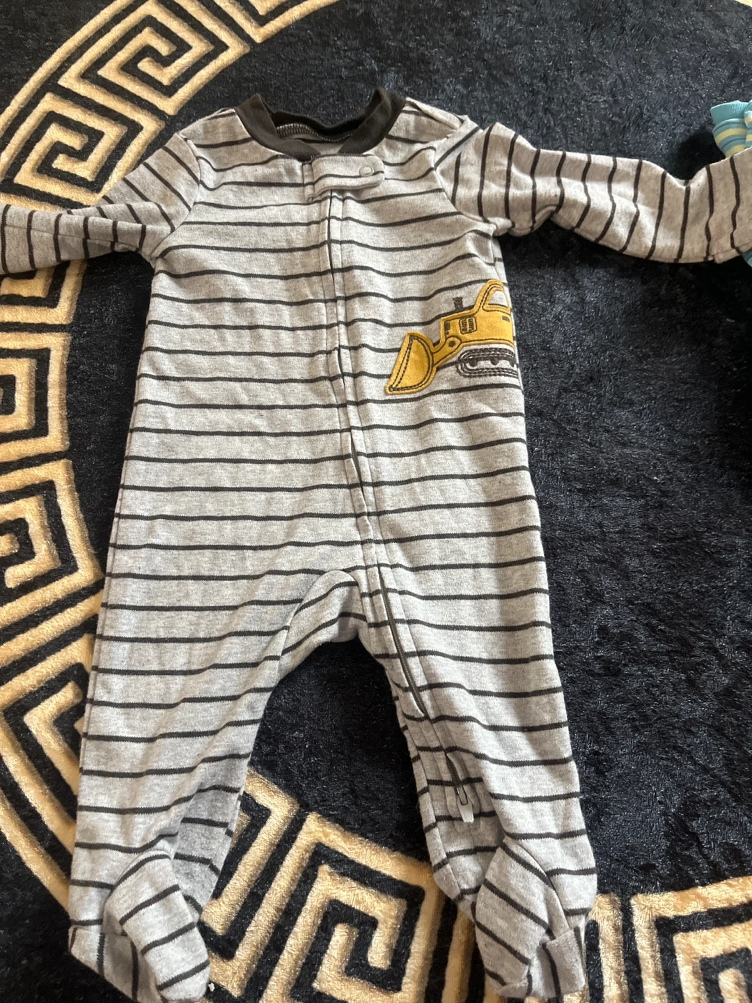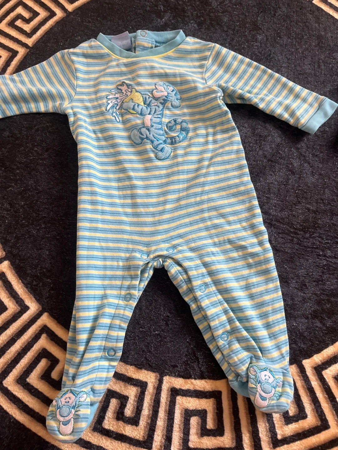 A few baby sleepers for sale! One is a Disney sleeper with Tigger on it. The other is a blue sleeper with a rainbow design and a grey striped sleeper with a bulldozer.